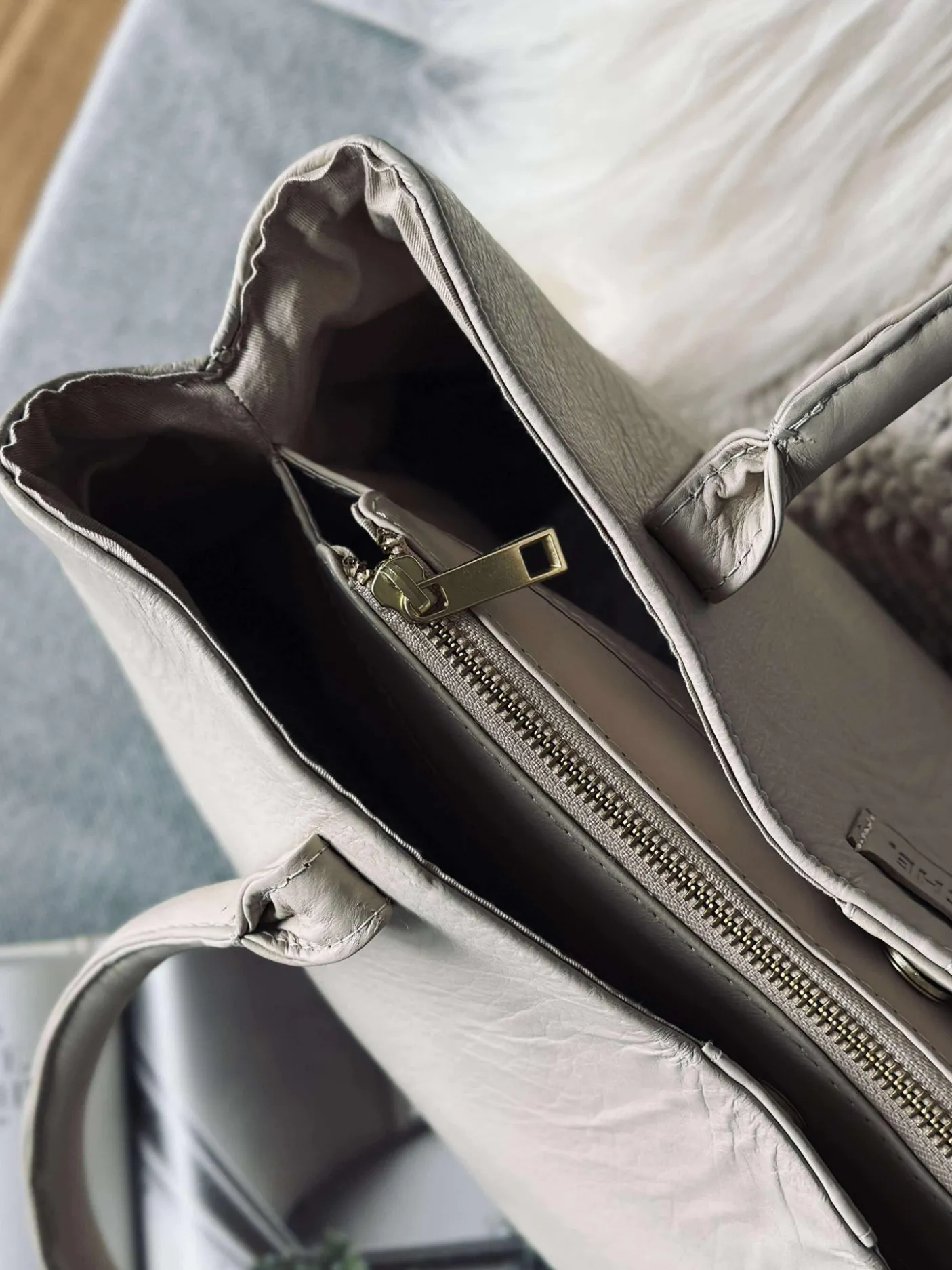 Tasken er opdelt i 3 sektioner, to med magnetisk knaplukning og en med lynlås.