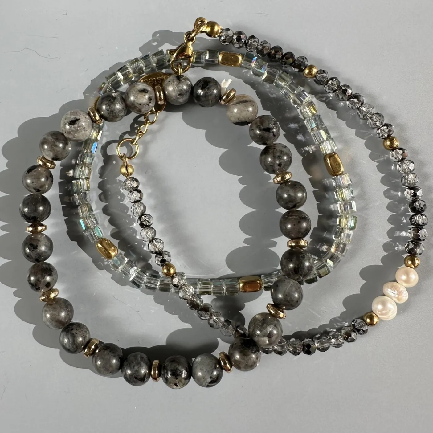 De tre små fine perler i midten er ægte ferskvandsperler. Et sæt med tre armbånd til en stærk pris.