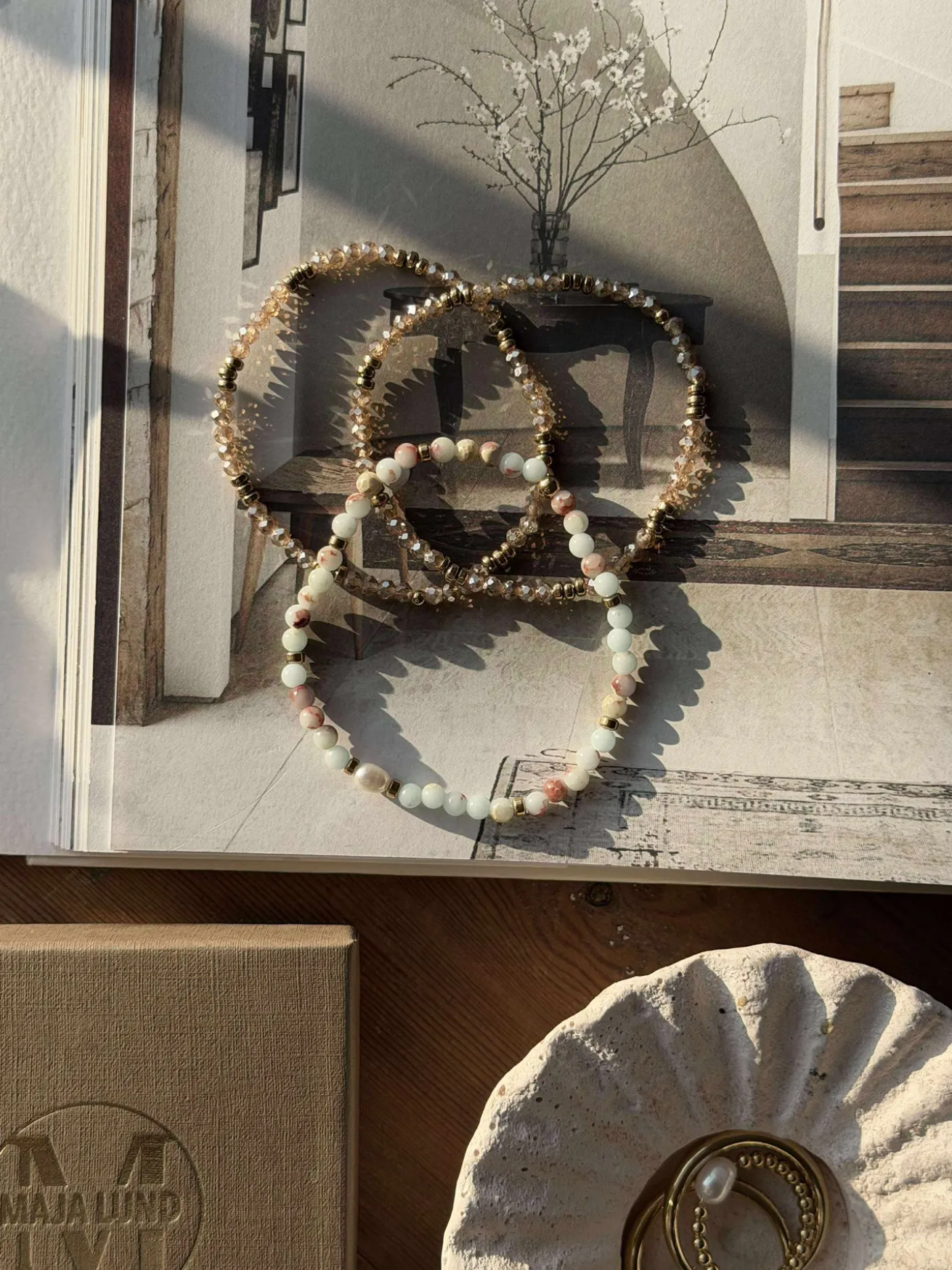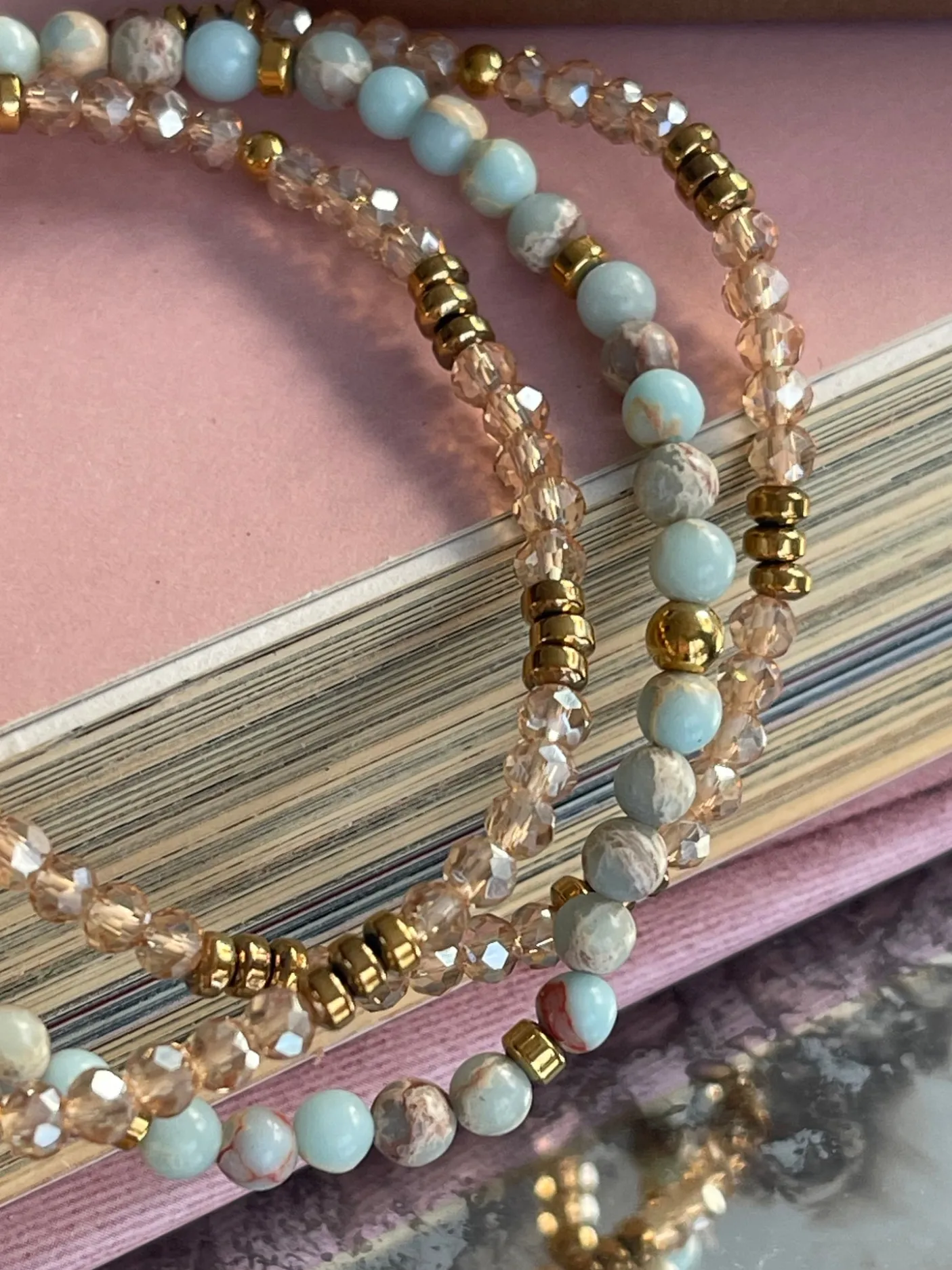 - 1 x Naturstens-armbånd i aqua og natur toner og med ferskvandsperle