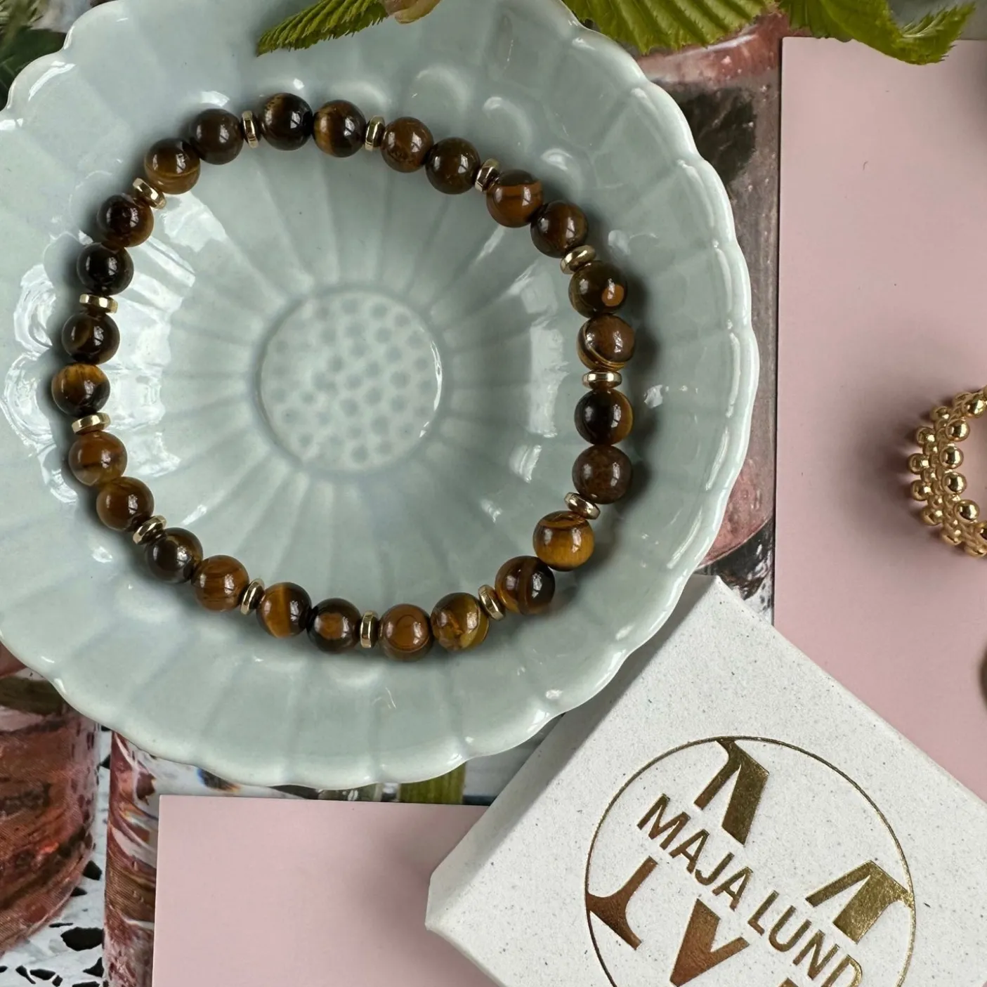 Smukt armbånd i unikke natursten og guldbelagte perler.