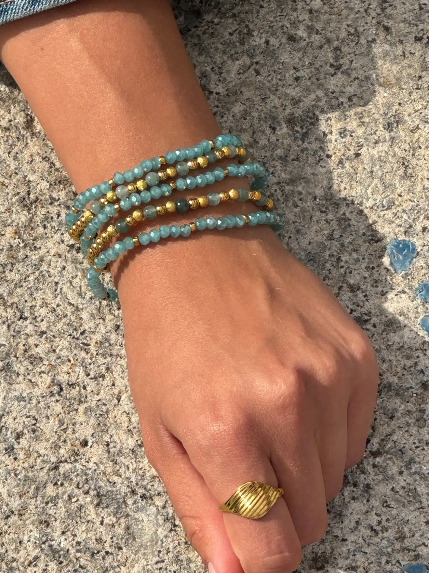 De små armbånd er med 3mm facetterede sten, de to andre er udført i rustfrit stål og med 4mm naturstens-perler i.