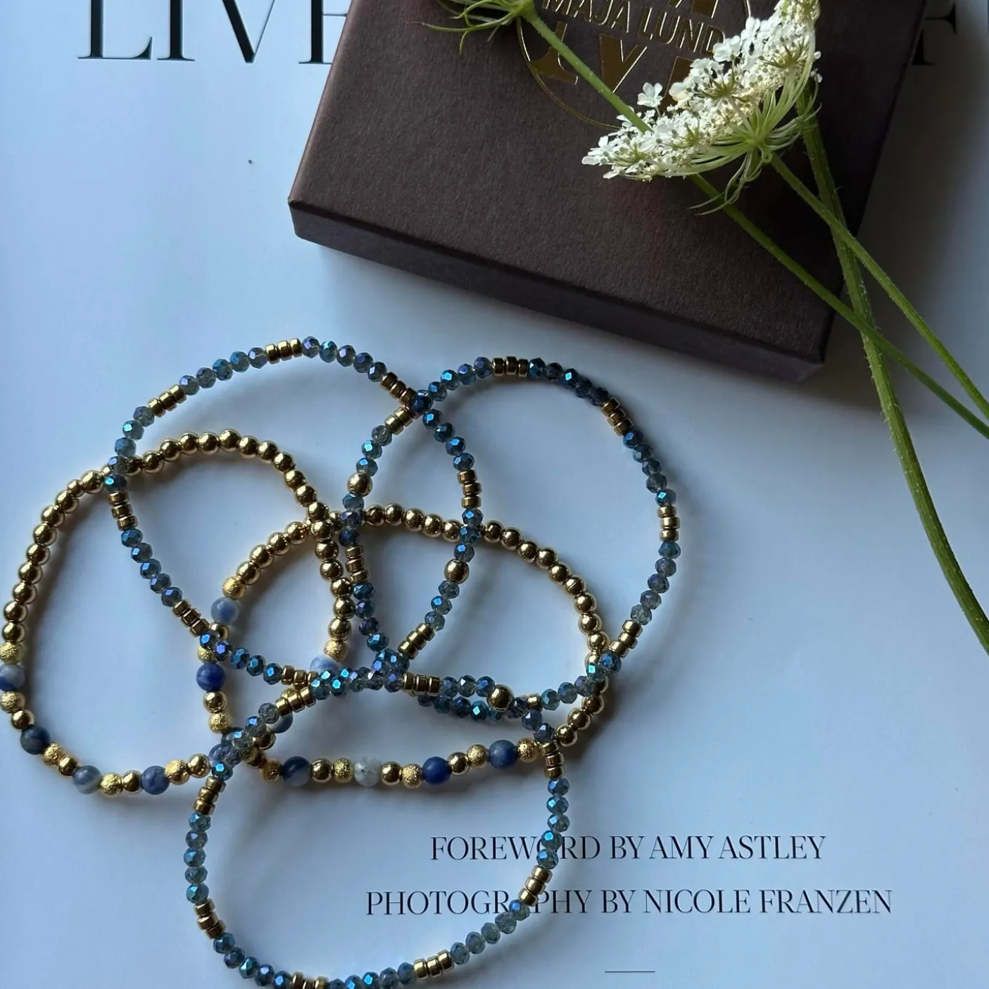 De små armbånd er med 3mm facetterede sten, de to andre er udført i rustfrit stål og med 4mm naturstens-perler i.