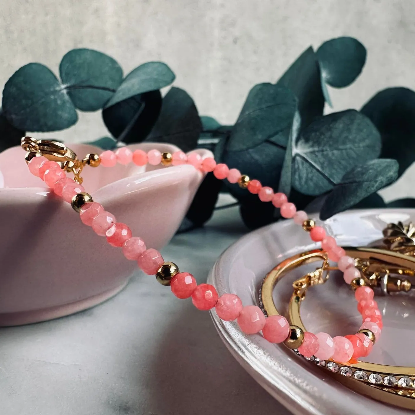 De små pink sten er feminine og smukke at matche med fx ferskvands-perlearmbånd eller andre sten-armbånd.
