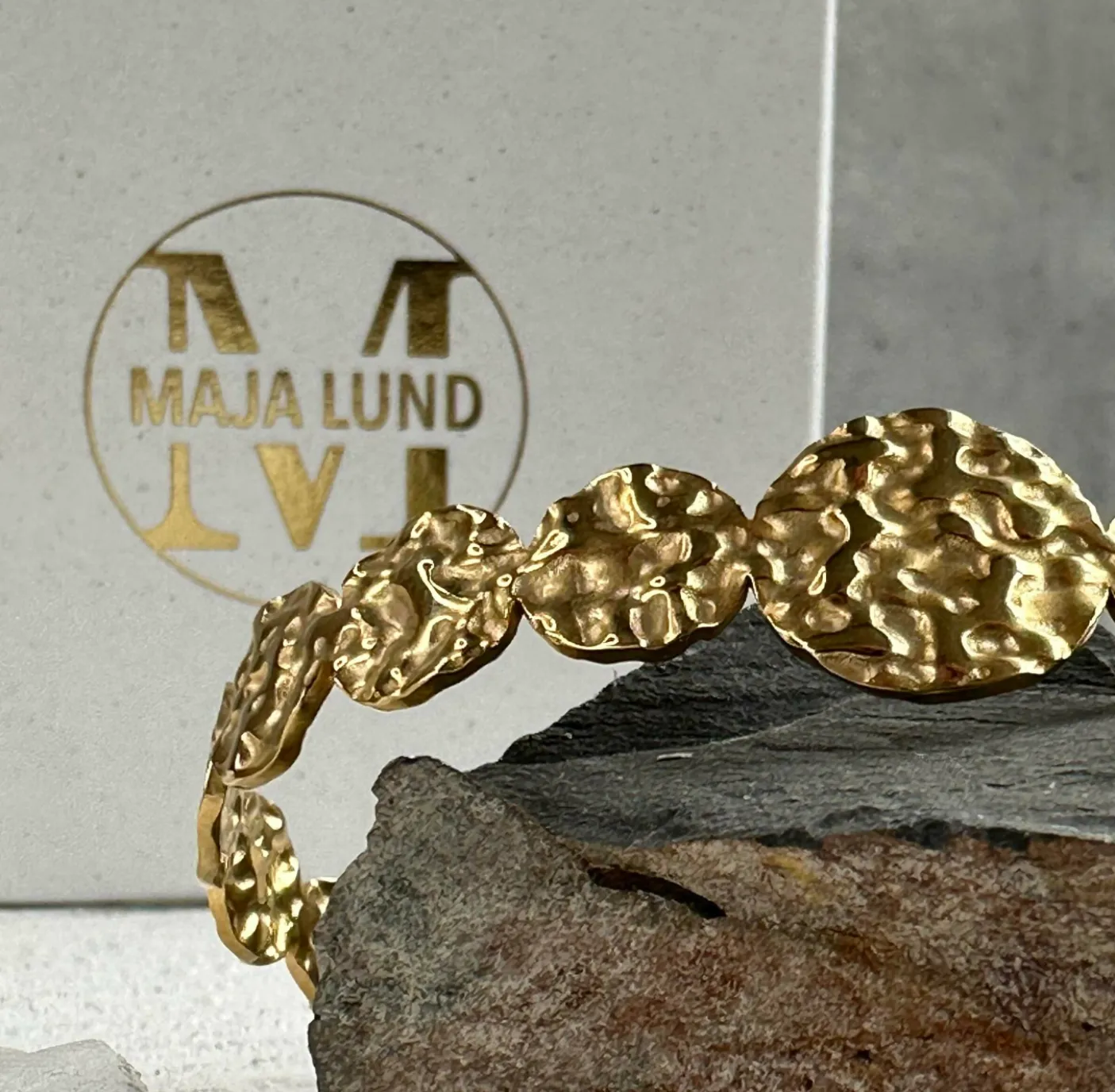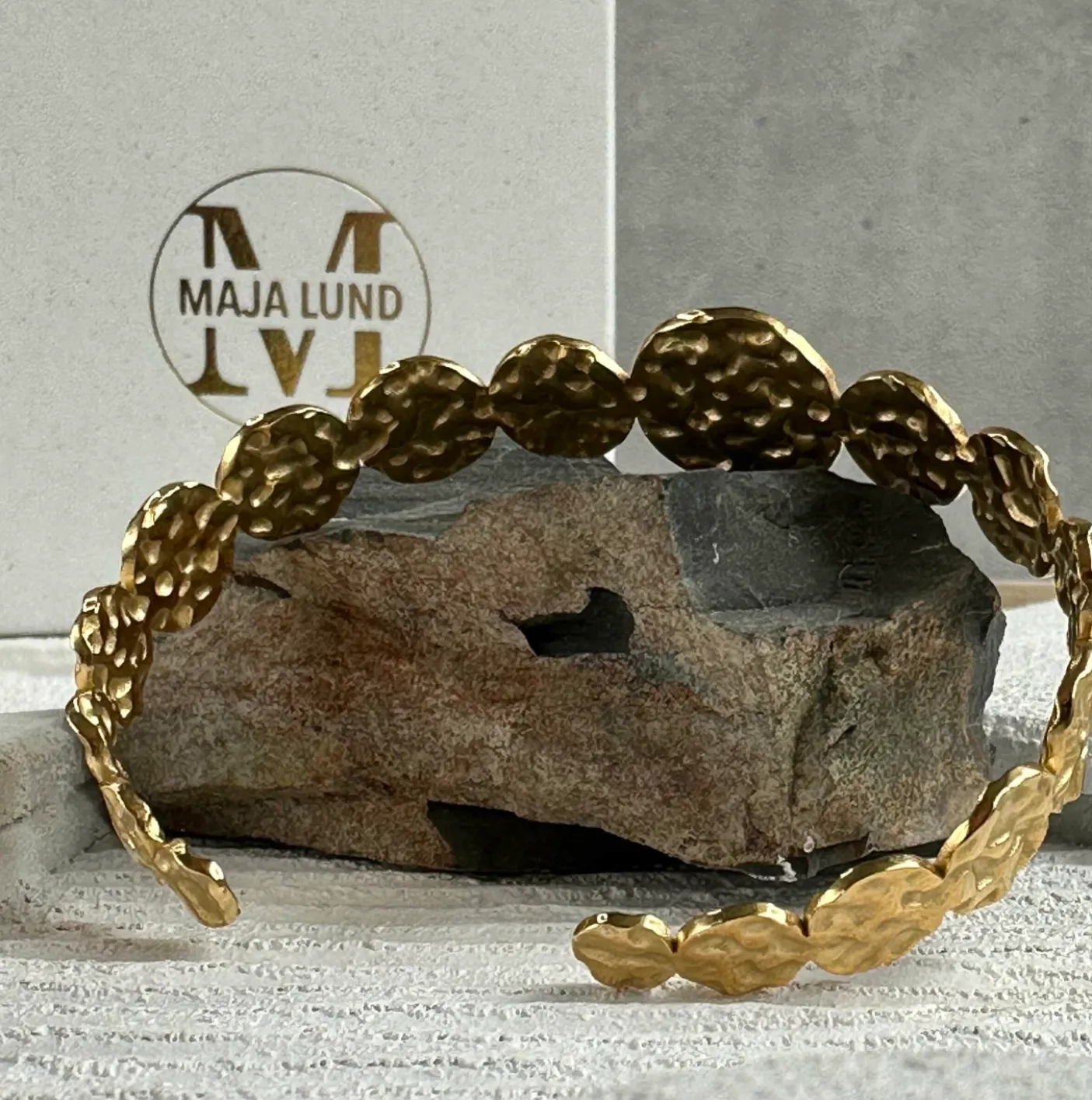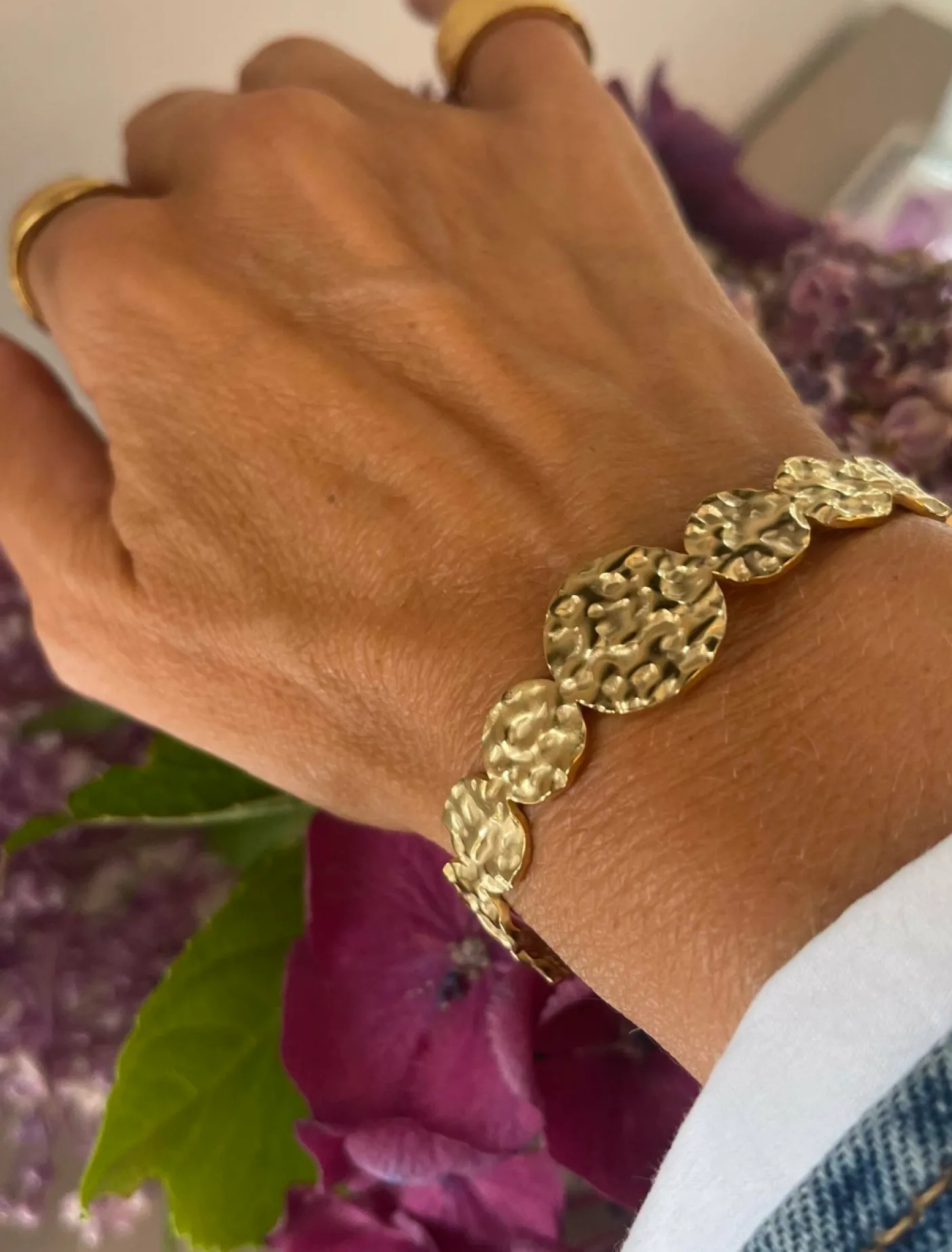 Armbåndet er super fint til et hverdagsoutfit, men kan selvfølgelig også bruges til et festligt outfit. Dets markante silhuet fungerer som et tydeligt, guldfarvet element i både afslappede og mere opede looks.
