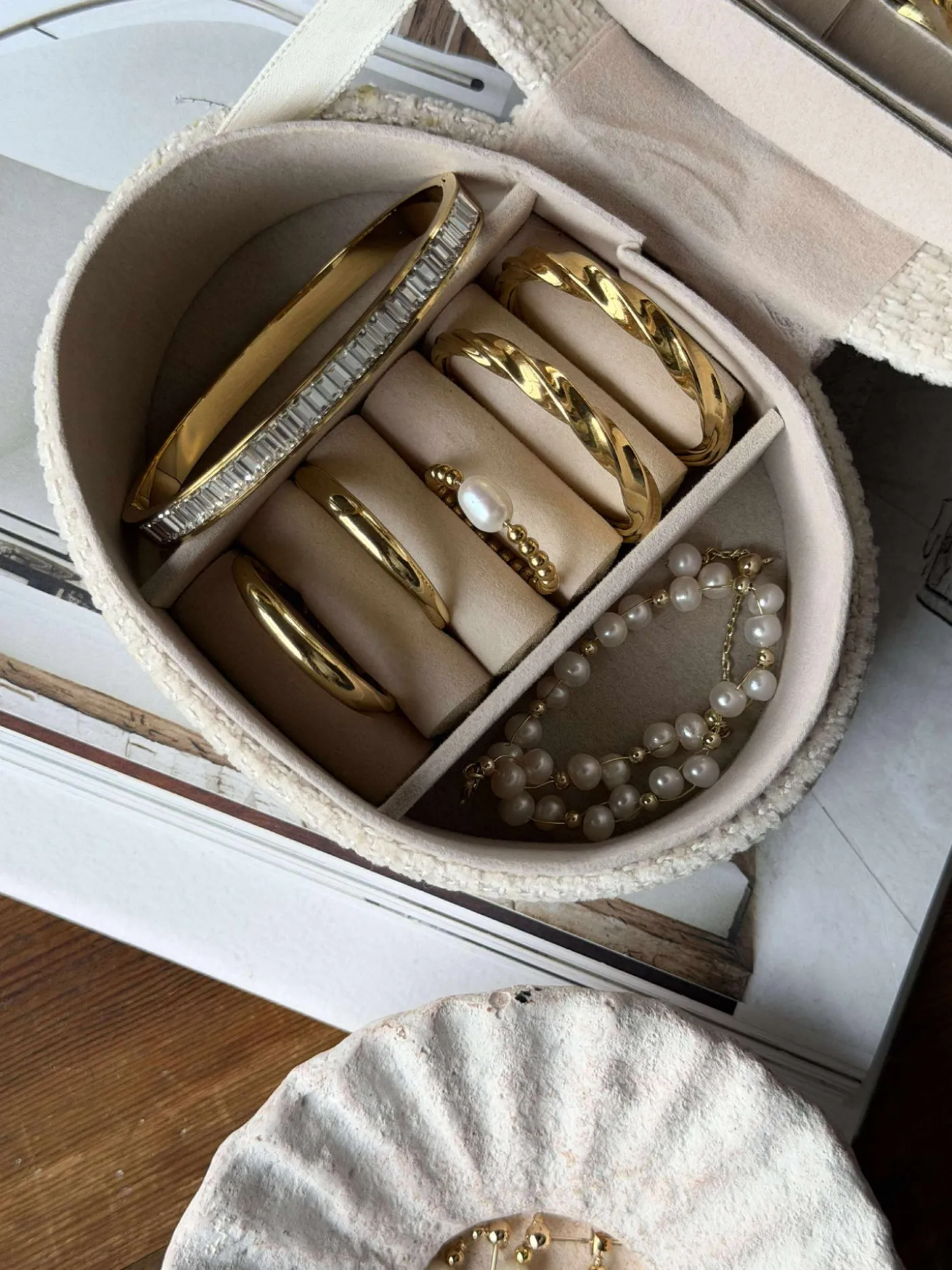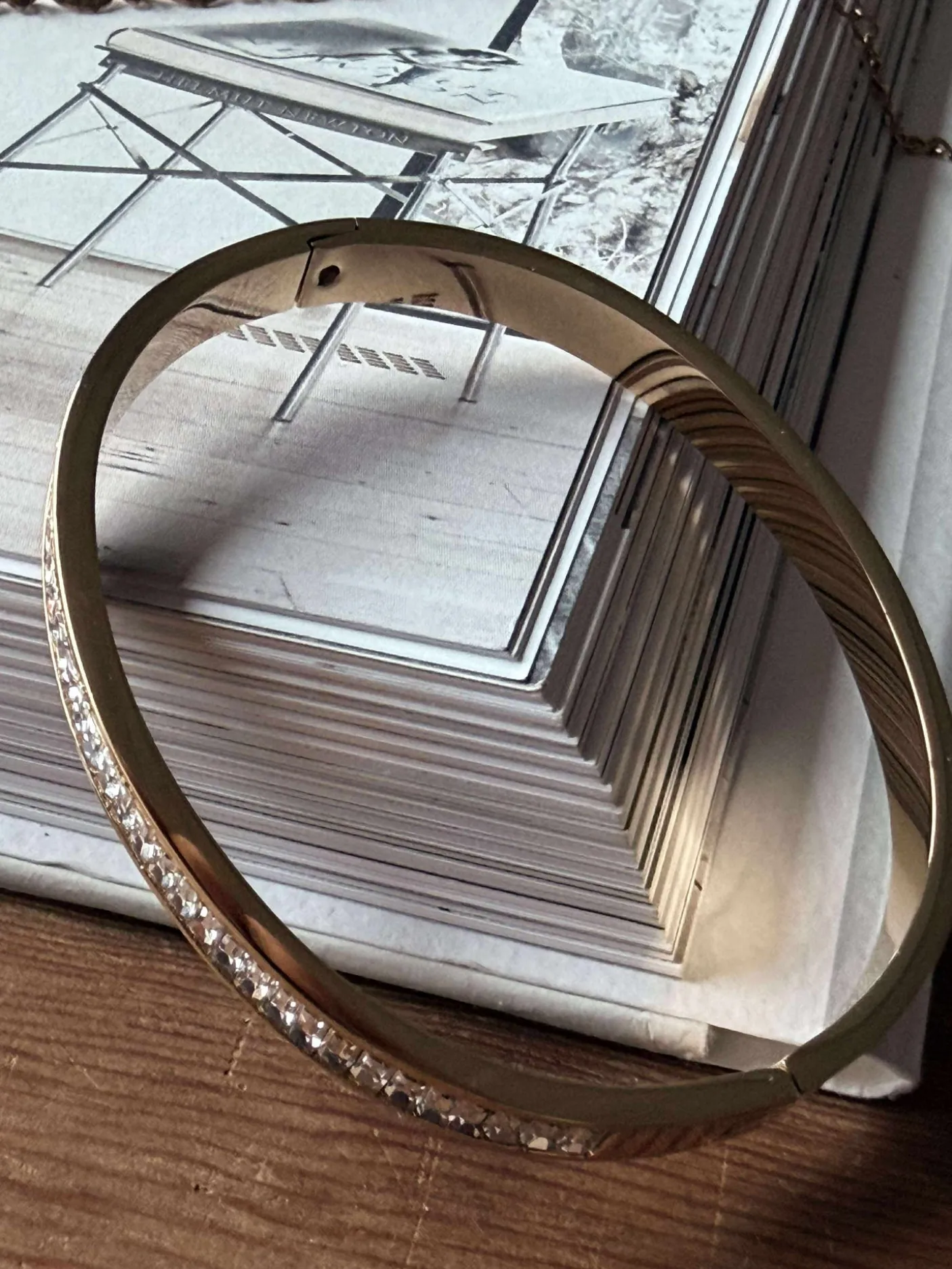 Materialet er rustfrit stål med 18K forgyldning, hvilket giver armbåndet den gule metaltone og et ensartet look.