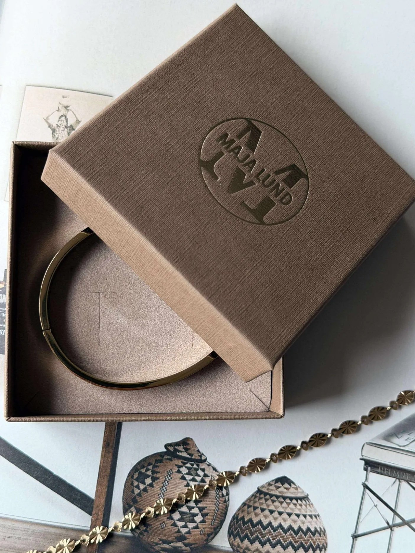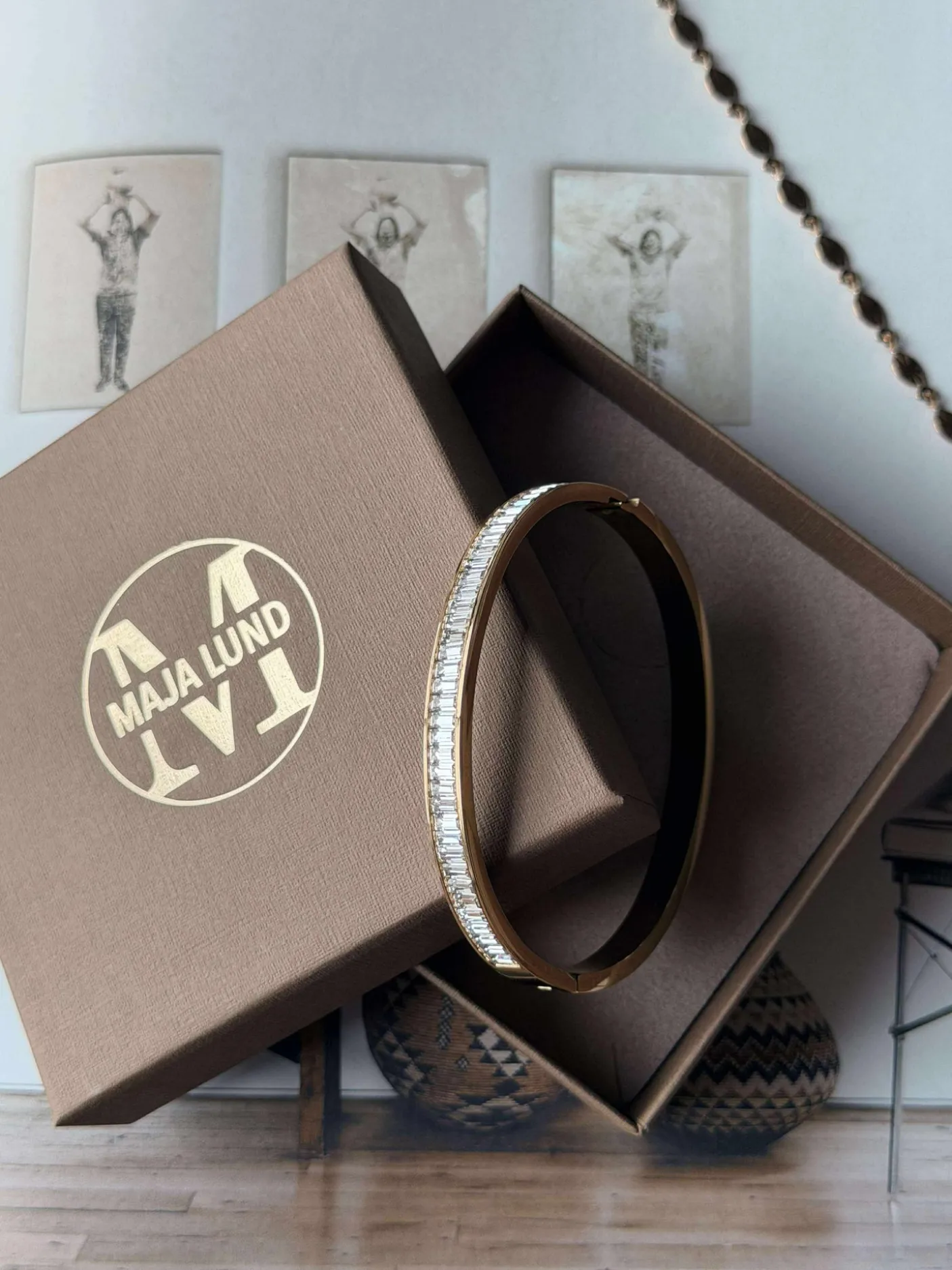 Armring FILUCA forgyldt er et kraftigt bangle armbånd med et klart, ensfarvet guldudtryk. Armbåndet har en indvendig diameter på 60 mm og en smal bredde på 0,5 cm. I bredden er der isat baguette CZ sten, som tilføjer et præcist, geometrisk snit. Produktet leveres præsenteret i en gave-æske.