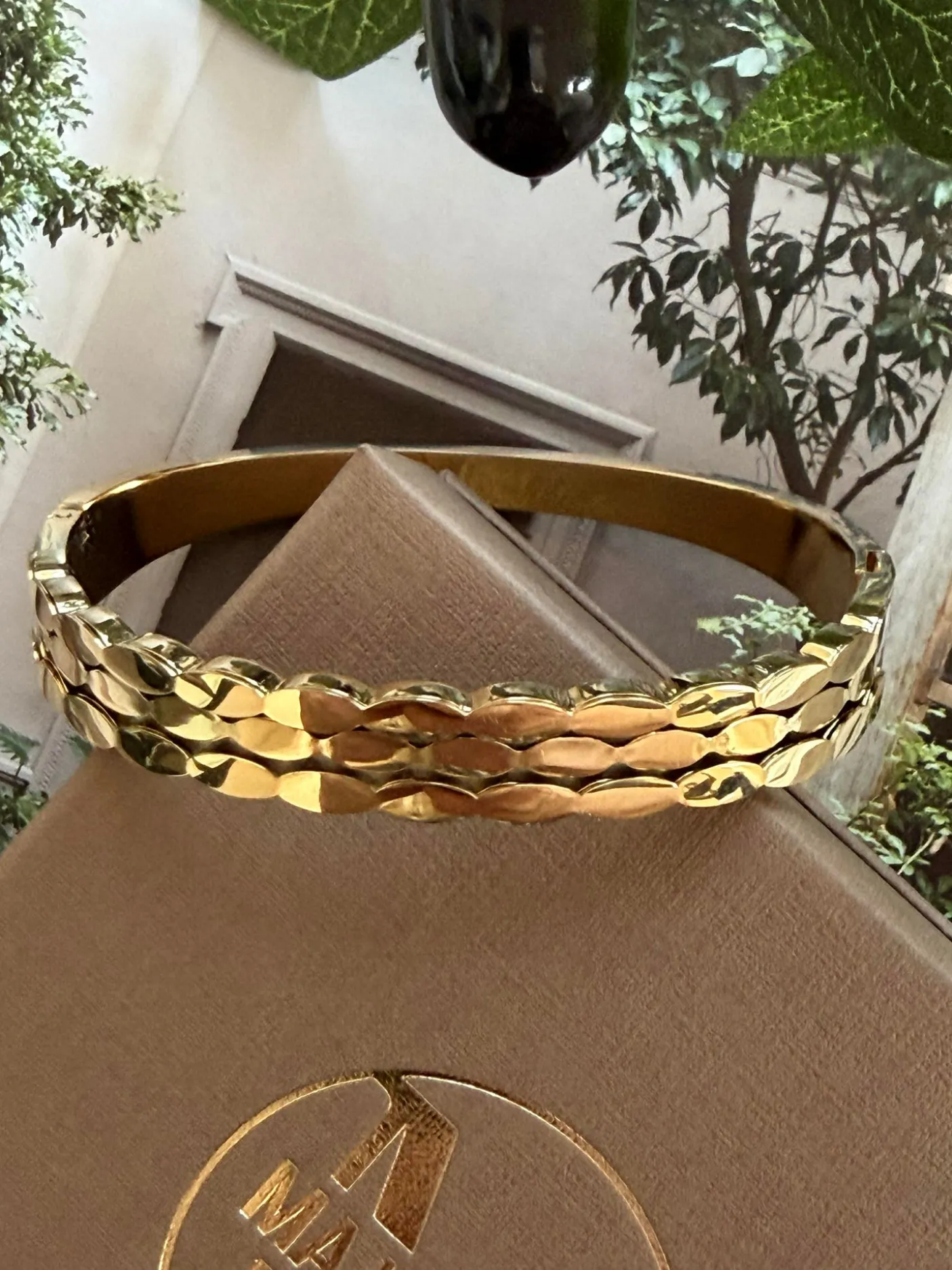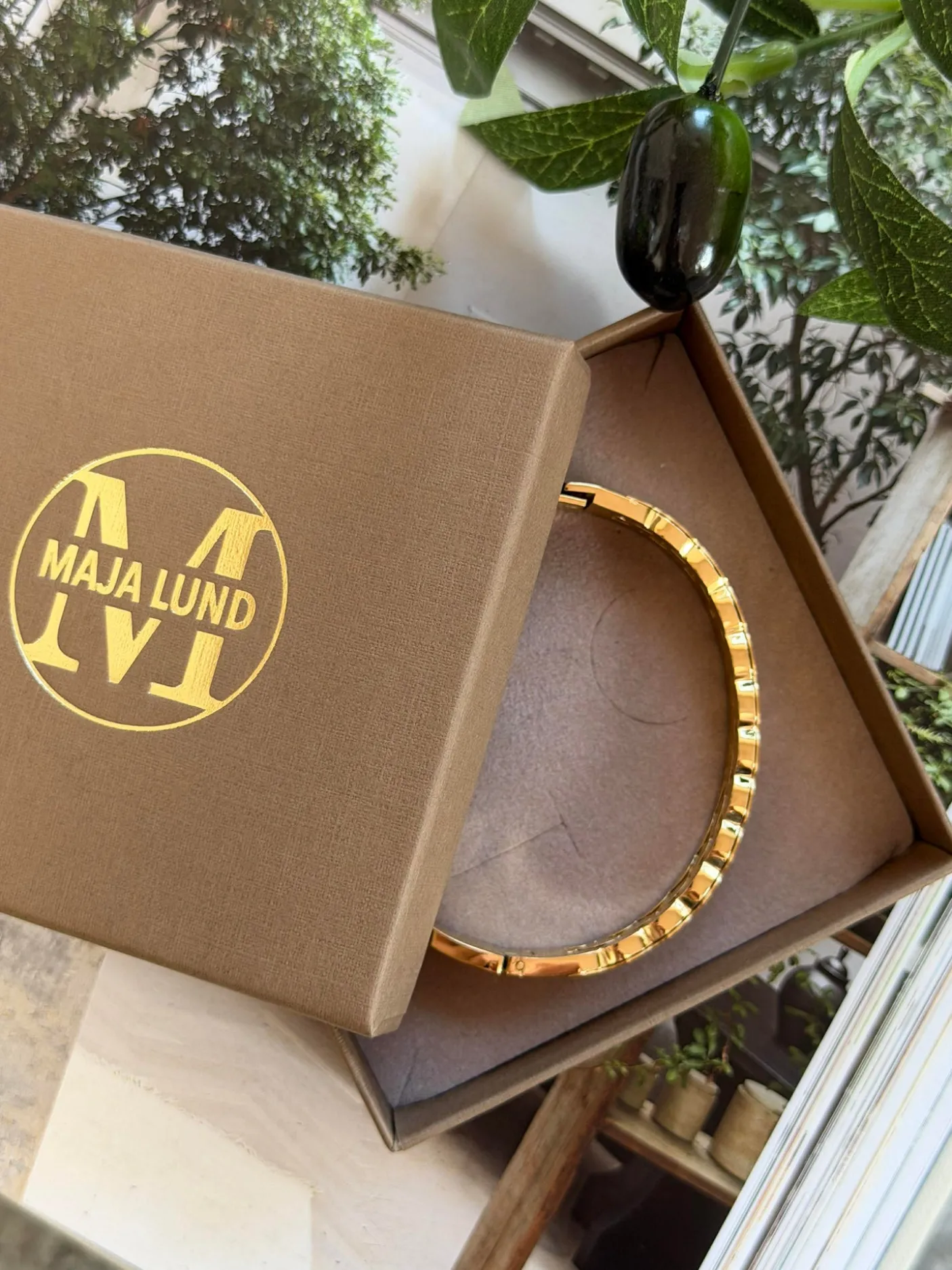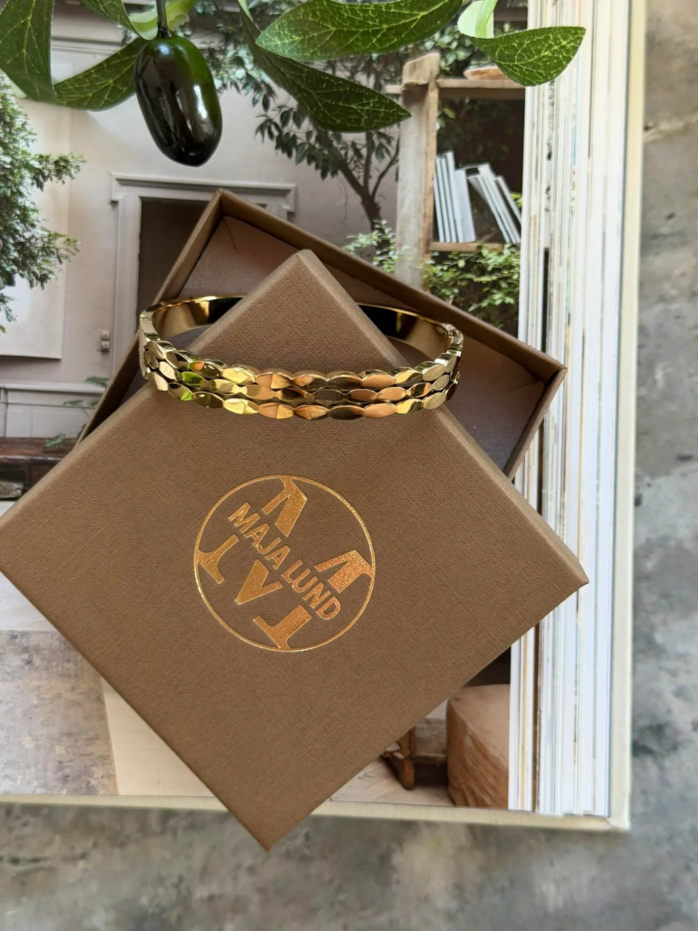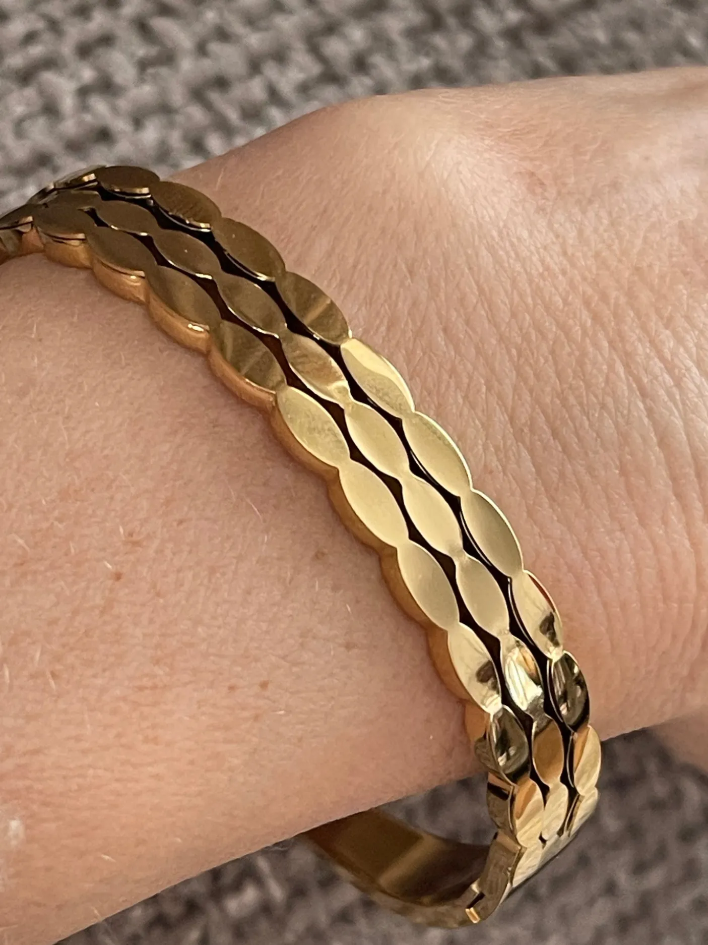 Armring LUCCIA forgyldt er et kraftigt bangle armbånd med tydelig struktur. Det er udført i rustfrit stål og 18K forgyldning og målt inden i armringen til 58 mm i diameter. Mønstret struktur giver et tekstureret og markant udtryk, og armbåndet leveres præsenteret i en gave-æske.