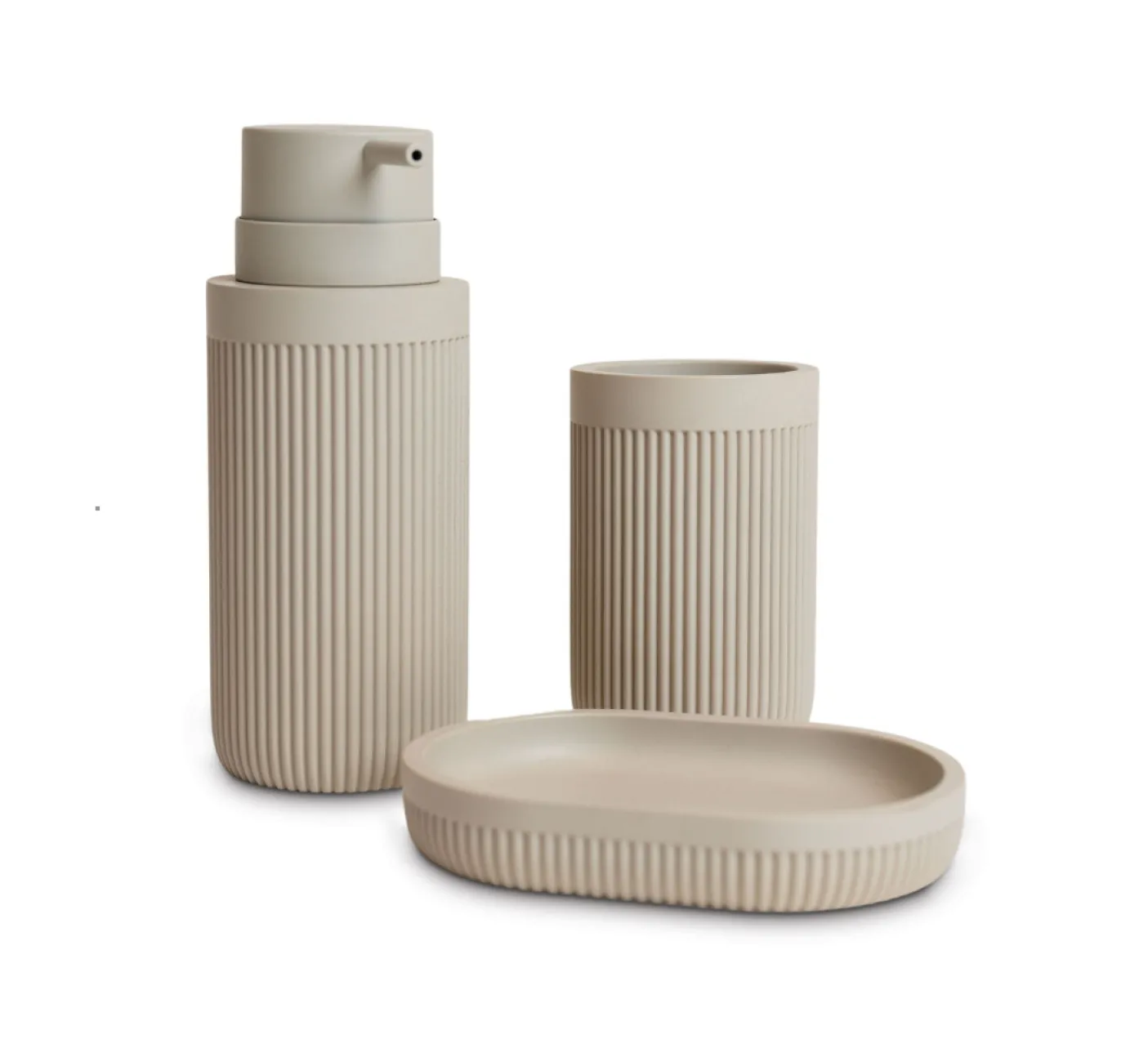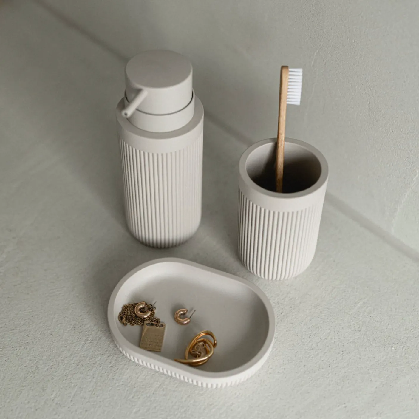 Du får 3 dele – sæbedispenser, tandbørstekrus og sæbeskål, der også kan bruges til smykker.