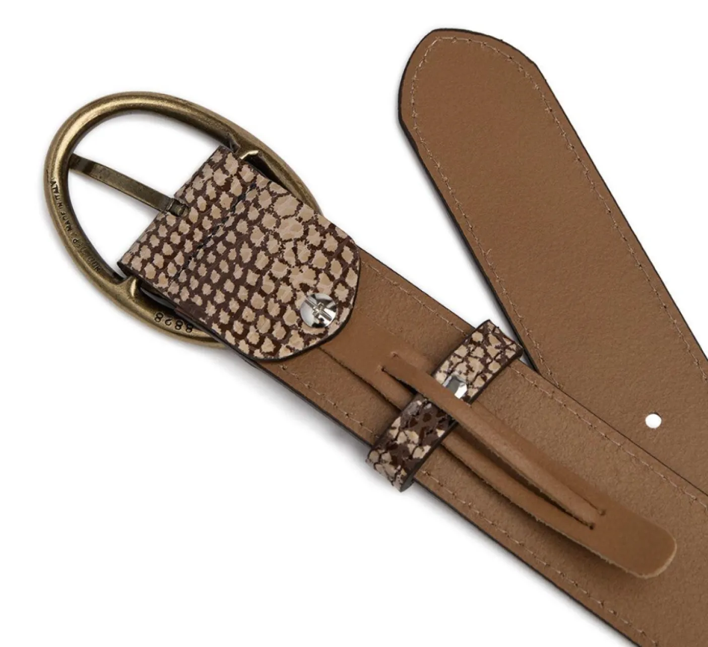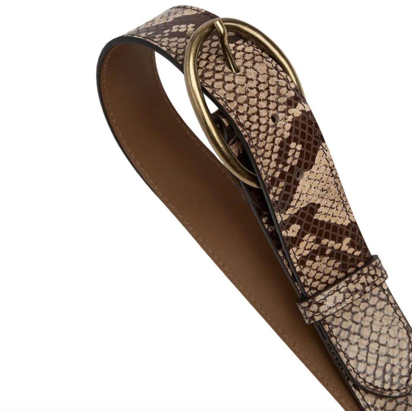 Bæltet er lavet i skind og har et printet, præget snake-mønster, som tilføjer dybde og tekstur. Kombinationen af den lyse farve og den tydelige prægning giver et eksklusivt og gennemarbejdet look.