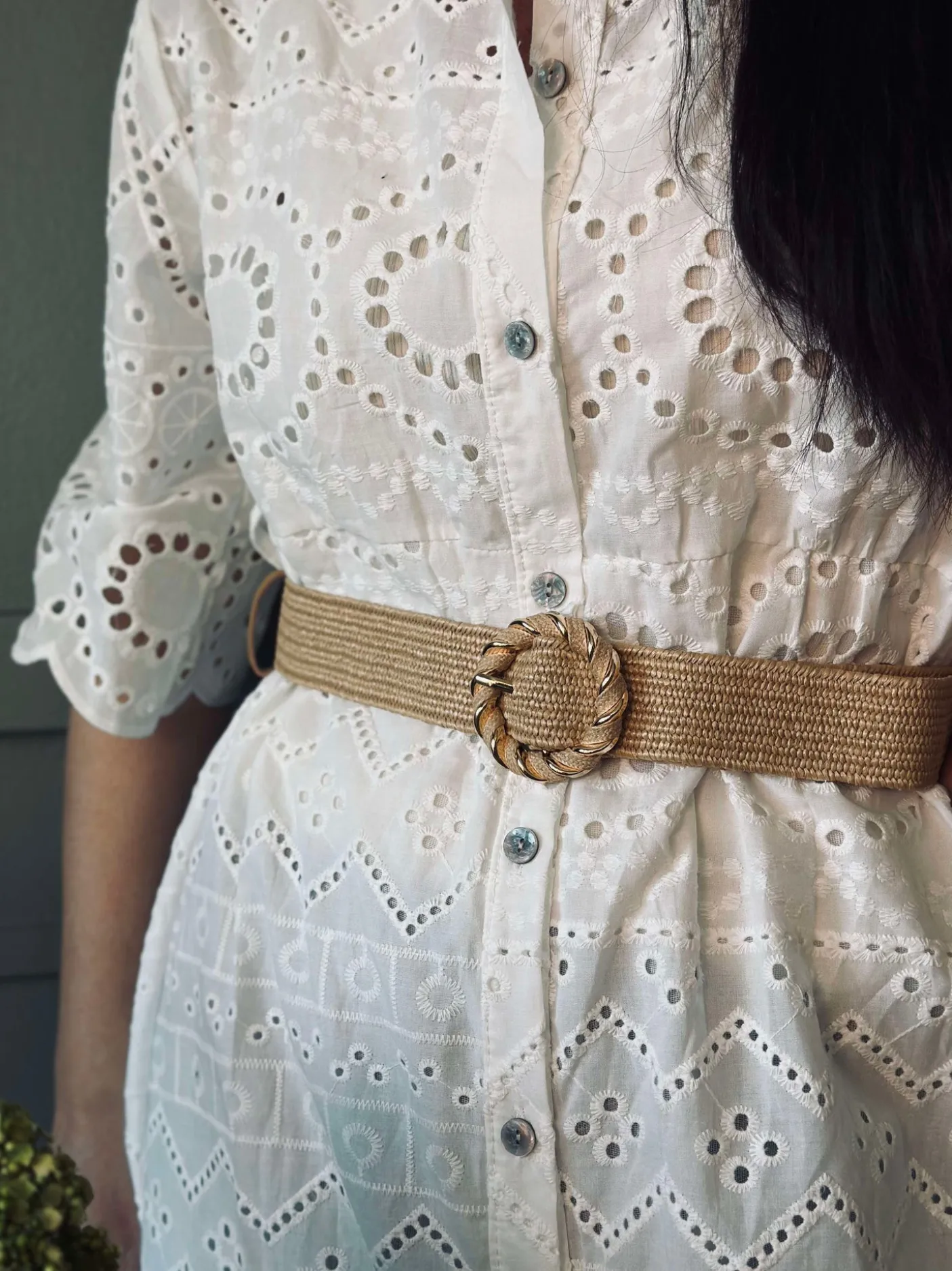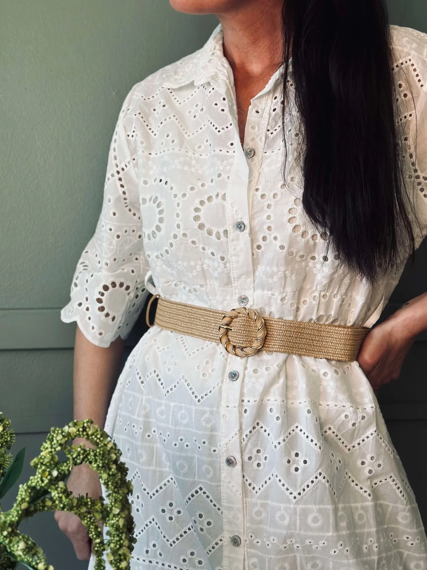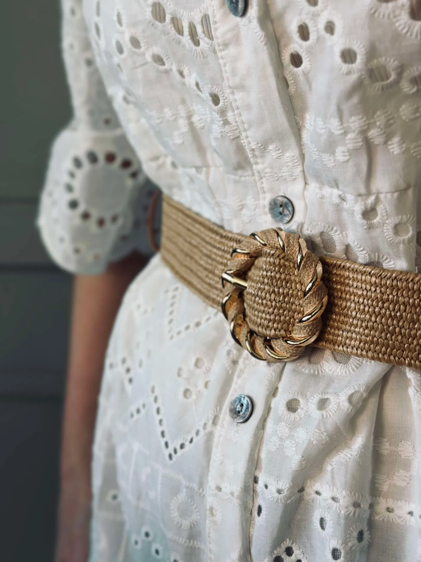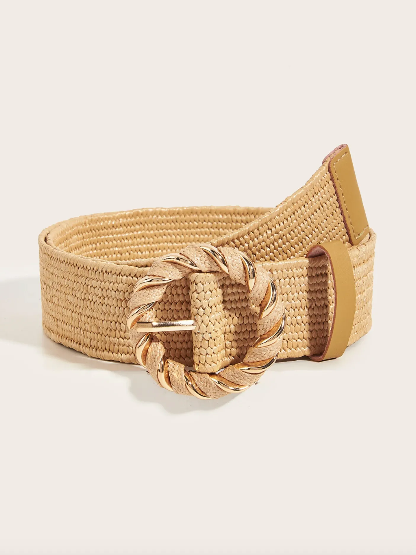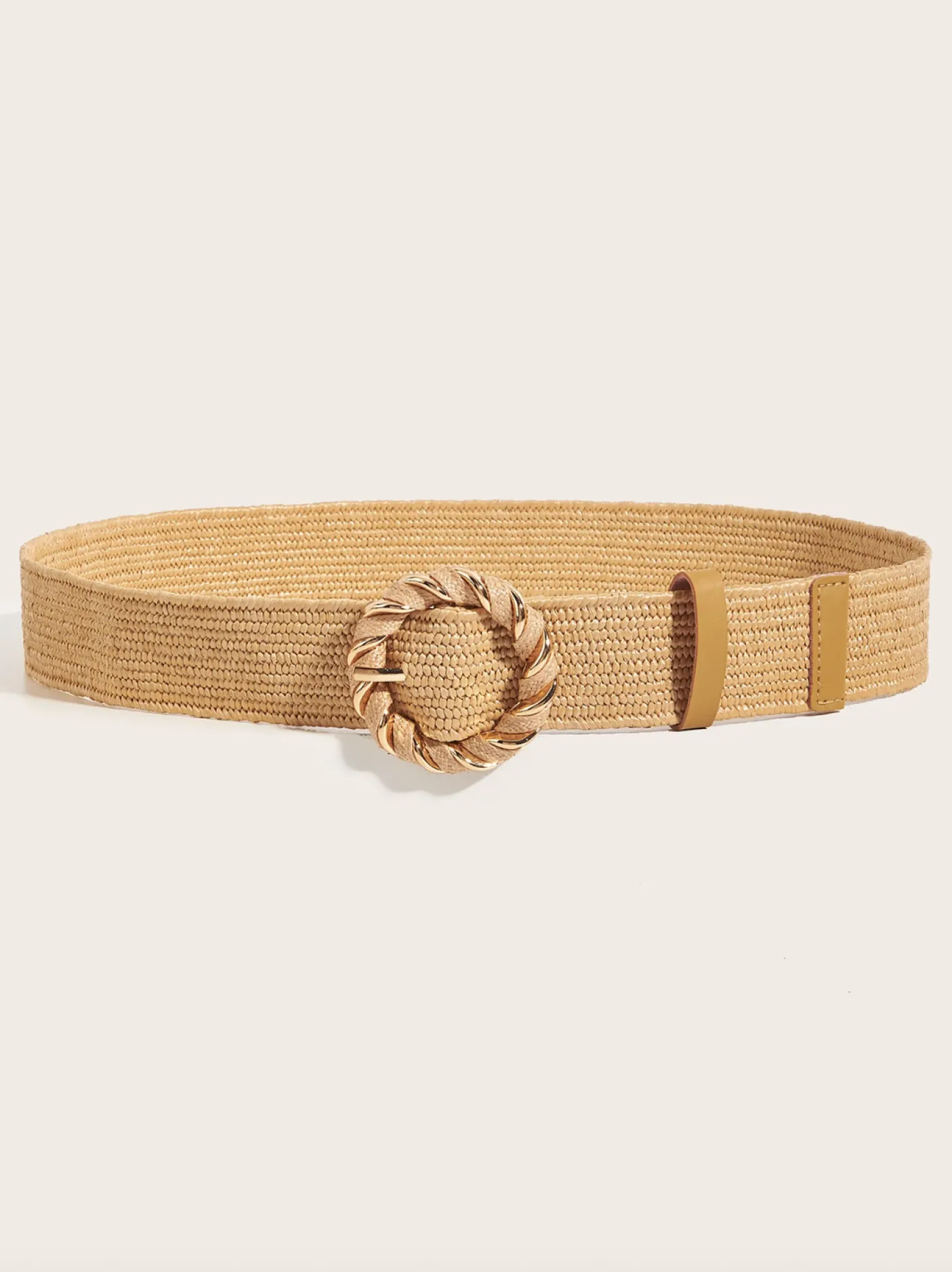 Bæltet er lavet i naturflet med struktur/vævet mønster, som giver en let og organisk overflade. Den beige/camel farvetone kombineres med et guldfarvet, rundt spænde for en varm kontrast.