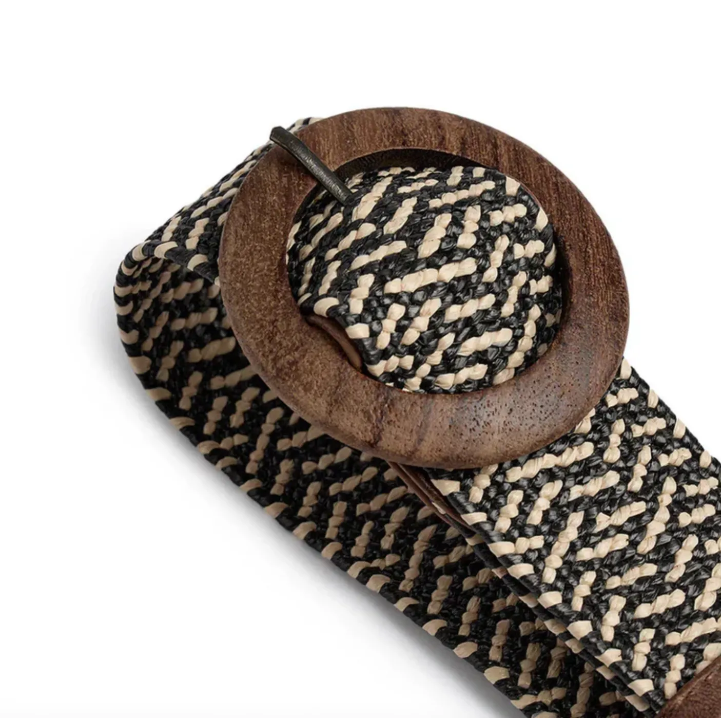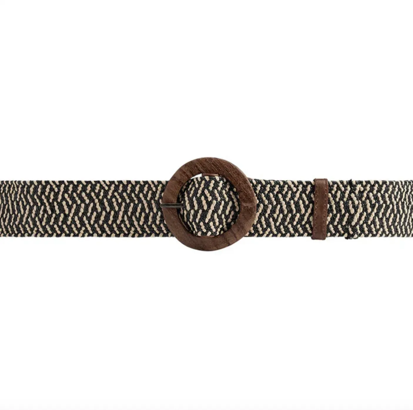 Bæltet er i træ og har et struktur/vævet mønster. Den sorte farve gør udtrykket klassisk og let at kombinere.