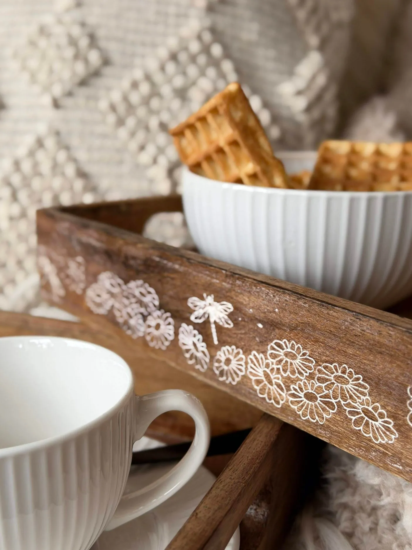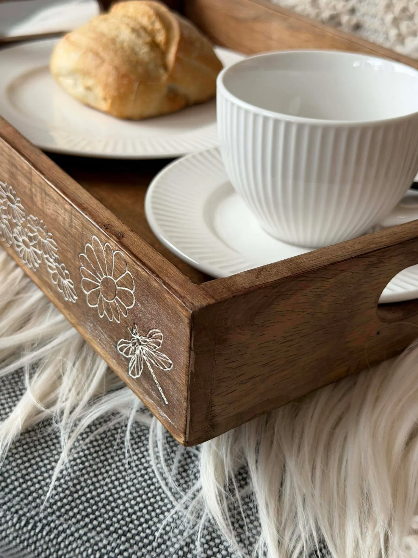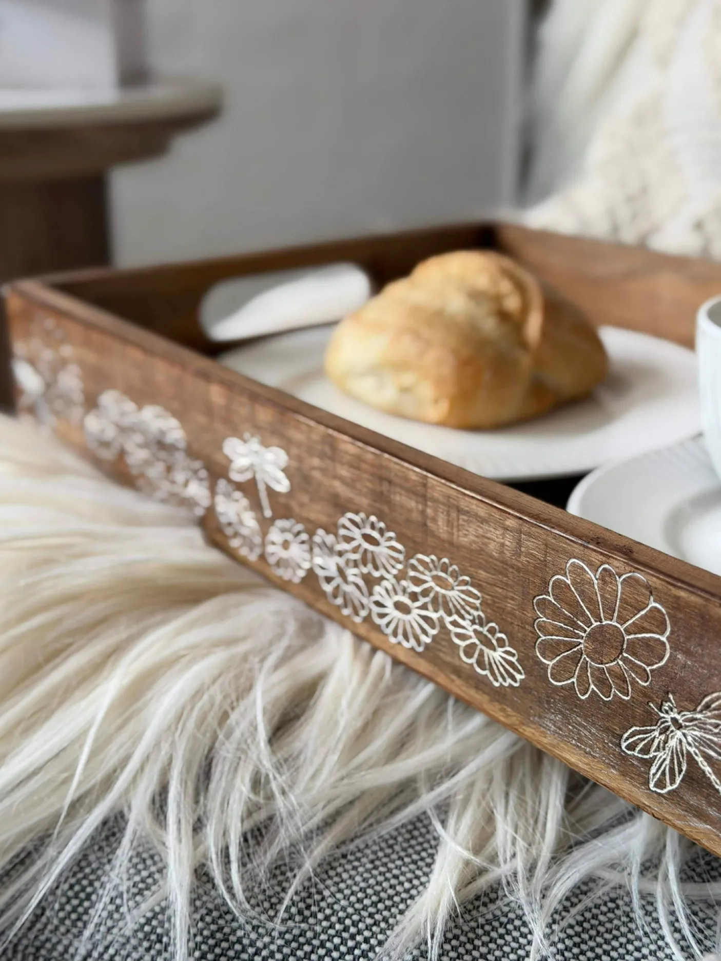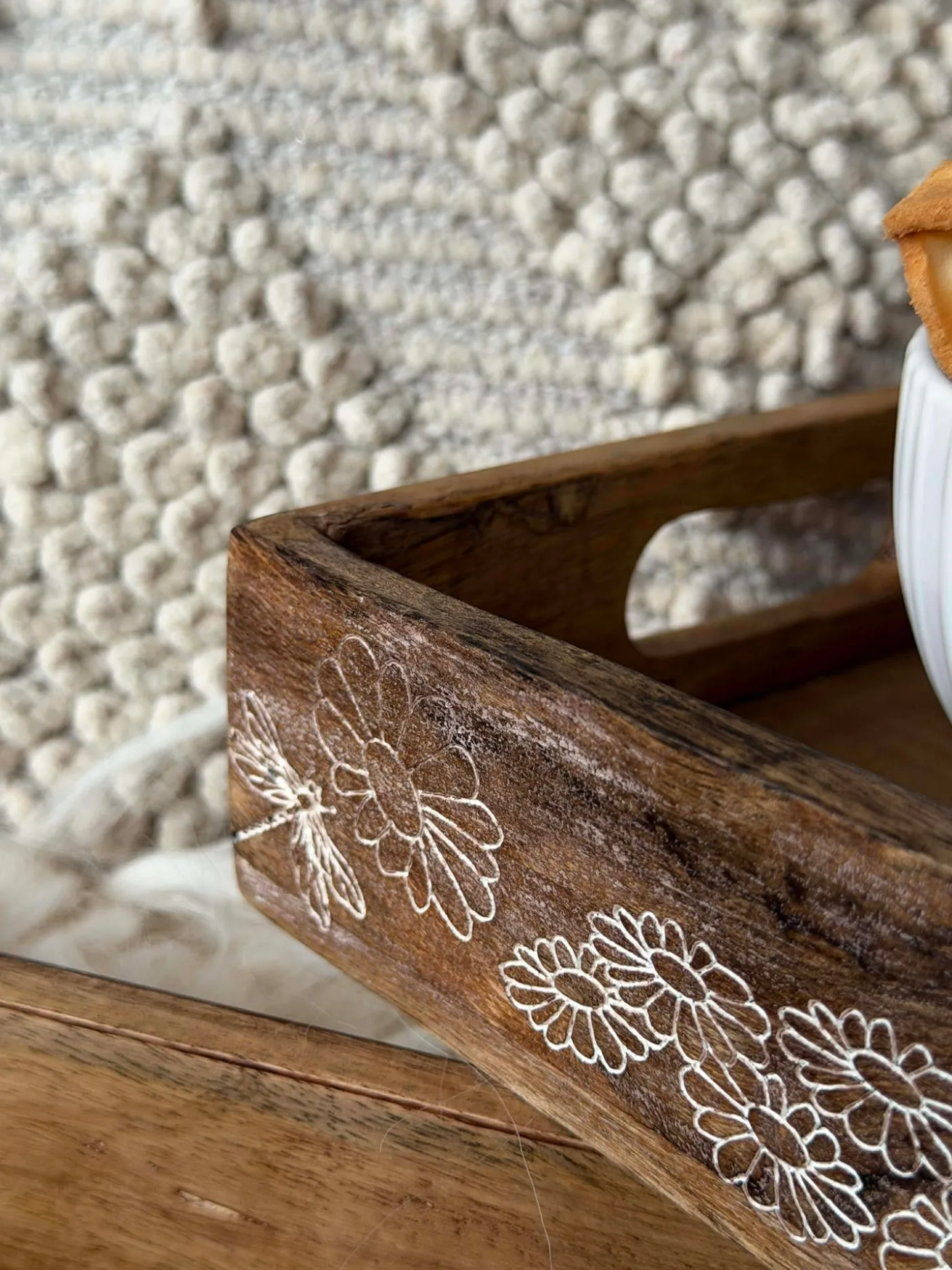 Bakken er lavet af ægte mangotræ, hvilket giver hvert stykke et unikt mønster og naturlig variation i farve. Den hvidtrykte overflade skaber et roligt, let look uden at skjule træets årer. Materialets holdbarhed sikrer, at bakken kan anvendes i mange forskellige sammenhænge.