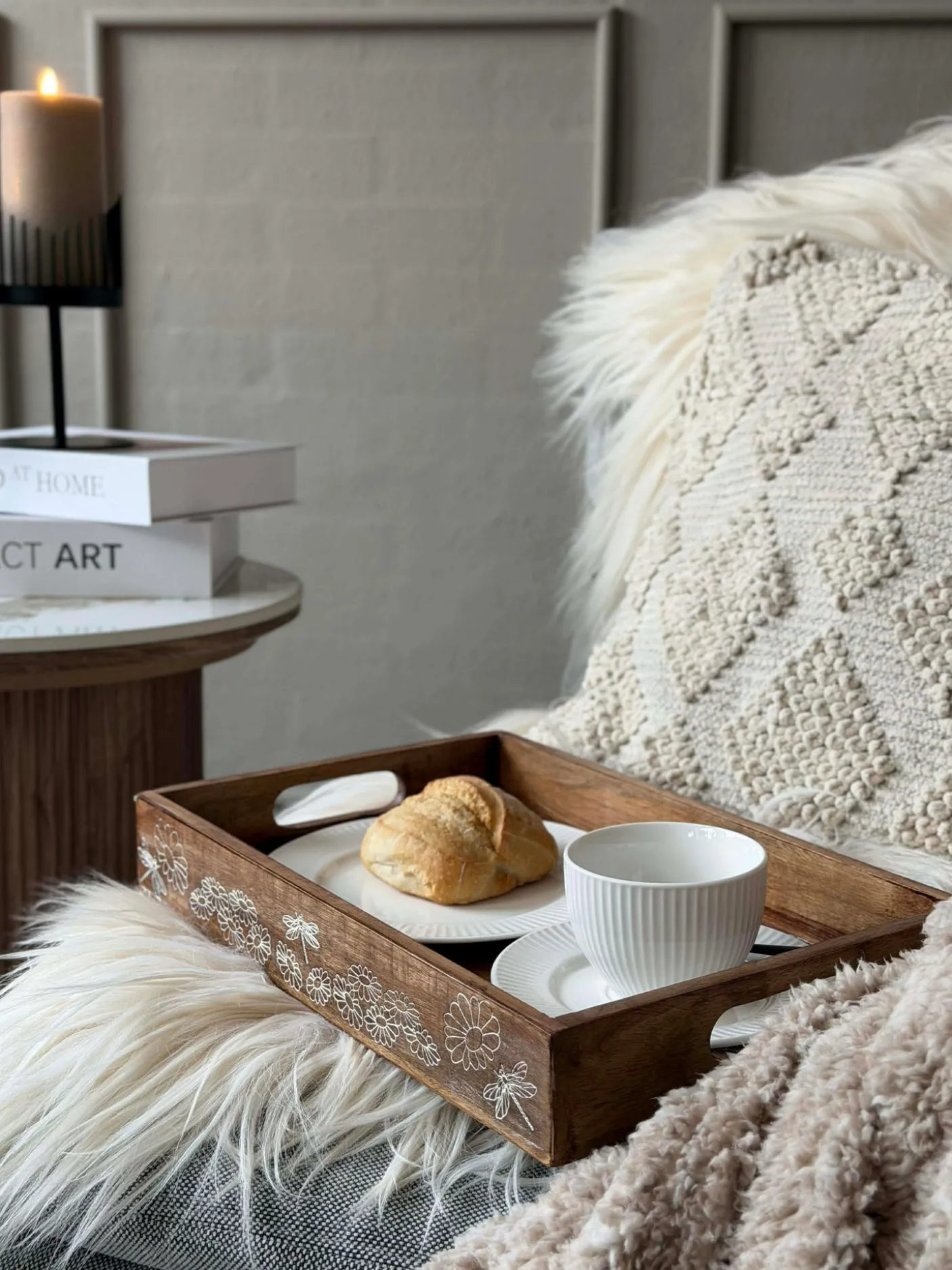 - Tilføjer et enkelt dekorativt element, hvor naturmateriale og hvid overflade mødes.