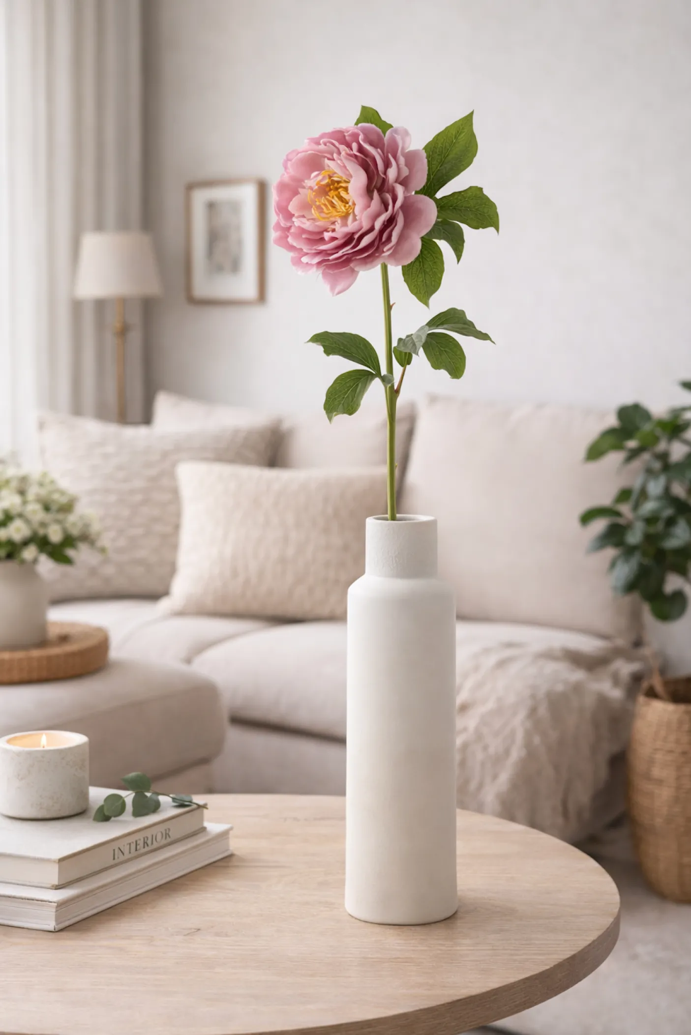 Silkeblomst pæon i antik cream/rosa. En enkelt stilk med et sart, antikt udtryk, som fungerer både alene og i samlede kompositioner. Materiale og farvenuancer skaber et blidt, tidløst look, der kan løfte små dekorationer uden at tage fokus.