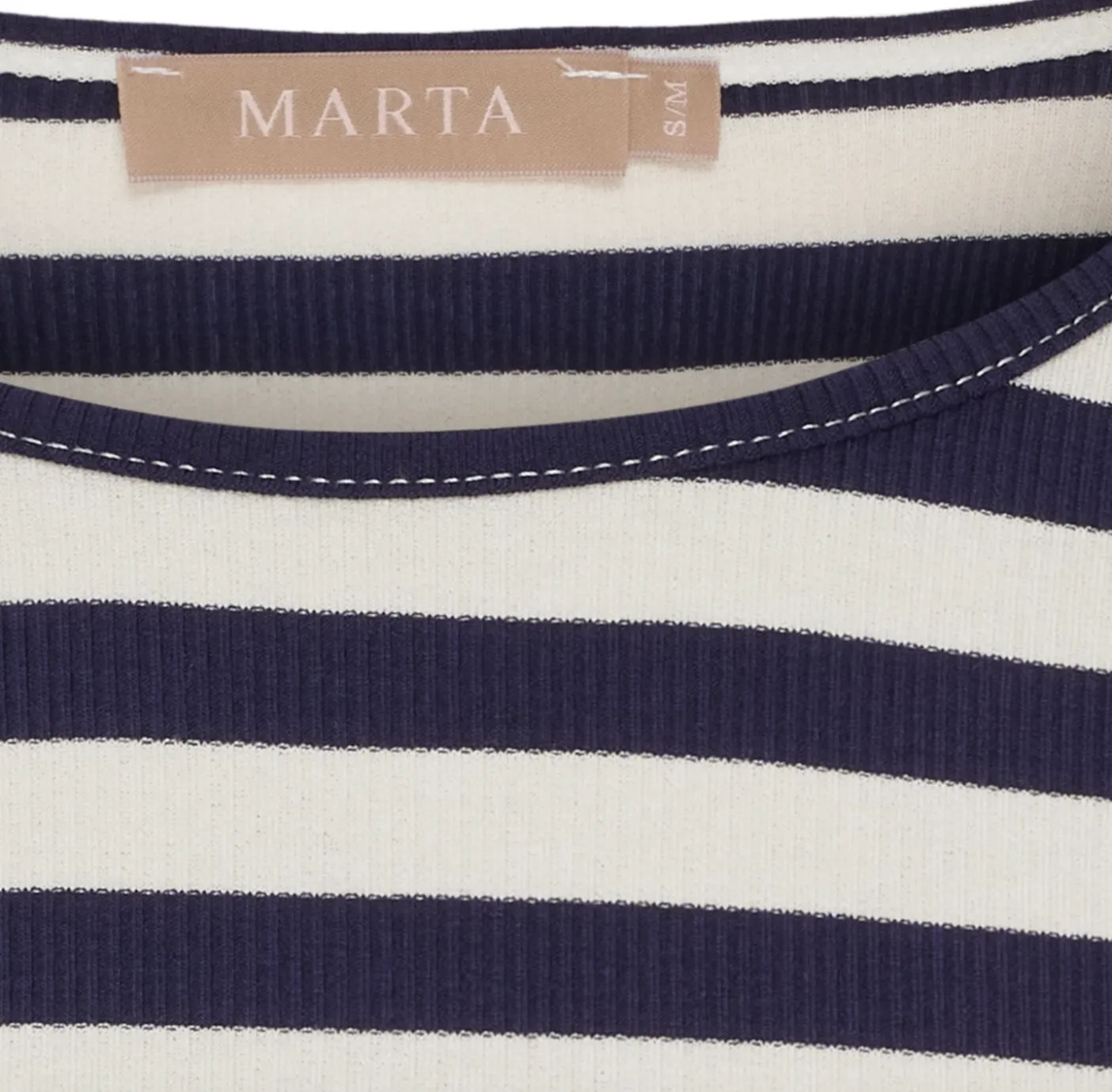 Basis stribet langærmet bluse i navy fra Marta Du Cháteau i en blød kvalitet. Blusen er tætsiddende og komfortabel, og fungerer som en enkel basisstyle i garderoben. Materialesammensætningen er 97% viskose og 3% elastan. Der er et stribet mønster, som giver et klassisk og afdæmpet udtryk.