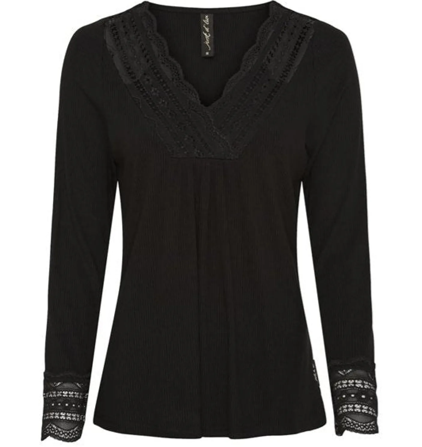 Blusen har blonde på hals og ærmer. Perfekt til både nederdel og bukser.