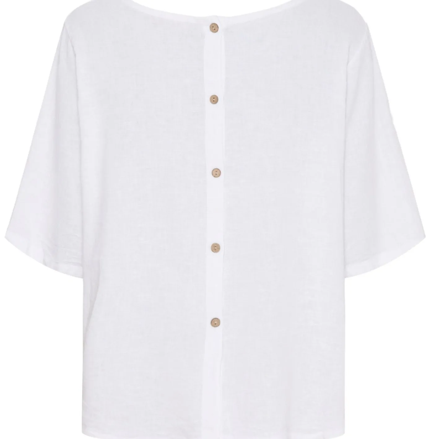 Blusen har rund hals, og knapper hele vejen ned bagpå.