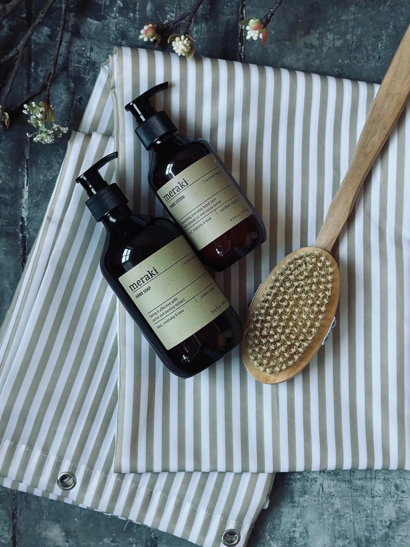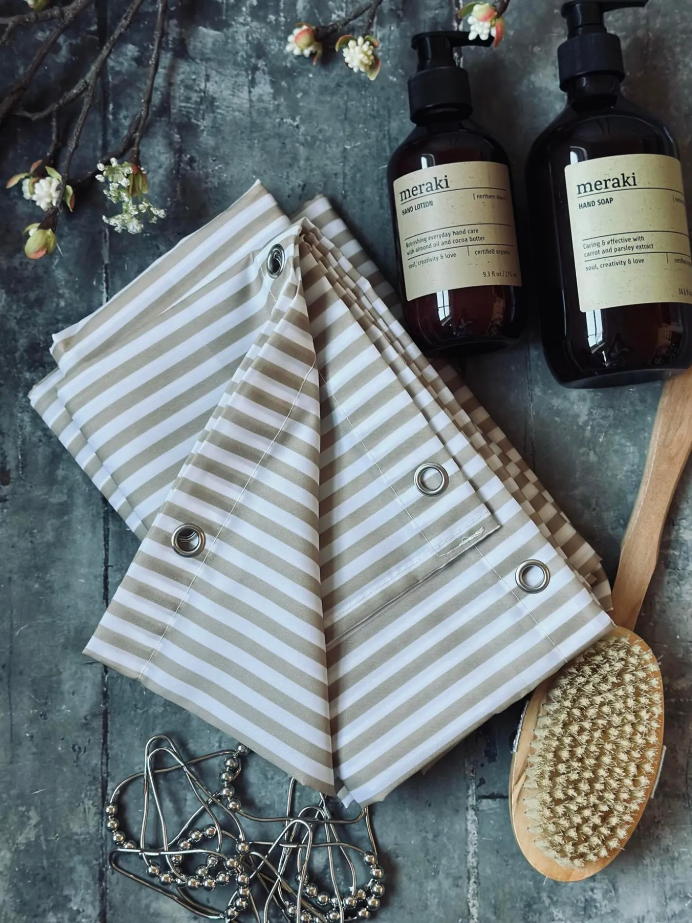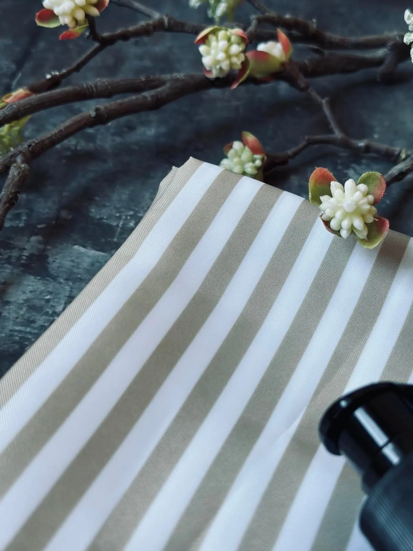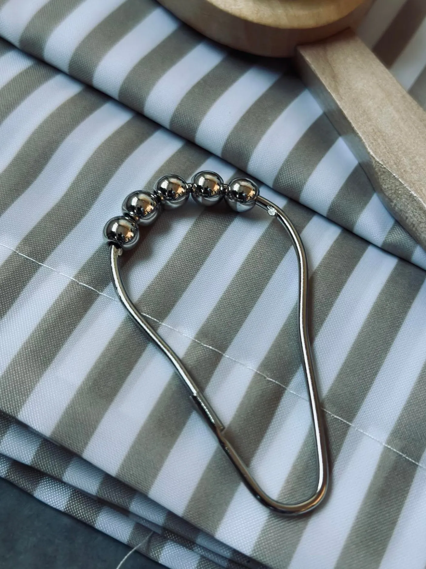 Badeforhæng med flotte striber i sand og hvid.