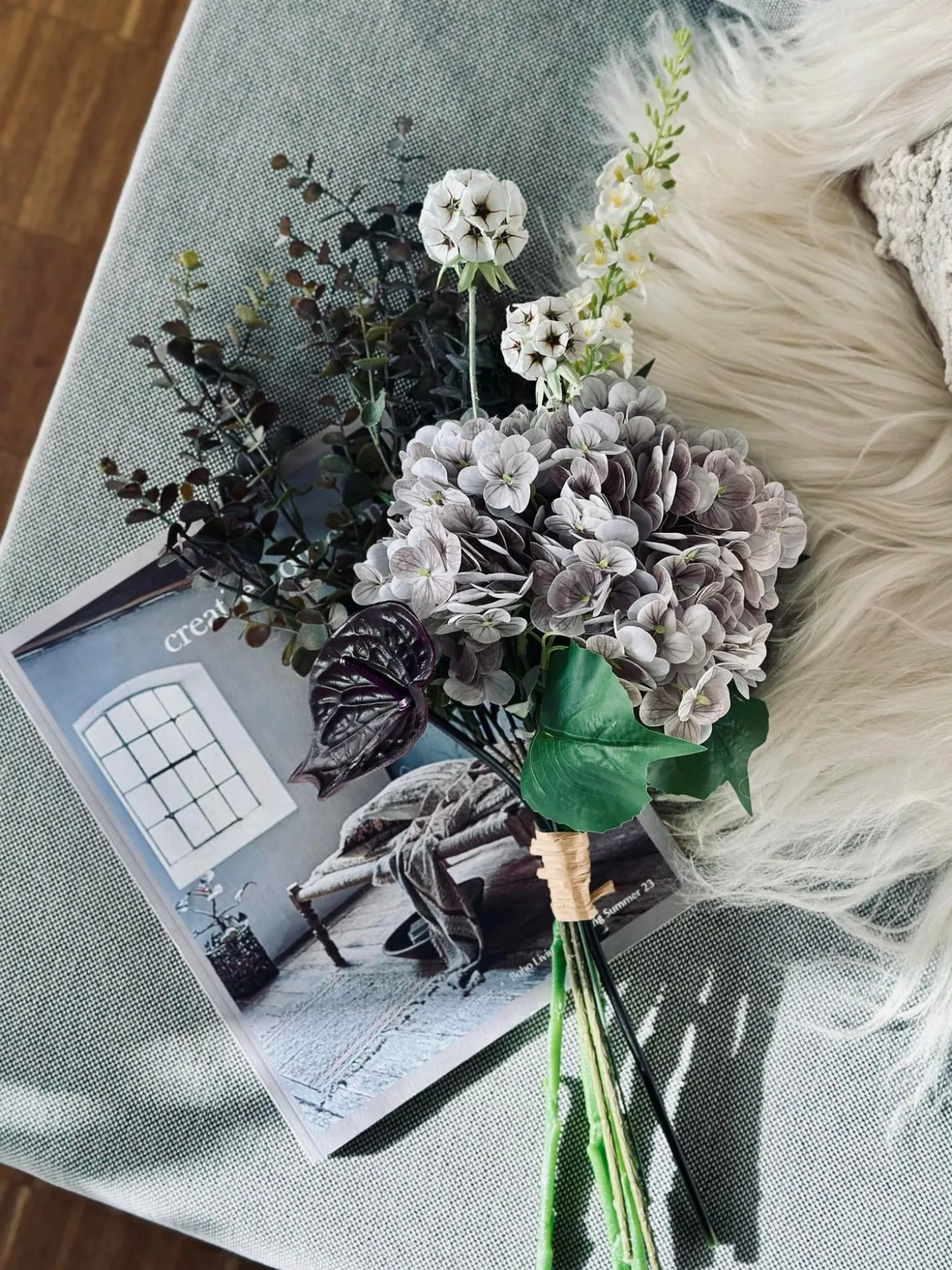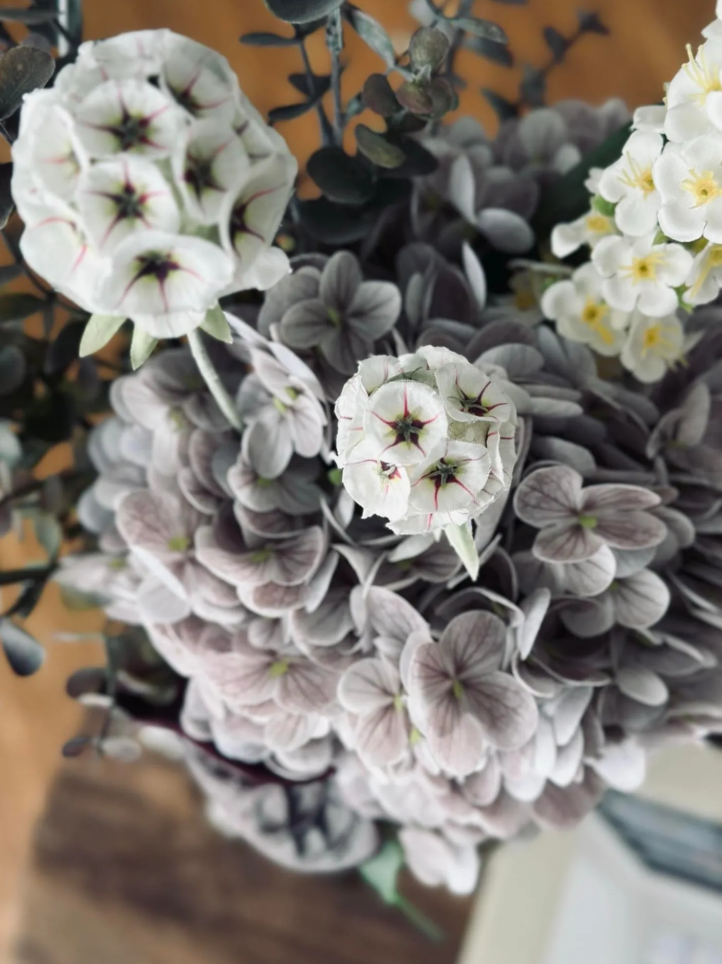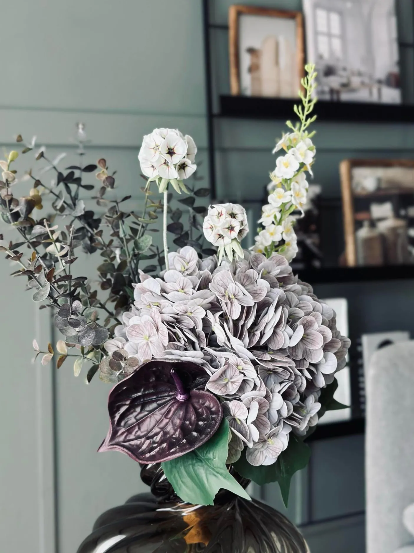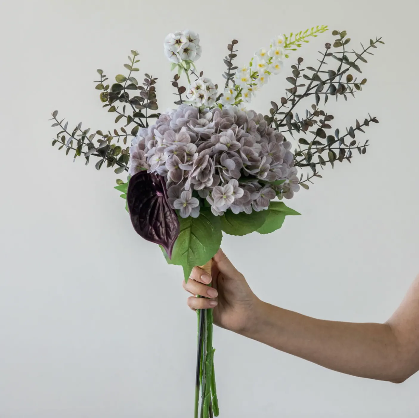 Buket med hortensia og eukalyptus Lilla/ hvid.