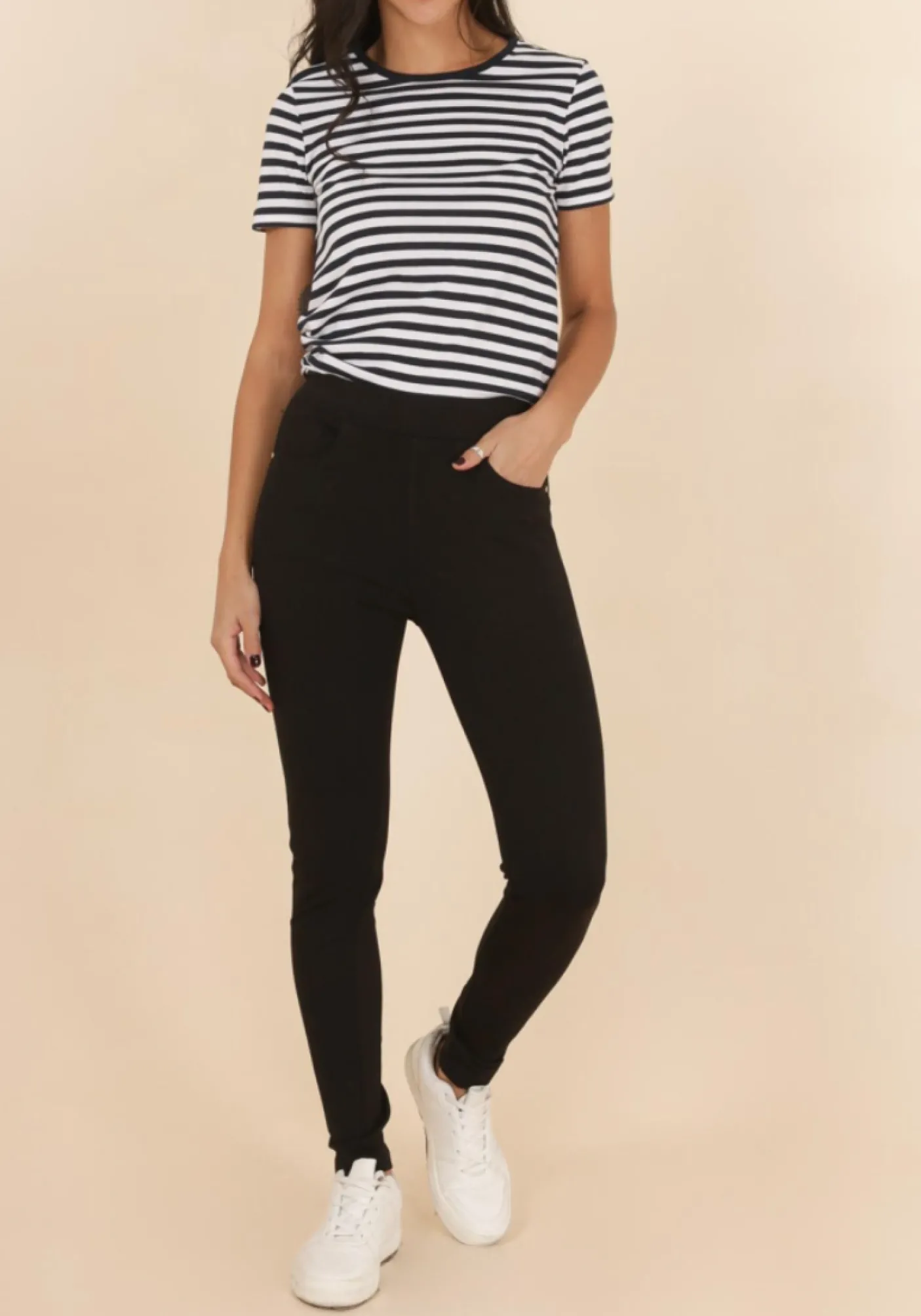 Super lækre bukser i jeans-look med stretch, bløde som joggingbukser og med et afslappet udtryk. Brug dem i hverdags- eller fritidsgarderoben, hvor komfort og et denim-inspireret look skal gå hånd i hånd. Materialet er en bomuldsblend, og størrelsesintervallet dækker 38–50. Farven er sort, og bukserne har en god pasform med elastik i taljen.