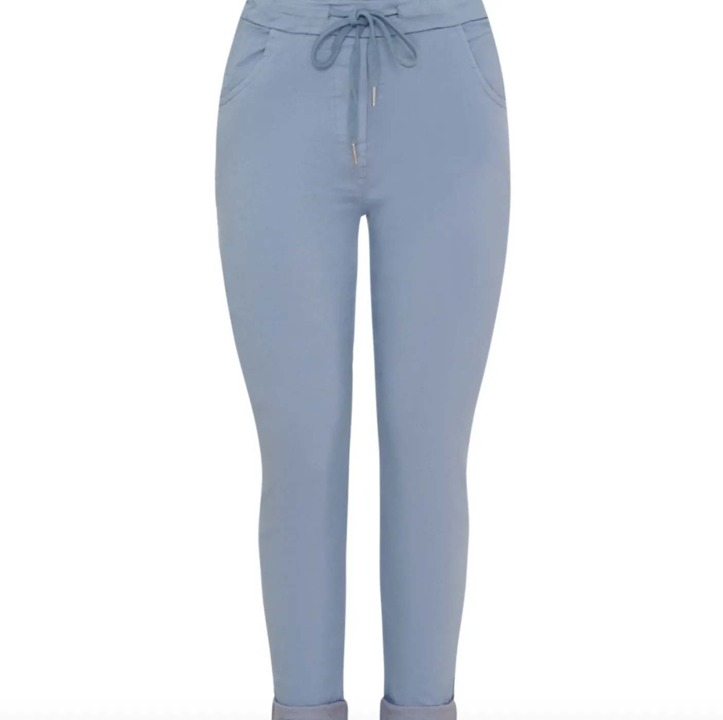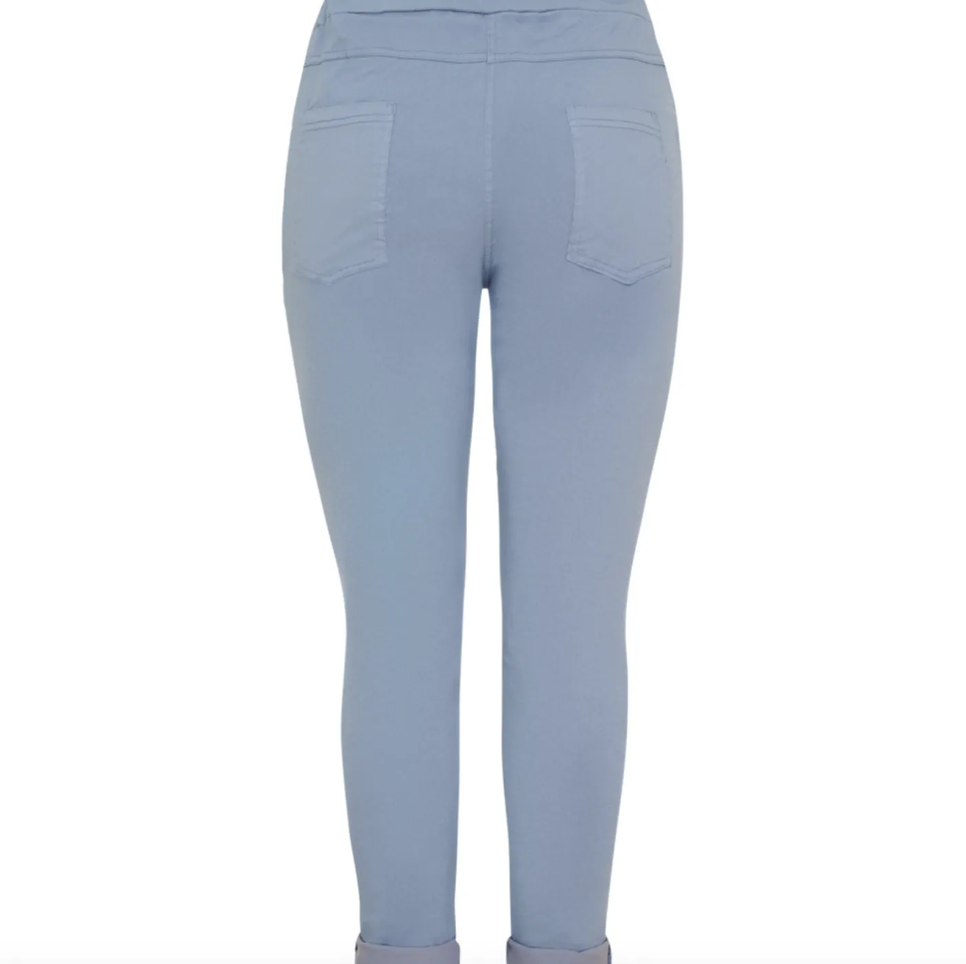 Det enkle snit og den blå farve gør bukserne velegnede som en neutral basis i garderoben, hvor stretch kan være praktisk i daglig brug og ved bevægelse.