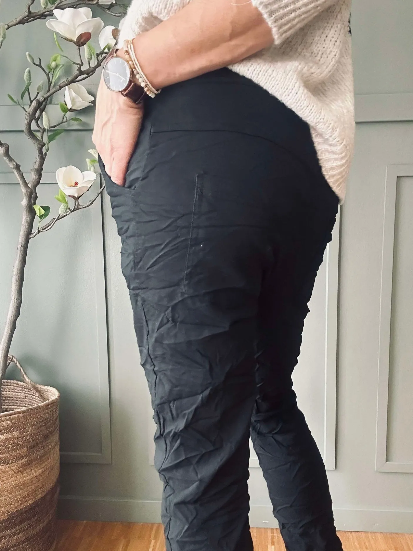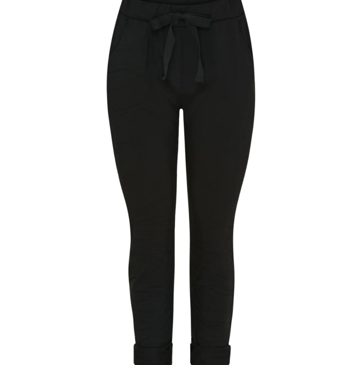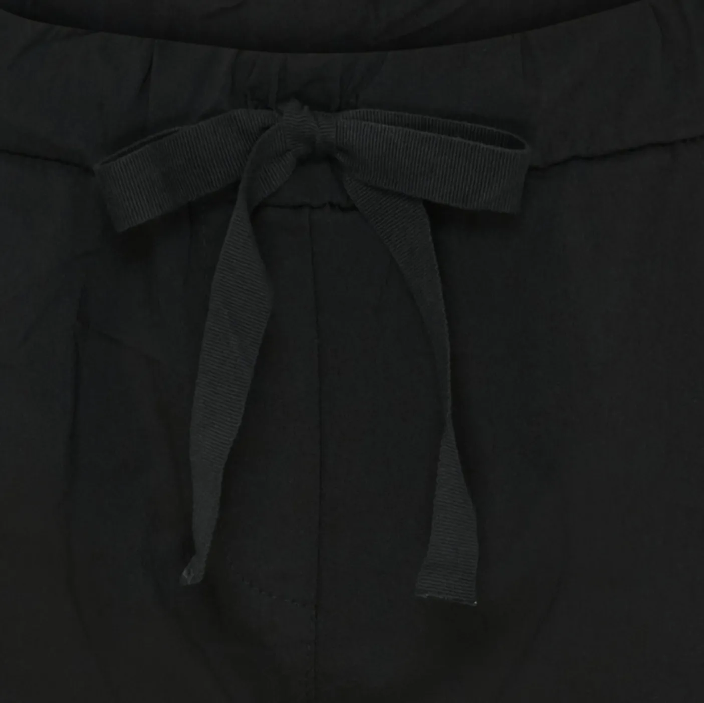 Sorte bukser med bindebånd i taljen, udført i en viscoseblanding. Materialet er oplyst som 65% viscose, 30% nylon og 5% elastan. Produktet fås i størrelserne S/M og L/XL, hvor der er angivet mål for hver variant. Det ensfarvede udtryk giver et neutralt, afdæmpet look i garderoben.