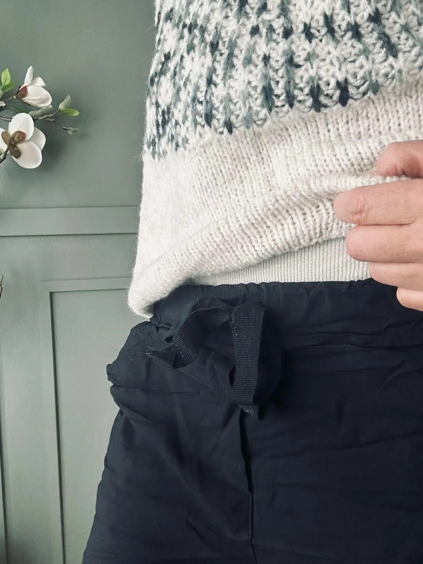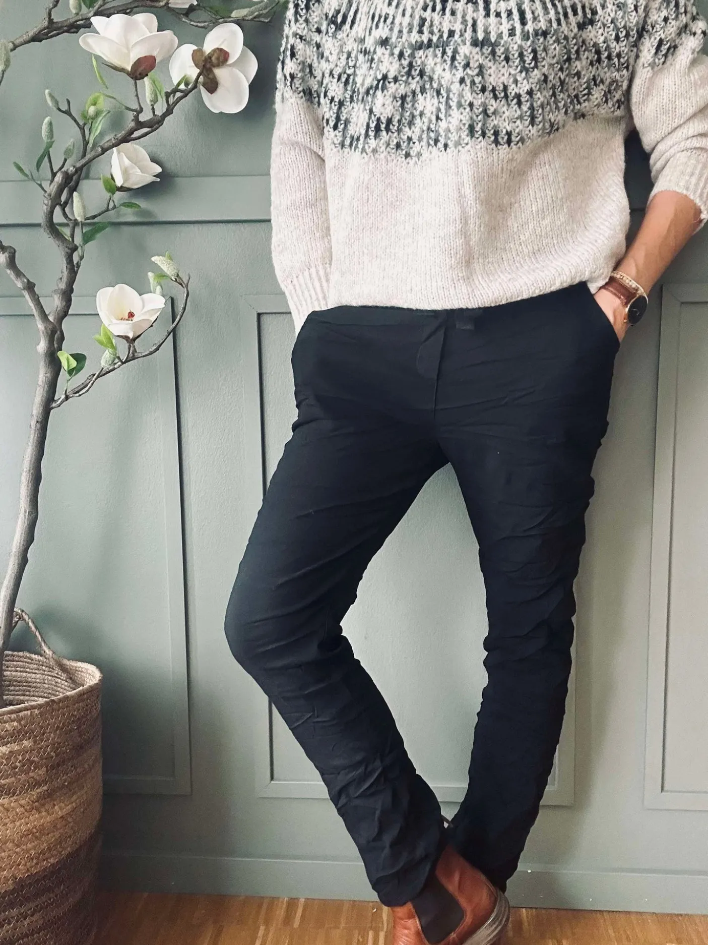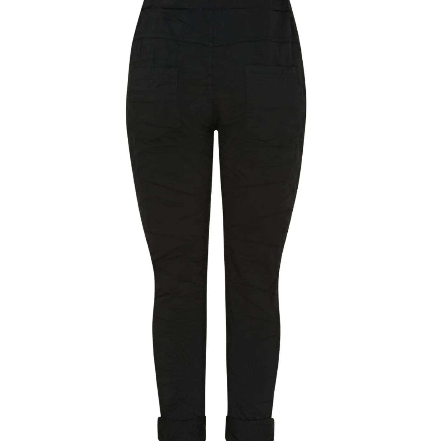 Sorte bukser med bindebånd i taljen, udført i en viscoseblanding. Materialet er oplyst som 65% viscose, 30% nylon og 5% elastan. Produktet fås i størrelserne S/M og L/XL, hvor der er angivet mål for hver variant. Det ensfarvede udtryk giver et neutralt, afdæmpet look i garderoben.