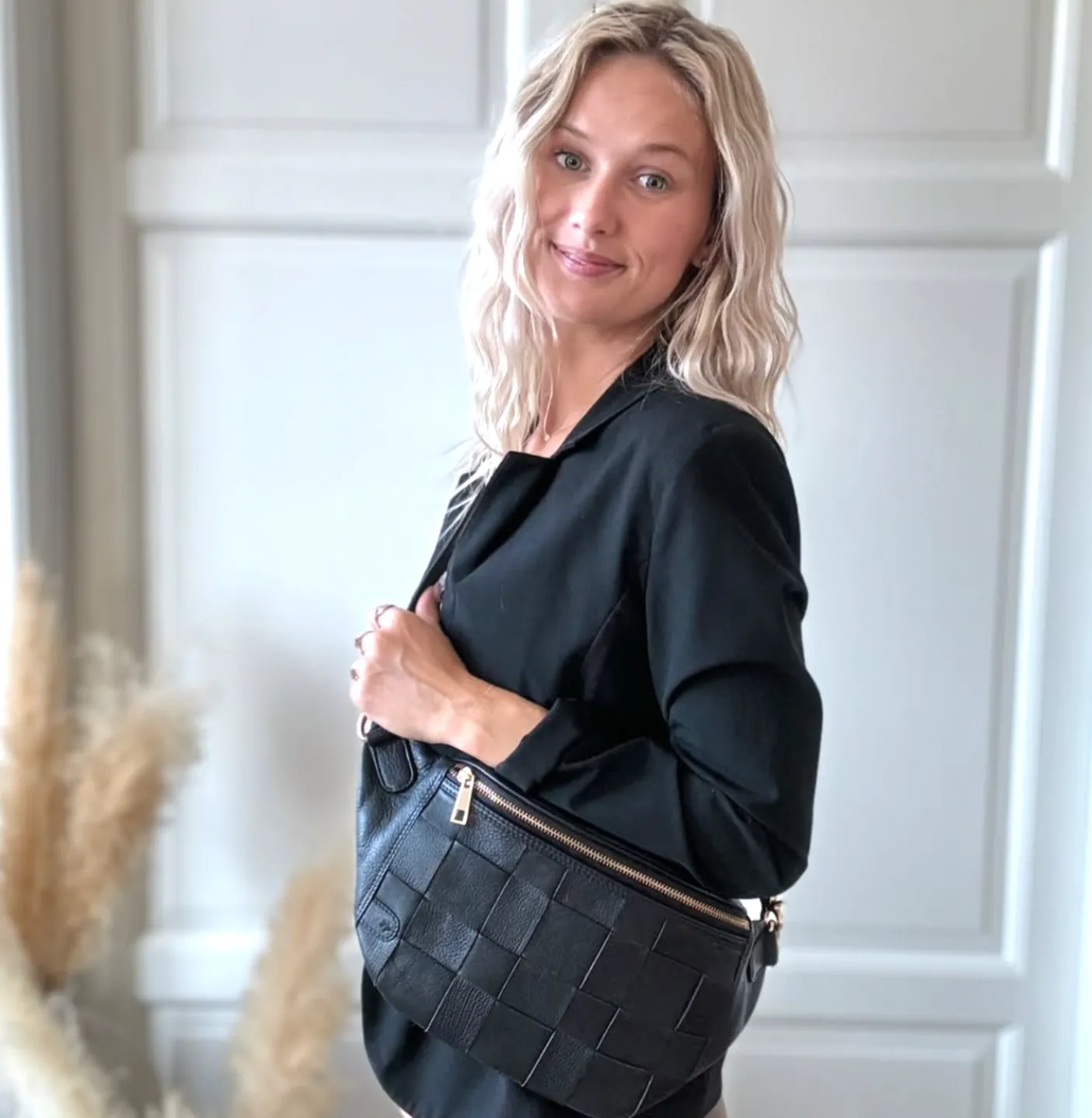 Rummelig bumbag I sort skind med flettet front.