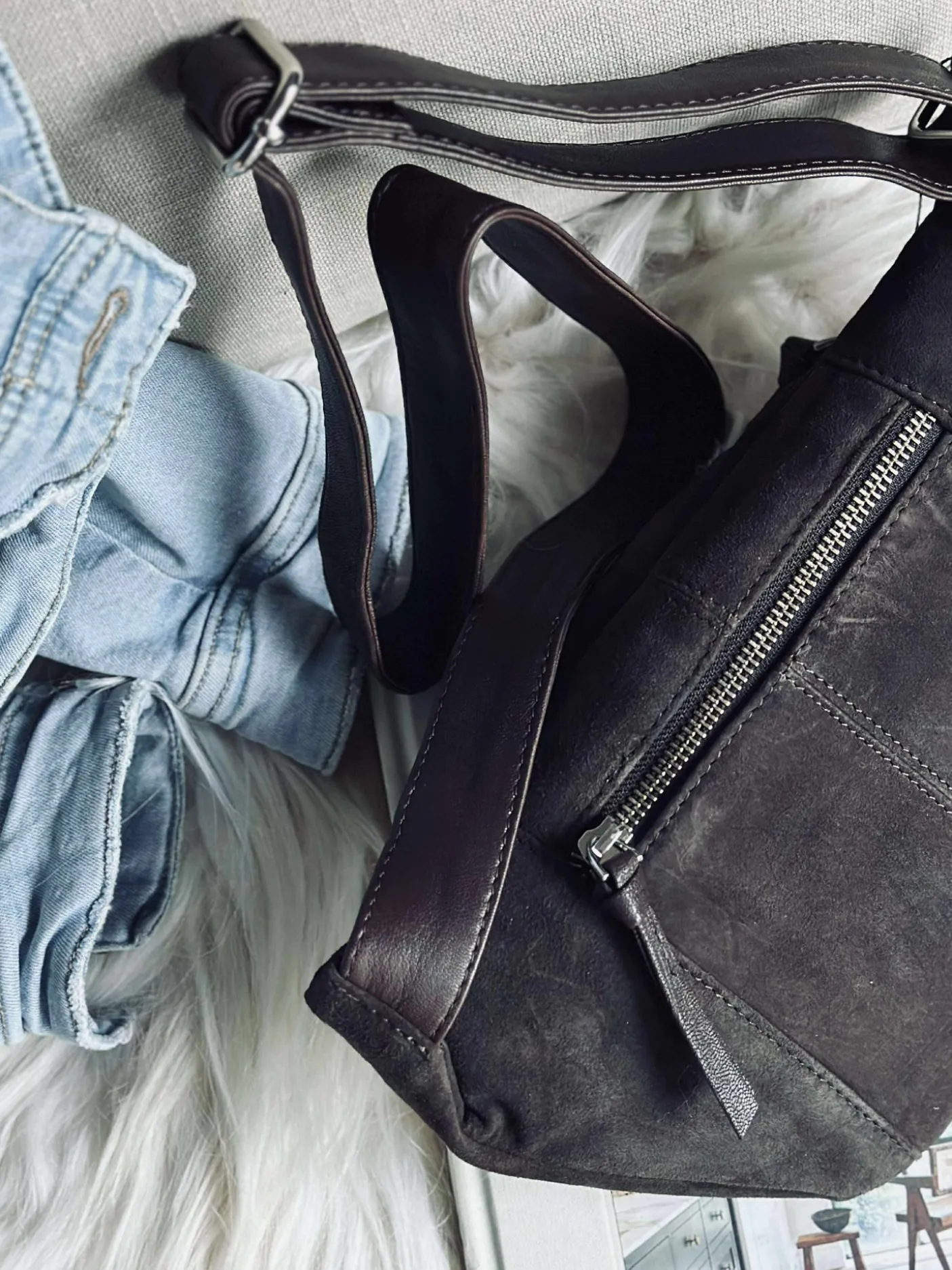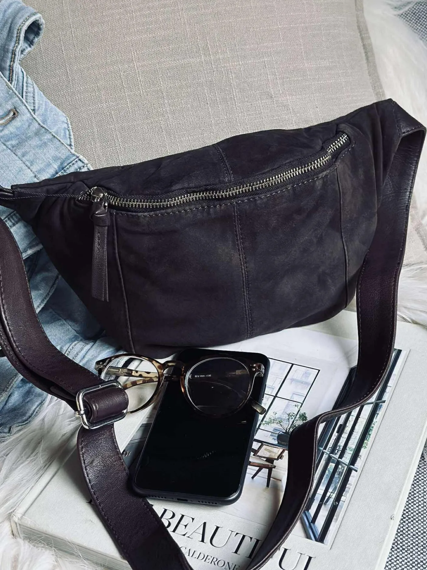 Tasken har lomme på bagsiden med lynlås , og justerbar rem med metalspænde.