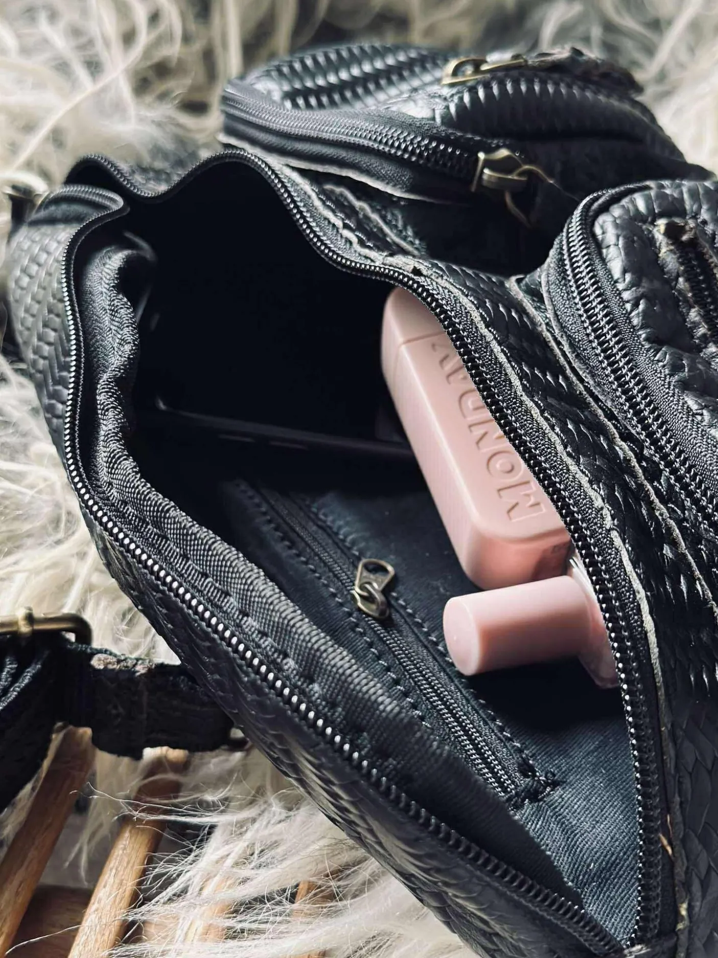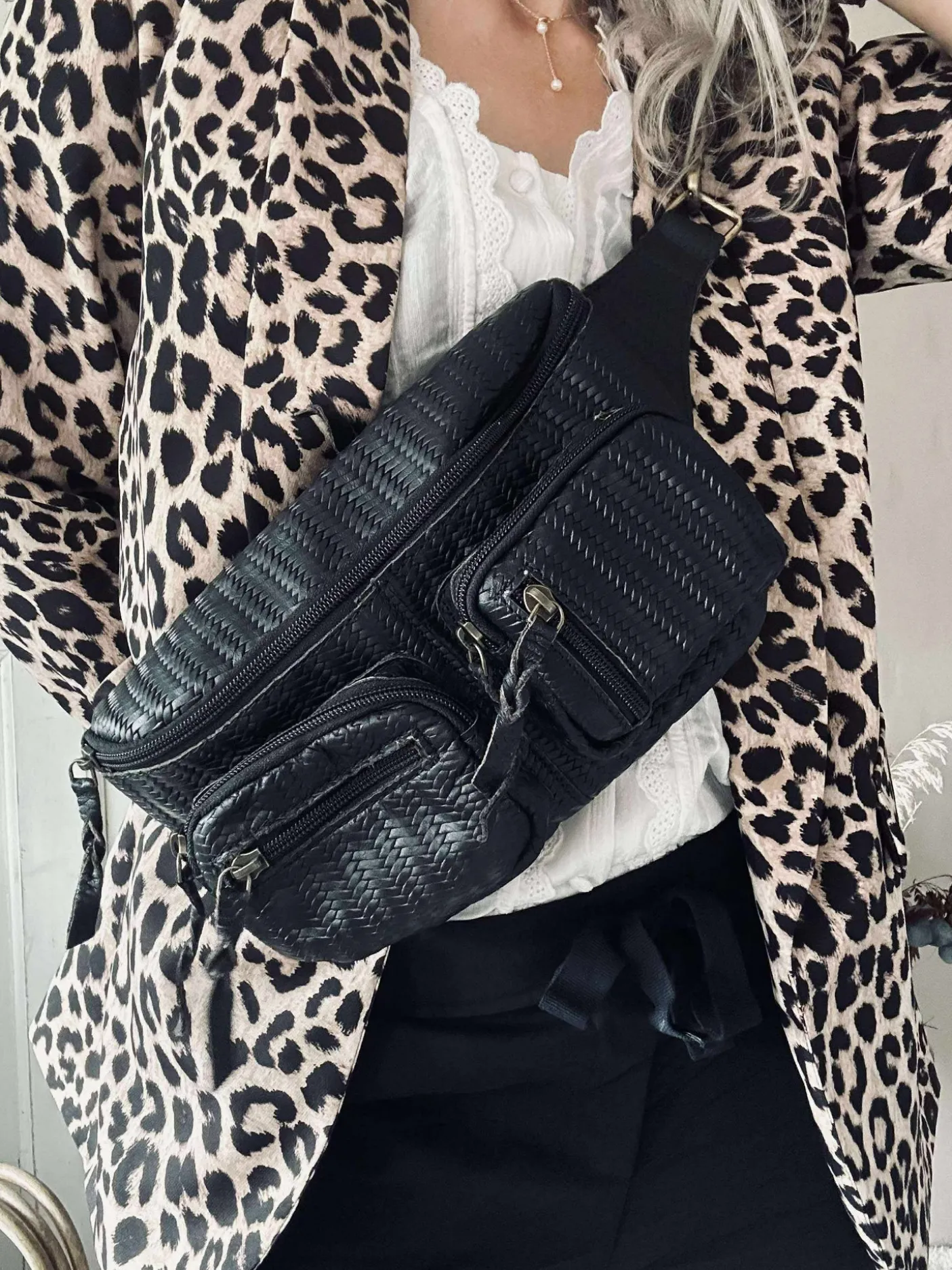 Denne bumbag er elegant med det flettet skind, samtidig får tasken et cool look med de mindre lommer på fronten.