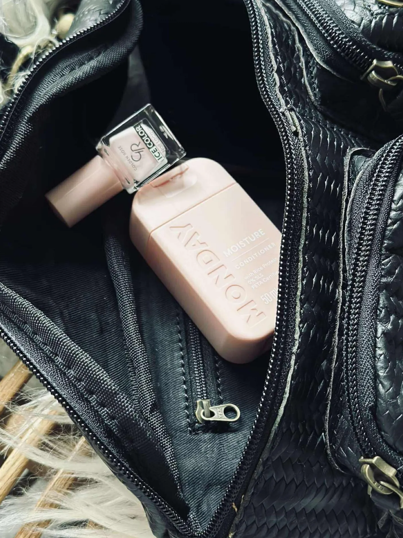 - På bagsiden har tasken en lomme med lynlås.