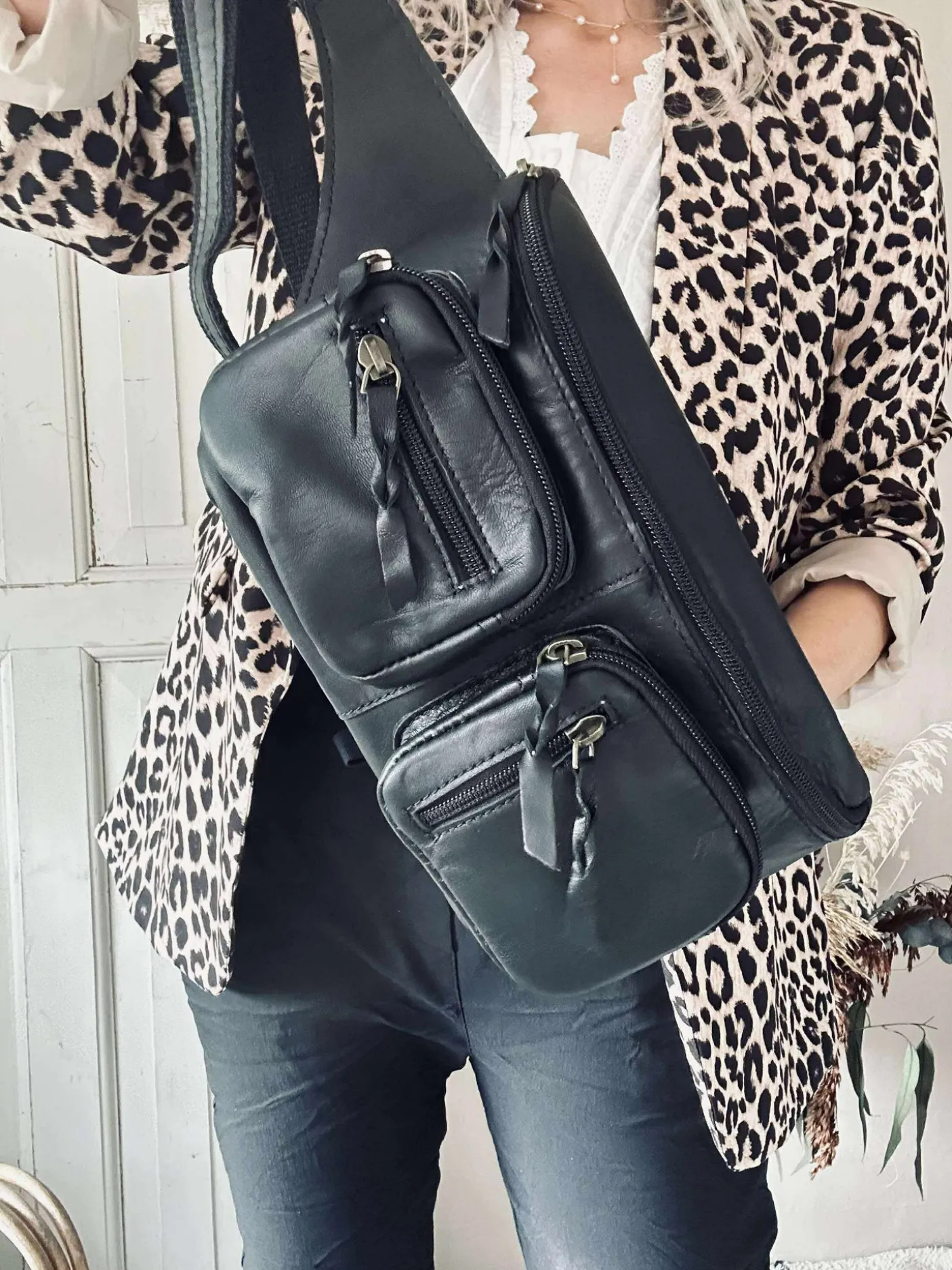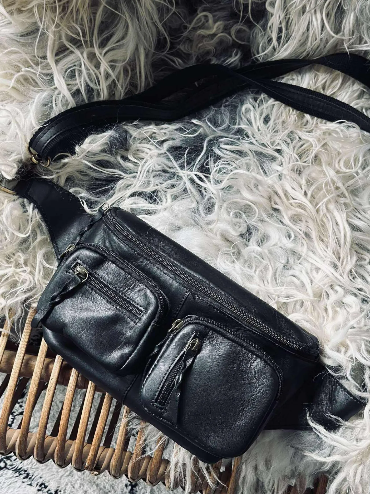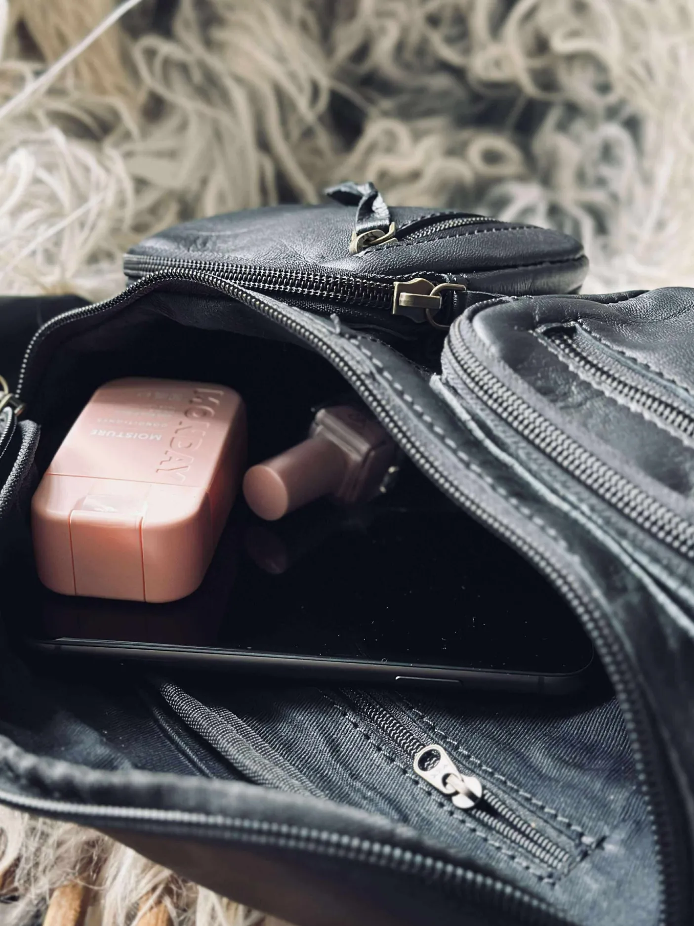 På fronten af tasken ses to rum med flere lynlåse.