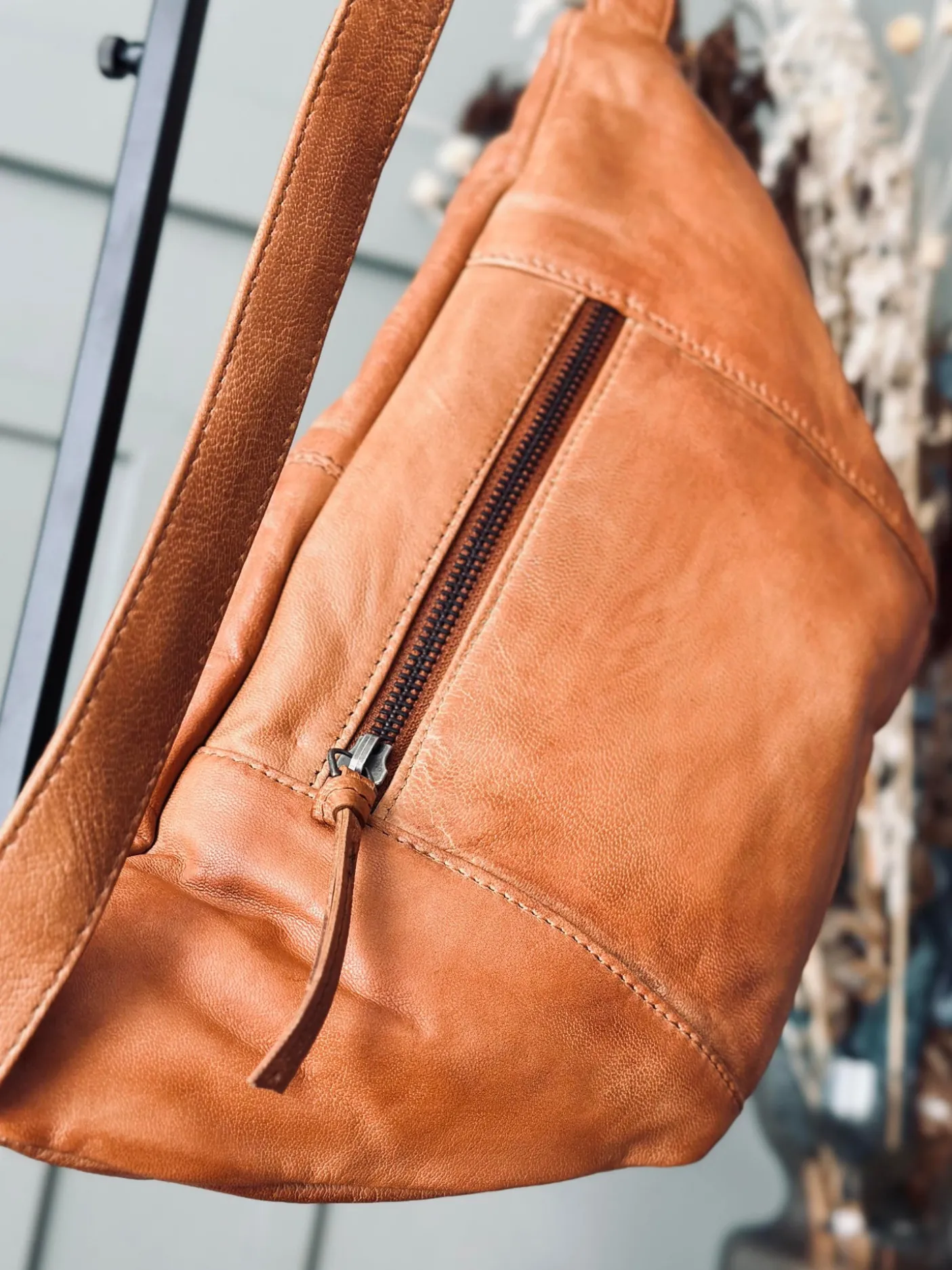 Har en justerbar taljerem i læder og en fin detalje med skindstropper på lynlåsene.