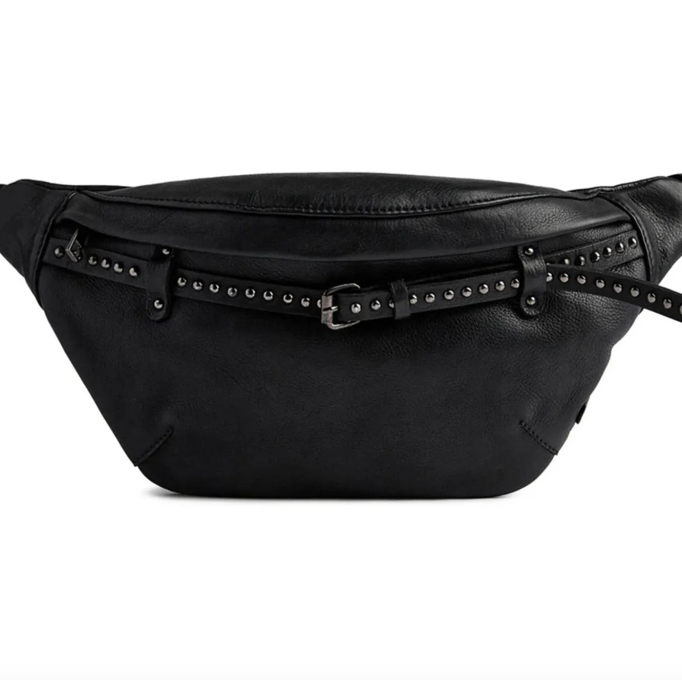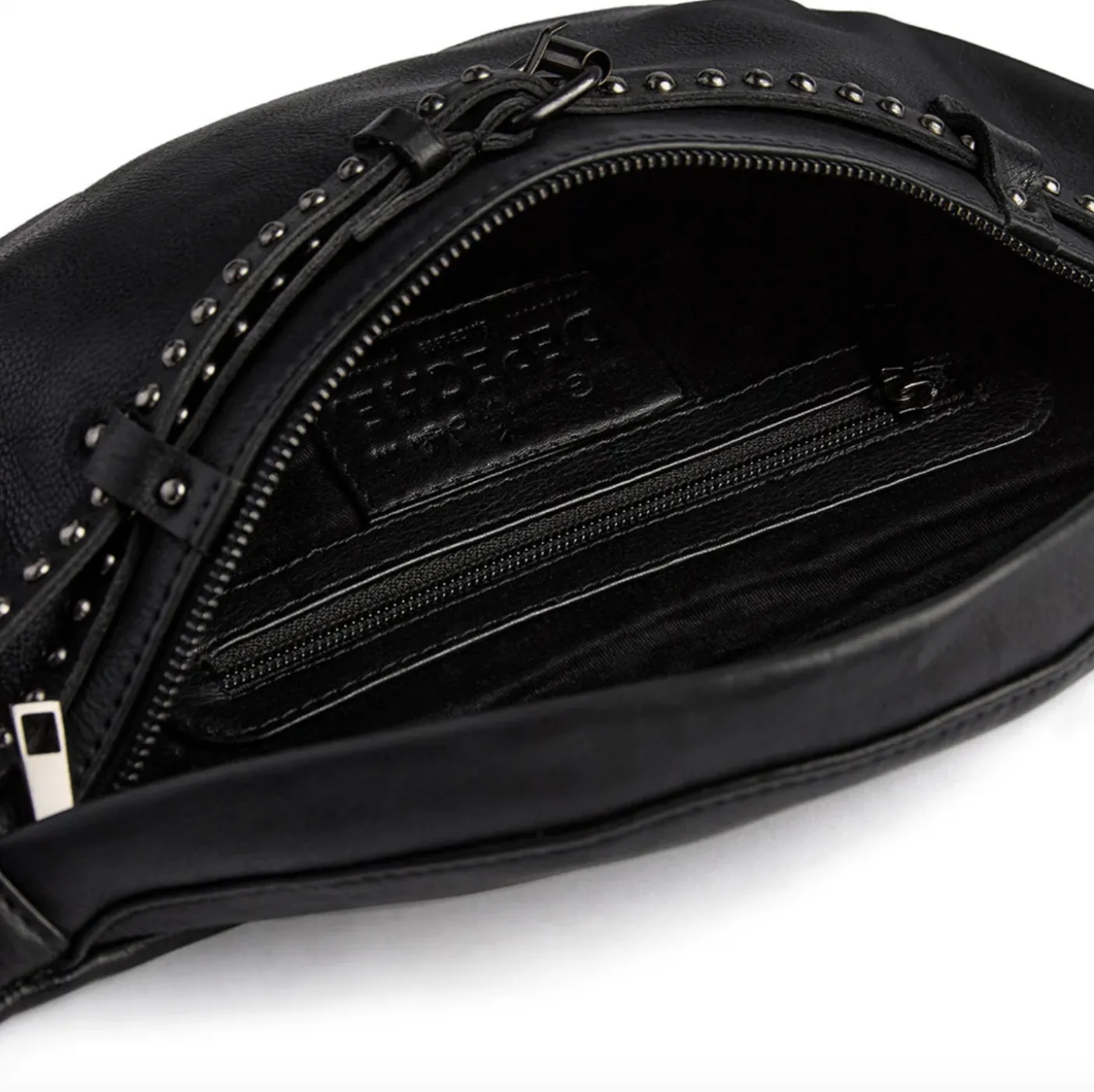 Denne bumbag kombinerer rå attitude med stilfuld funktionalitet – perfekt til hverdage på farten, byture og alt derimellem. Rundt om tasken løber en cool bælte-detalje med små nitter, der tilfører et edgy twist og gør tasken til meget mere end bare praktisk opbevaring.