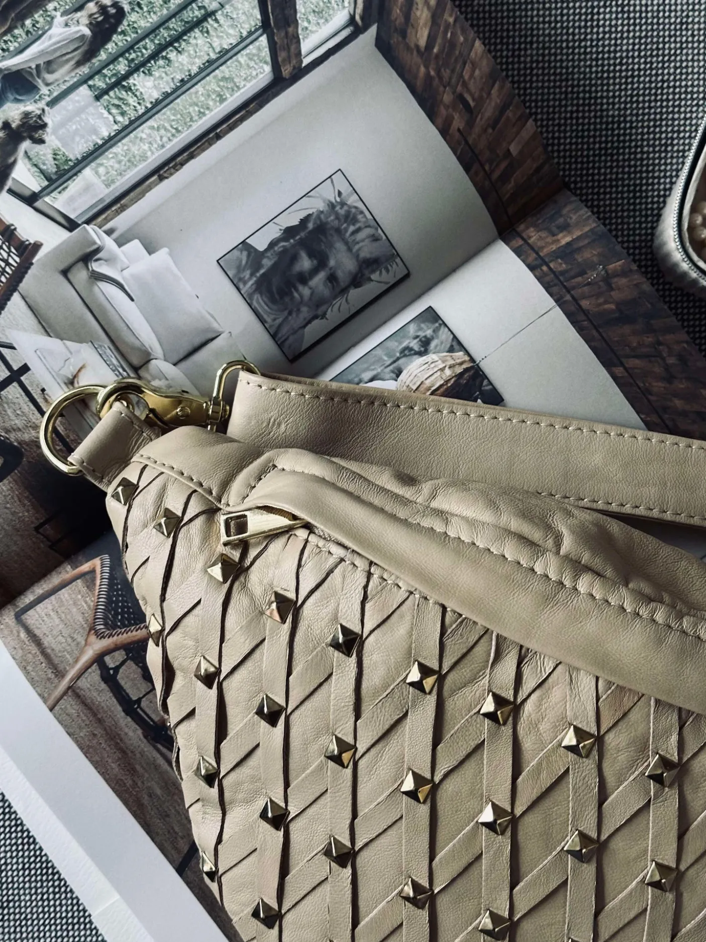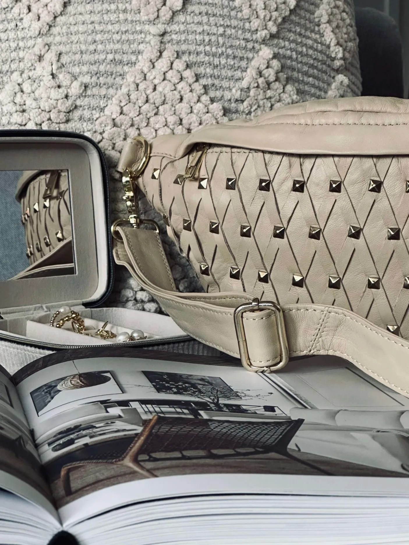 Denne bumbag er både chic og funktionel, perfekt til hverdag, sommerens festivaller og ferier. Tasken måler H: 18 x B: 34 x D: 7,5 cm og er dekoreret med nitter, som giver tasken et kantet, men sofistikeret udseende. Læderdetaljerne krydser smukt henover hinanden og tilføjer ekstra elegance til den iøjnefaldende taske.