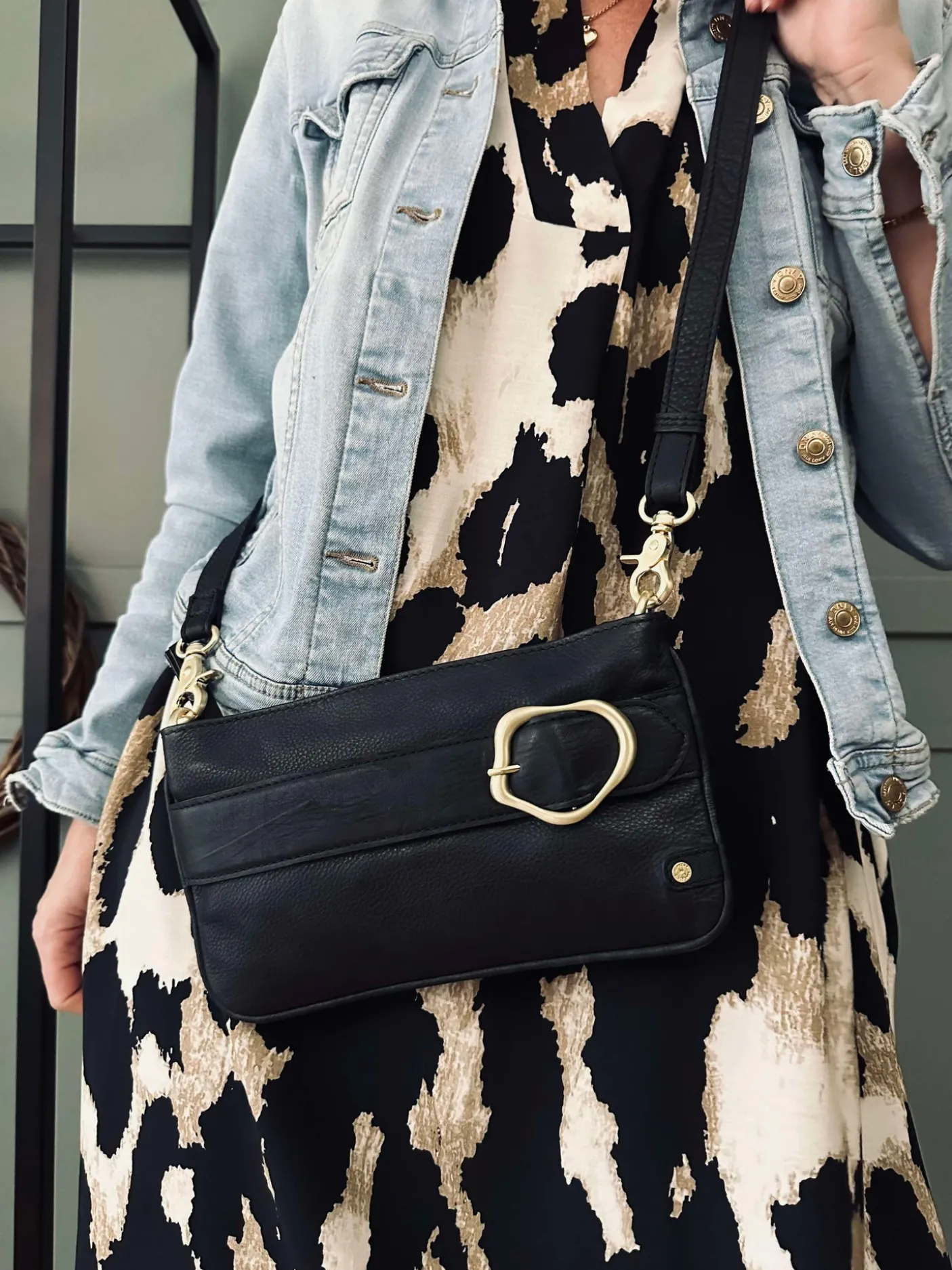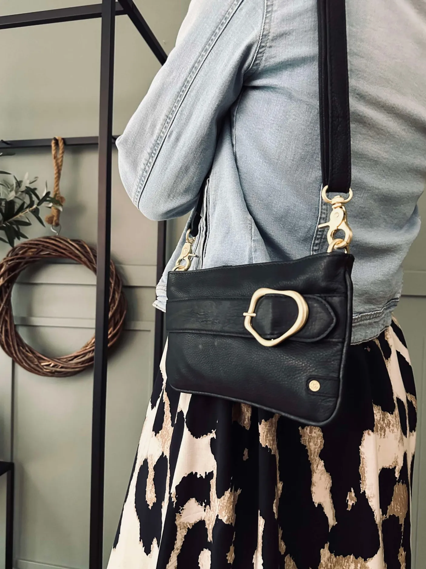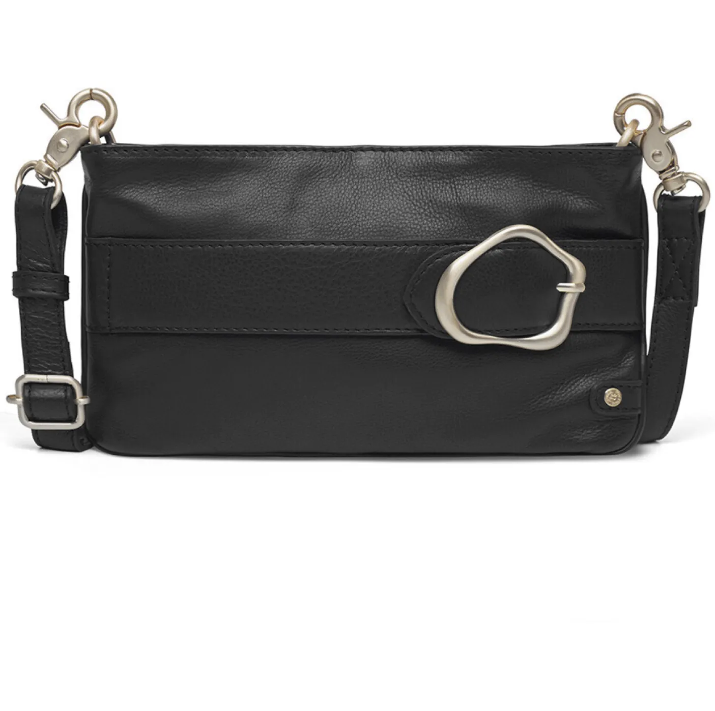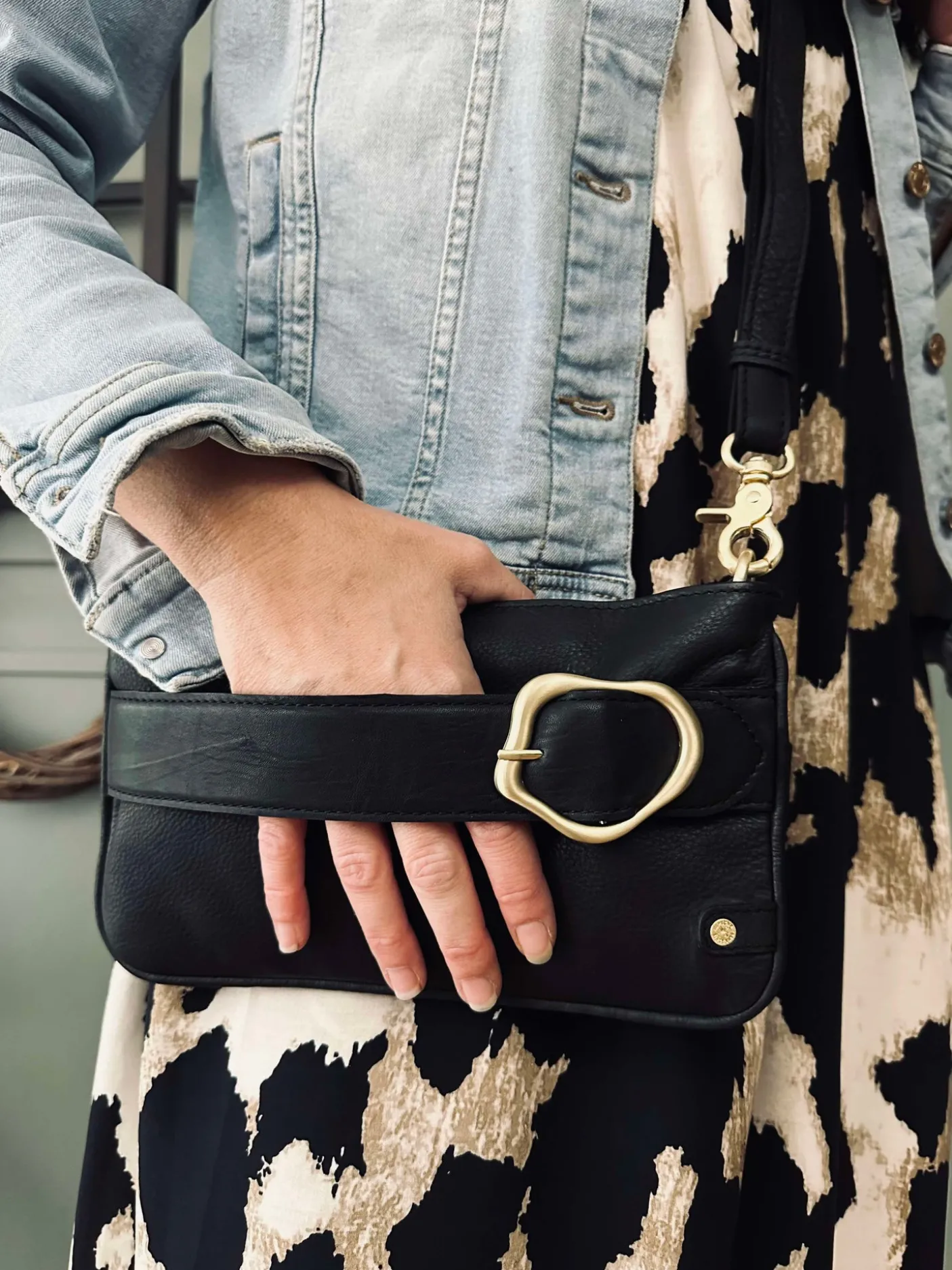 Clutchen kommer med en lang, aftagelig og justerbar crossbody-rem, der giver komfortable bæremuligheder.