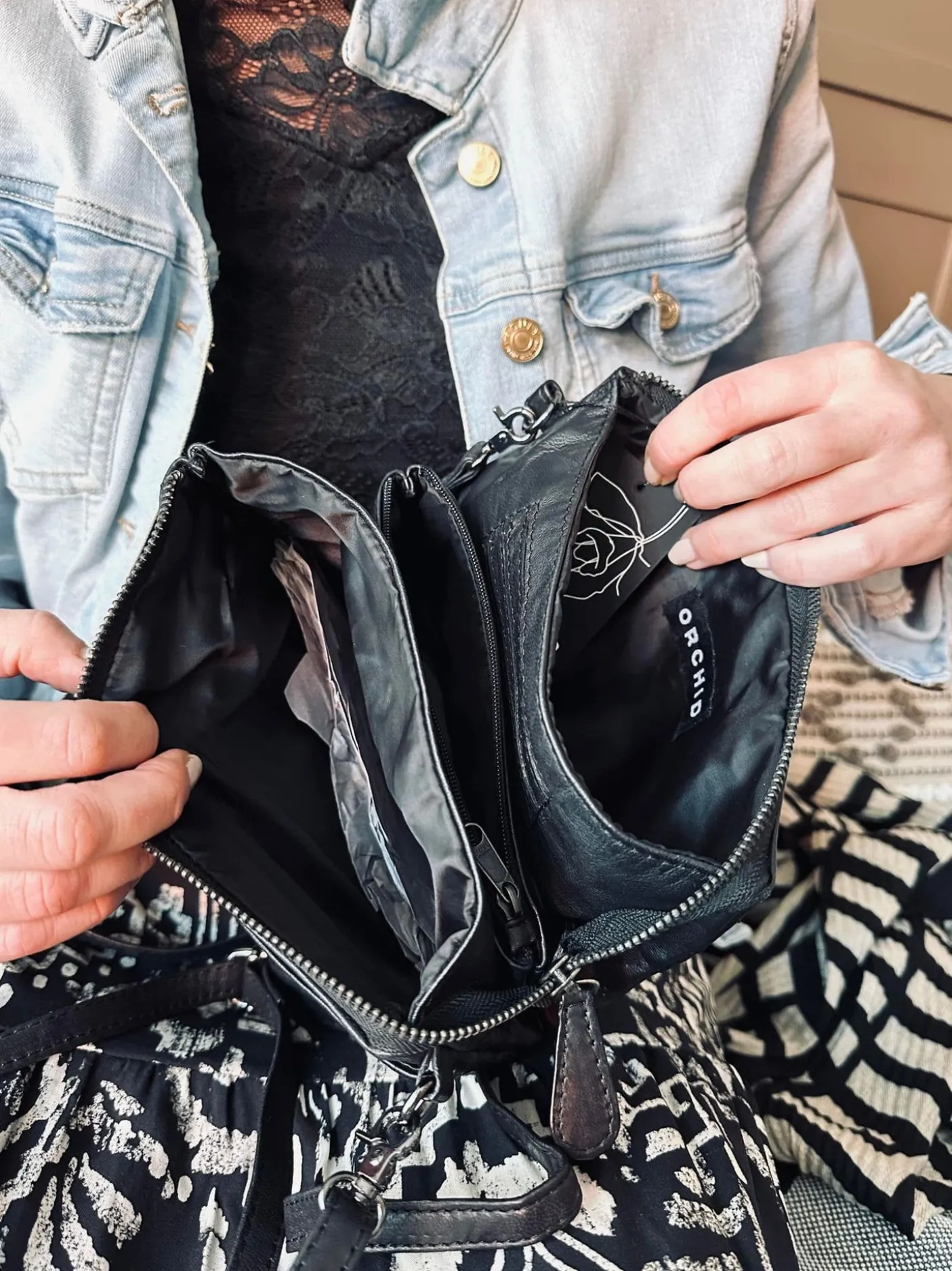 Crossbody clutch i den lækreste kvalitet af 100% lammeskind. Tasken har et rum med lynlåslukning foroven, som er opdelt i 2 lige store rum i hver side og en mindre lynlåslomme i midten, hvorved der også er 6 kortholdere. Derudover har tasken et rum på fronten og en lomme på bagsiden, som begge lukkes med lynlås. Har justerbar og aftagelig skulderrem, så tasken også kan bruges som en clutch.
