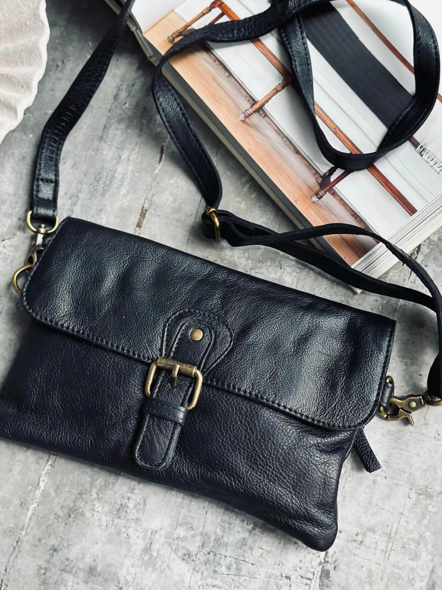 Vores elegante Jodi Clutch er udstyret med et åbent hovedrum, der er tilgængeligt via en knaplukning med en smuk spændedetalje.