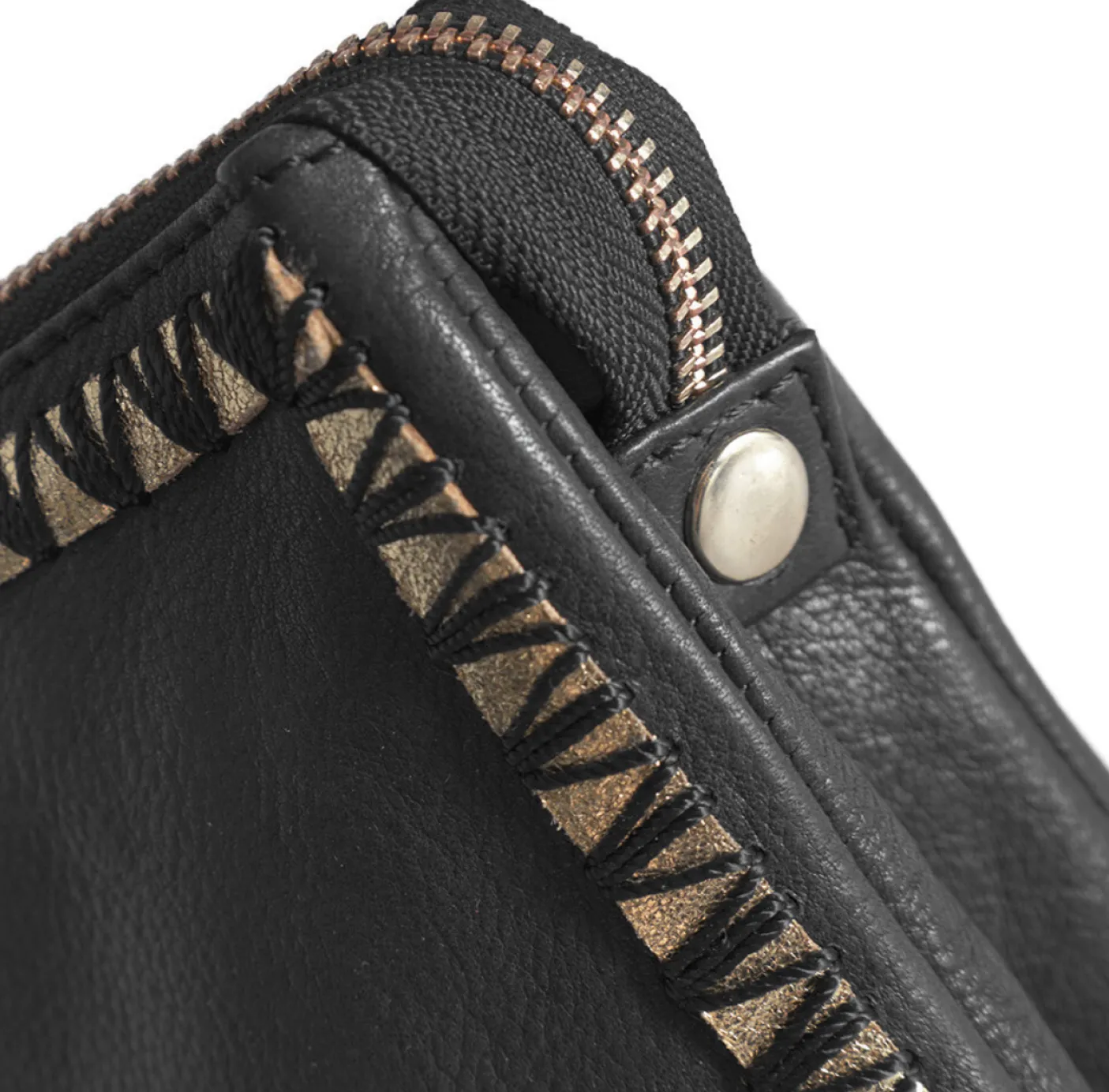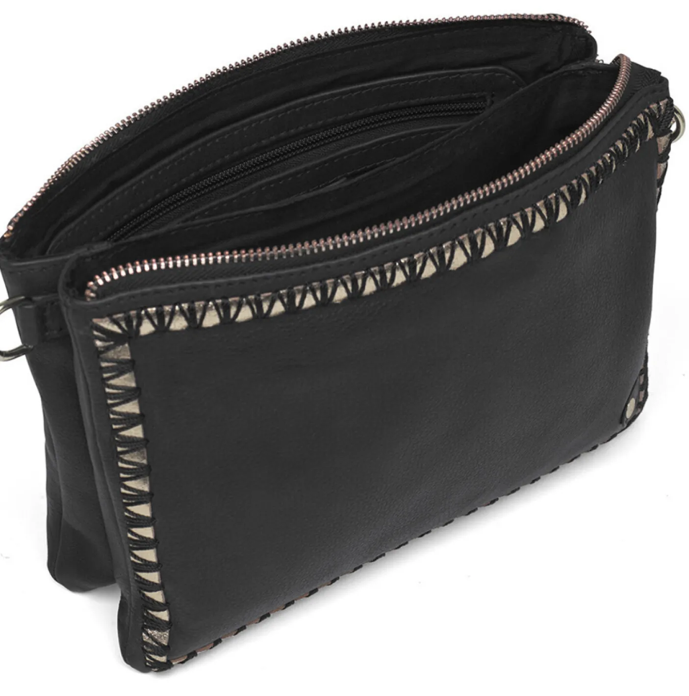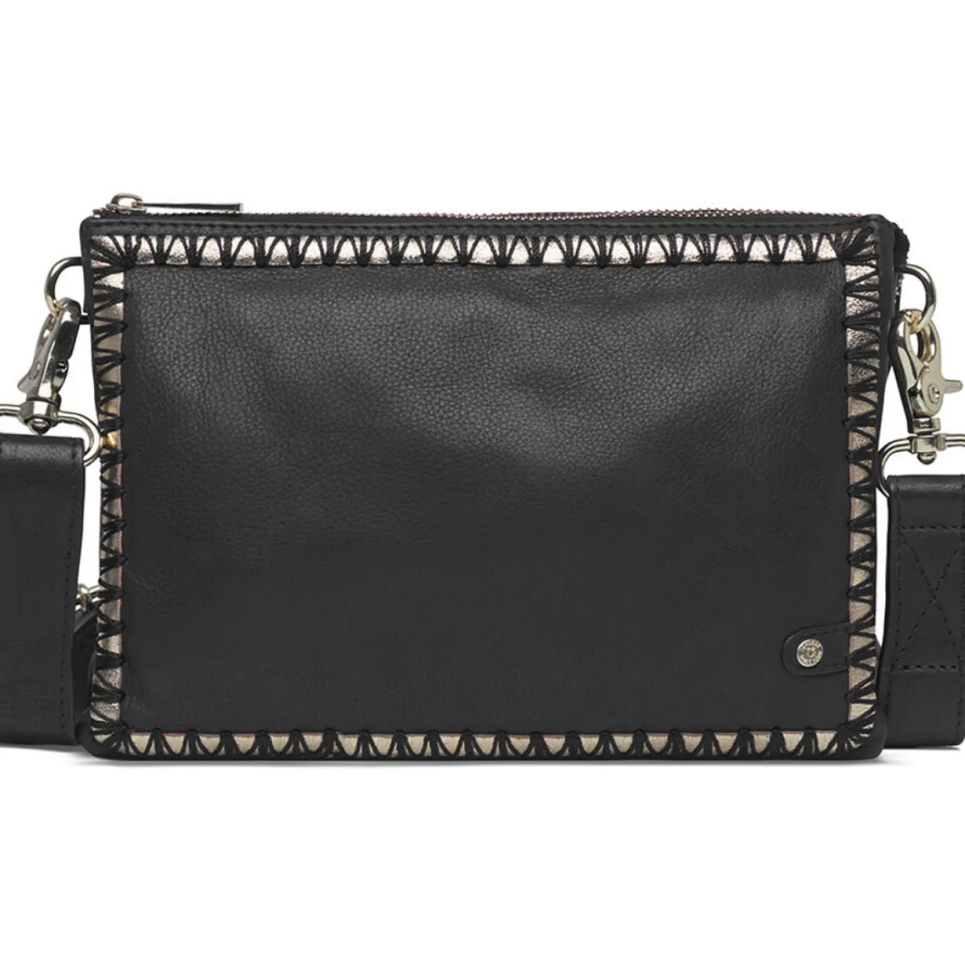 Forkæl dig selv med vores eksklusive clutch/crossover-taske, lavet af luksuriøst og blødt læder af høj kvalitet. Udsmykket med smukke broderier i en kombination af guldfarvet læder og sorte syninger, hvilket giver den et feminint og sofistikeret look. Denne elegant designede taske lukkes nemt med en lynlås i toppen.