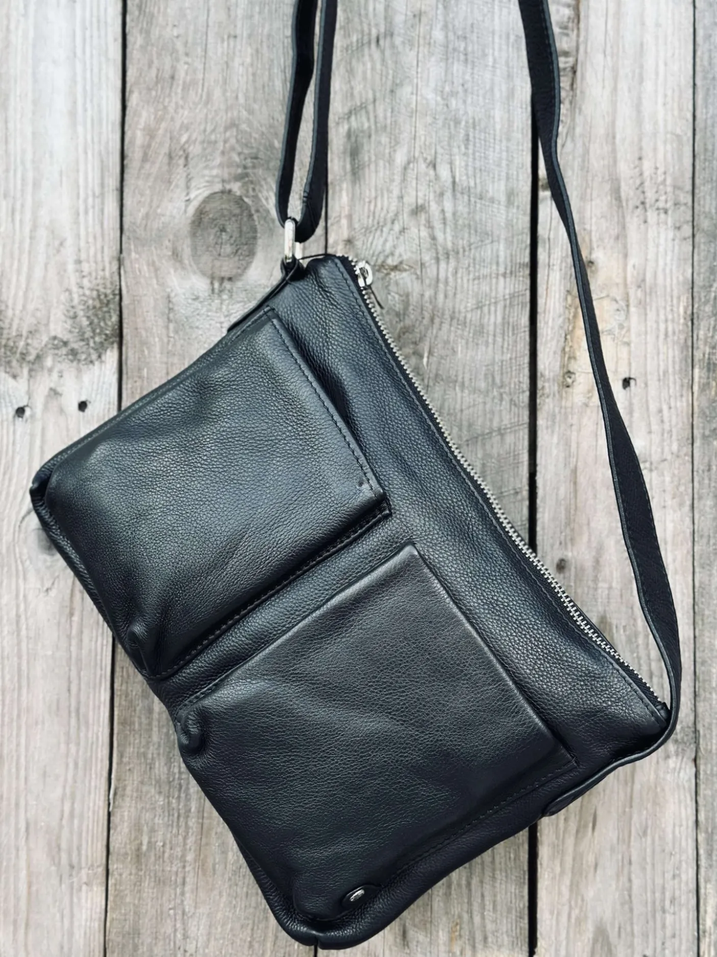 Forsiden af tasken er dekoreret med to funktionelle lynlåslommer, der tilføjer både praktisk brug og charme. Den leveres med en lang justerbar crossbody-rem, der giver bekvem bærekomfort og giver dig mulighed for nemt at bære den over skulderen eller over brystet.