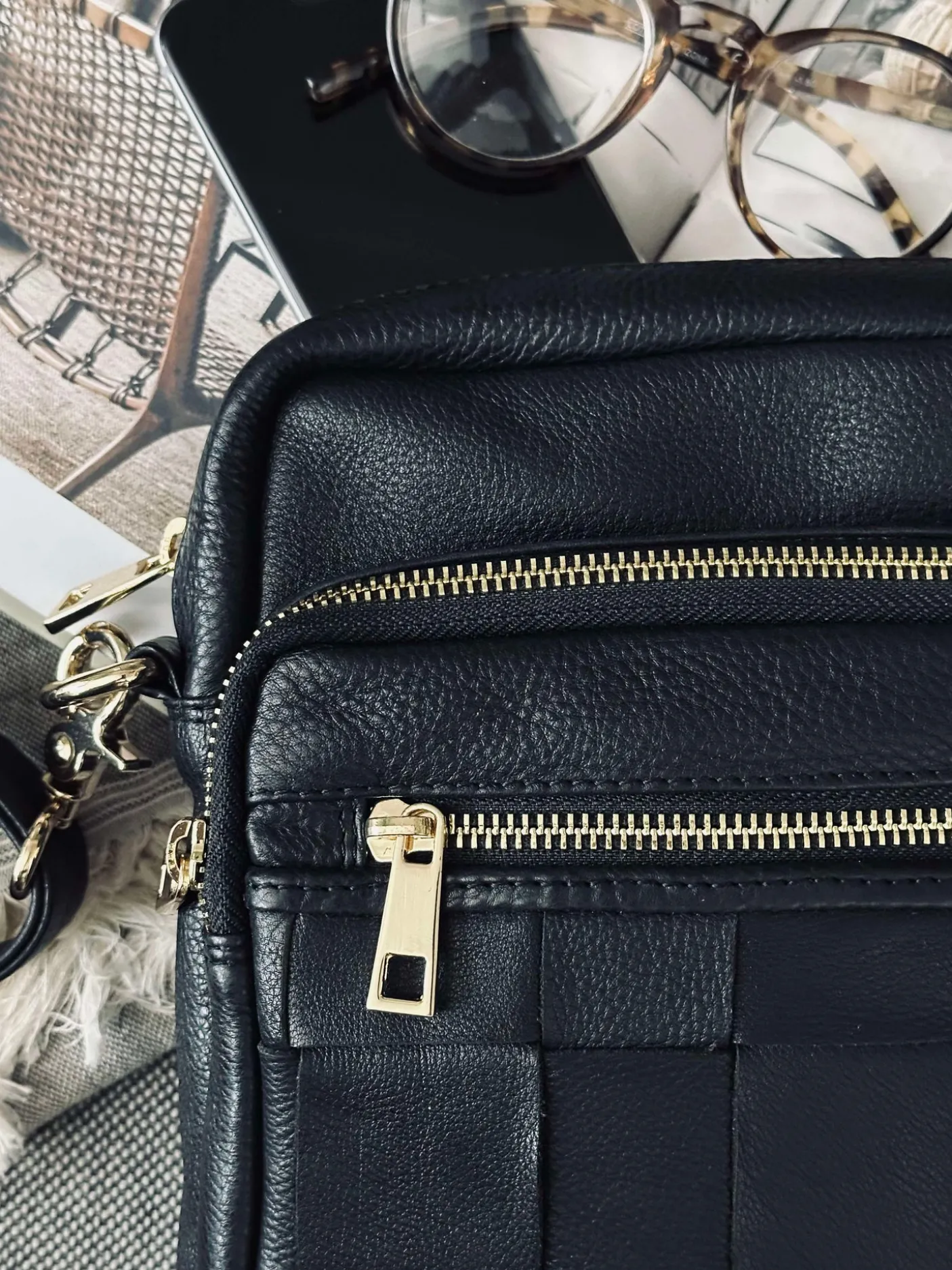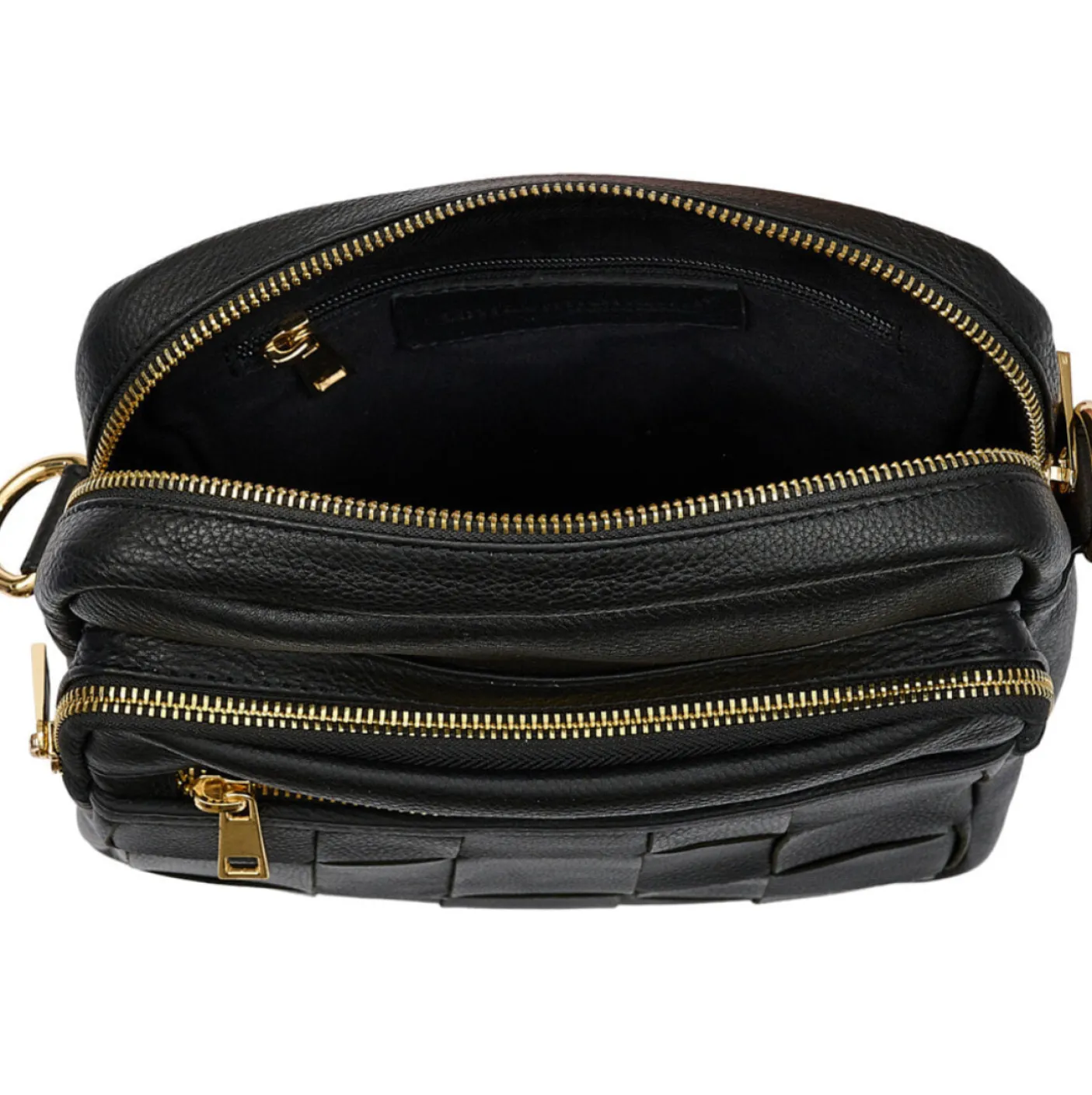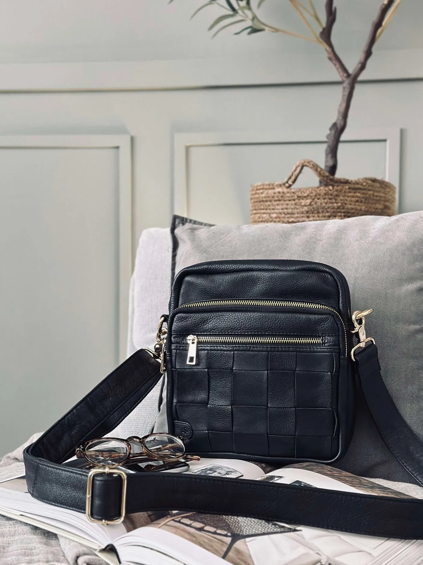 Firkantet crossover flettet lædertaske med 2 frontlommer.