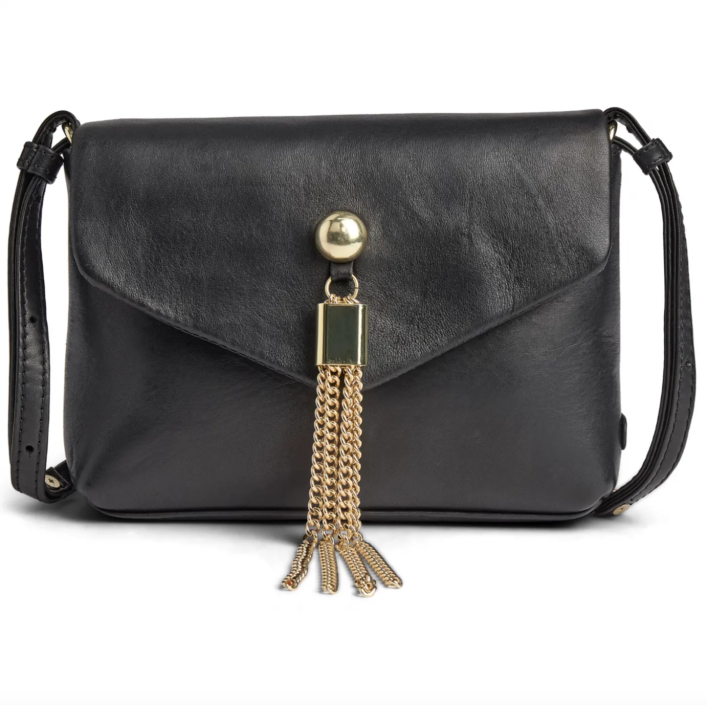 En taske, der kombinerer funktionalitet, eksklusivitet og feminine detaljer – og som uden tvivl vil løfte ethvert outfit. V-formet flap med magnetisk skjult knap. Dekoreret med guldfarvet kædedetalje og frontnitte. Indvendig lynlåslomme og åben mobillomme. Lang justerbar og aftagelig crossbody rem medfølger. Anbefales at imprægnere tasken inden brug.