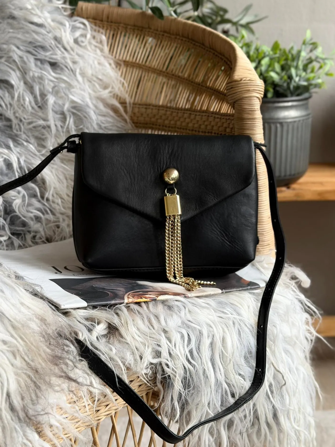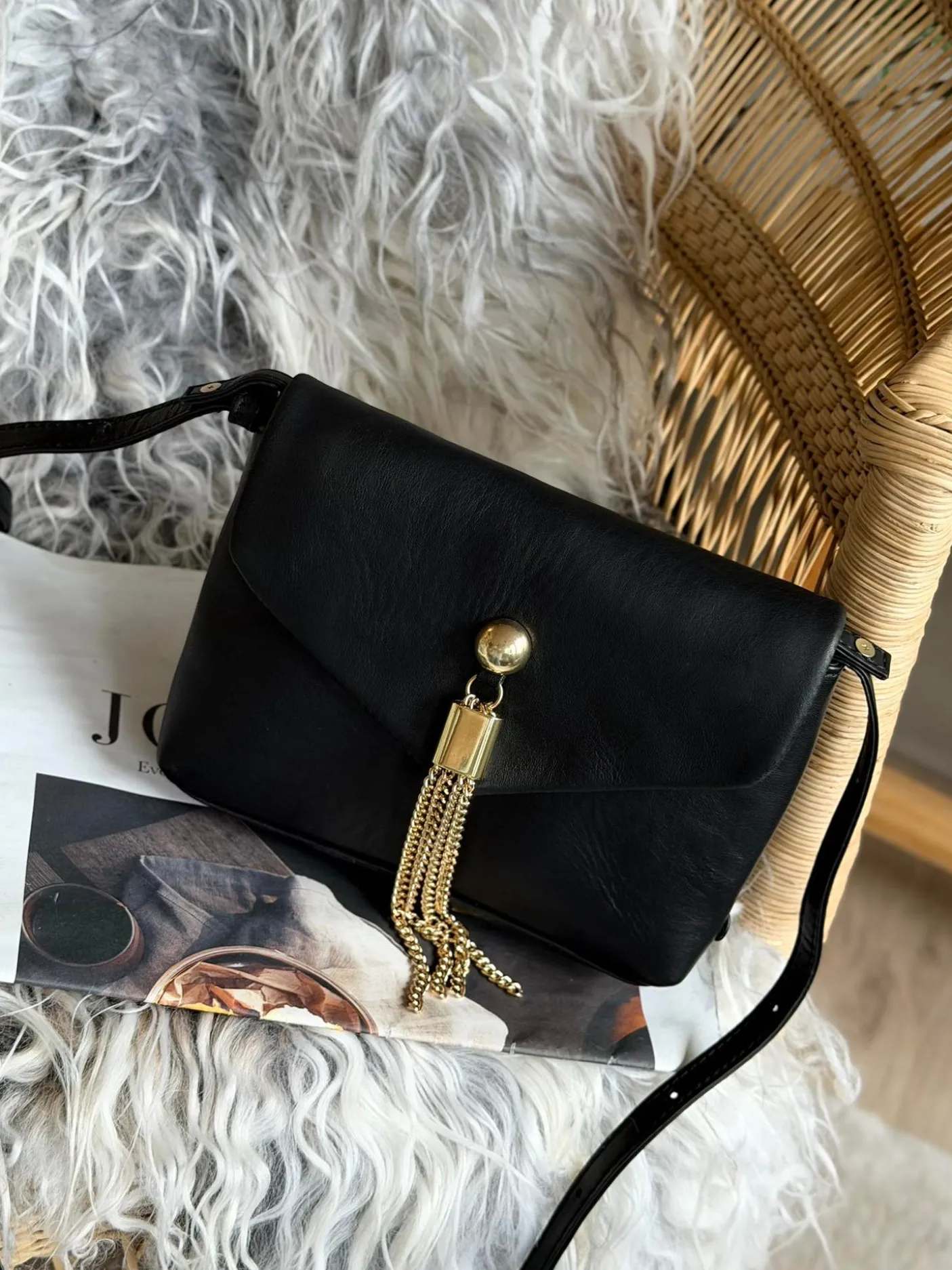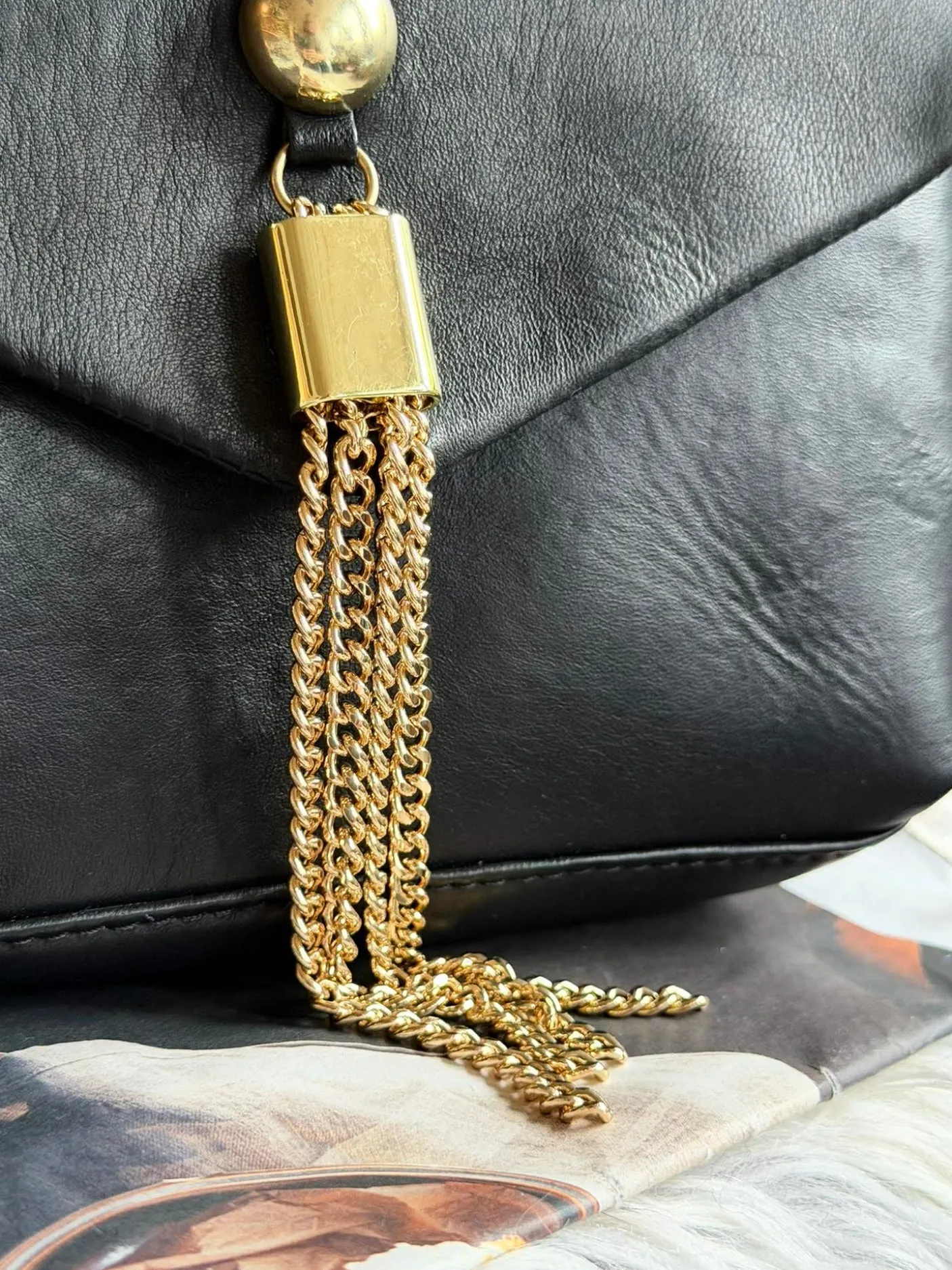 Den er fremstillet i 100% lammeskind, som giver et eksklusivt og luksuriøst udtryk. Fronten er dekoreret med en elegant guldfarvet kædedetalje samt en markant guldfarvet nitte på flappen, hvilket tilføjer et unikt og sofistikeret twist til taskens design.