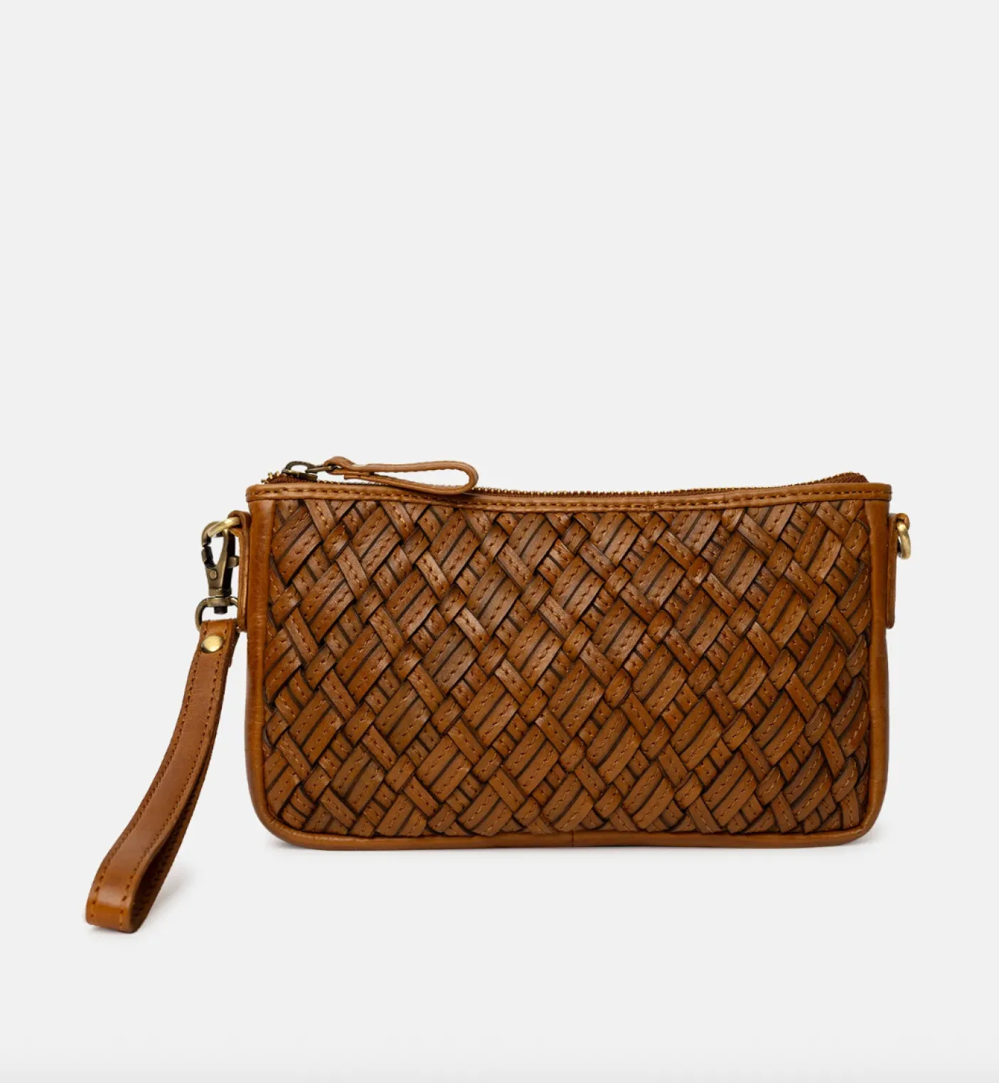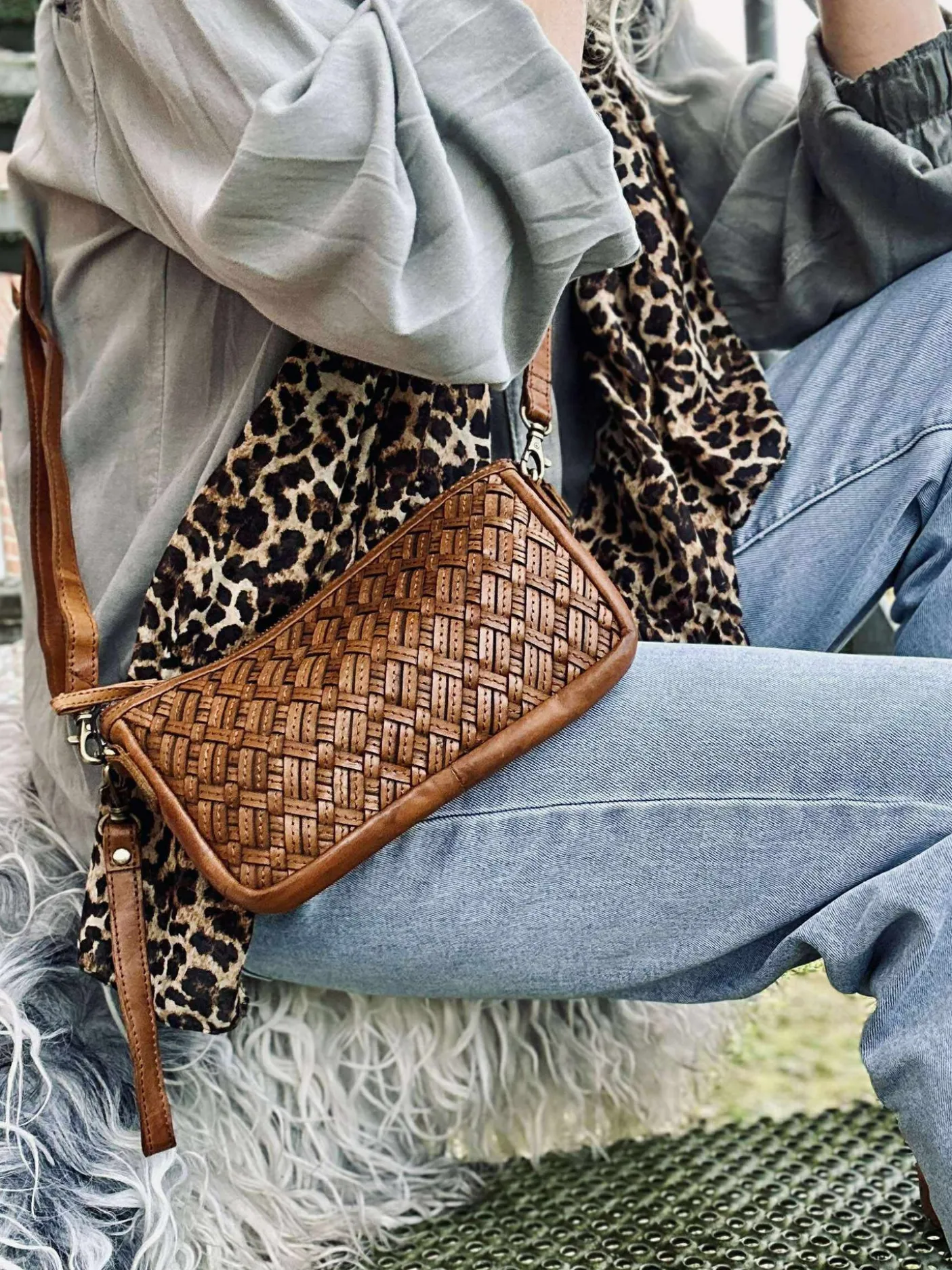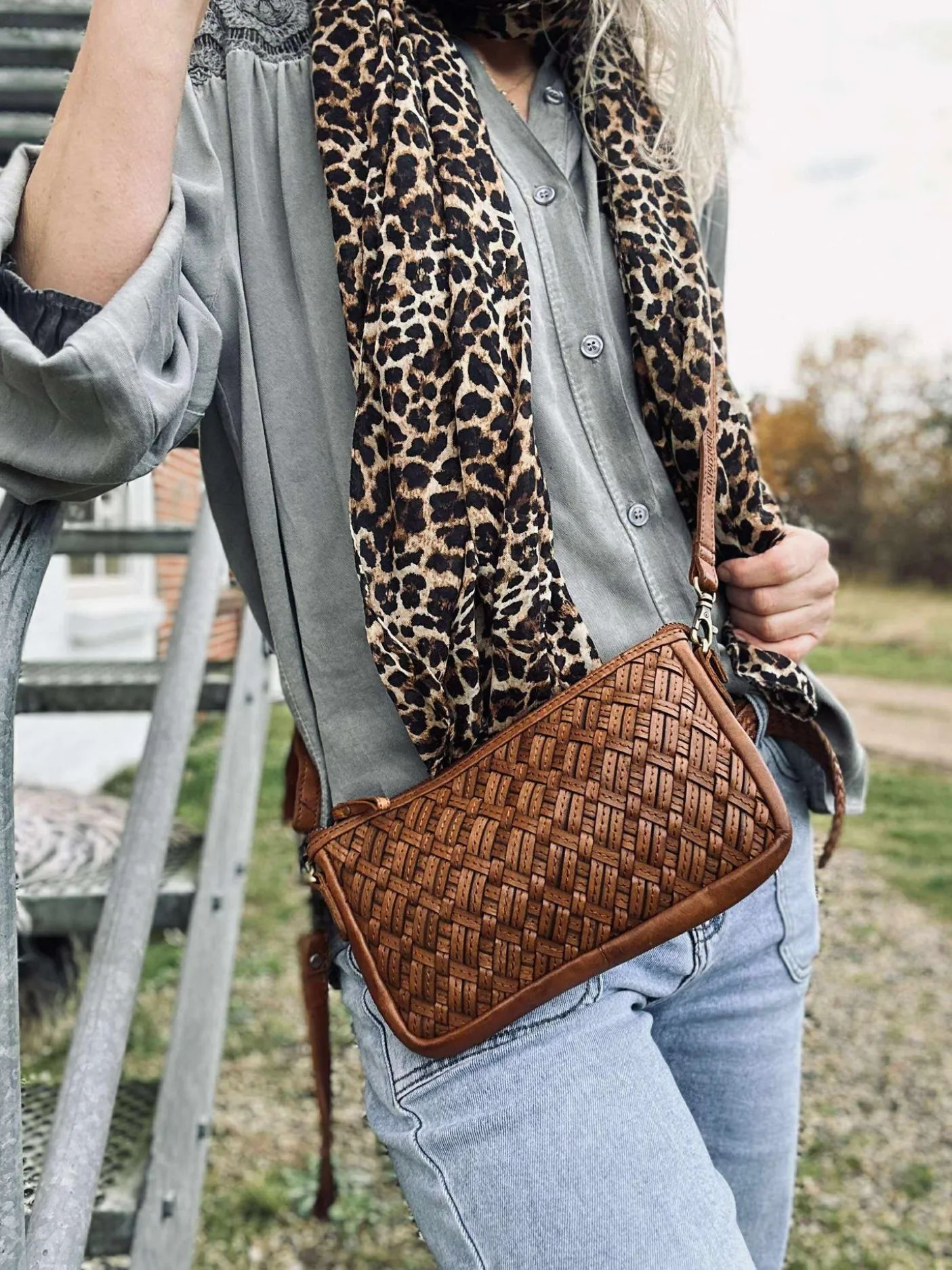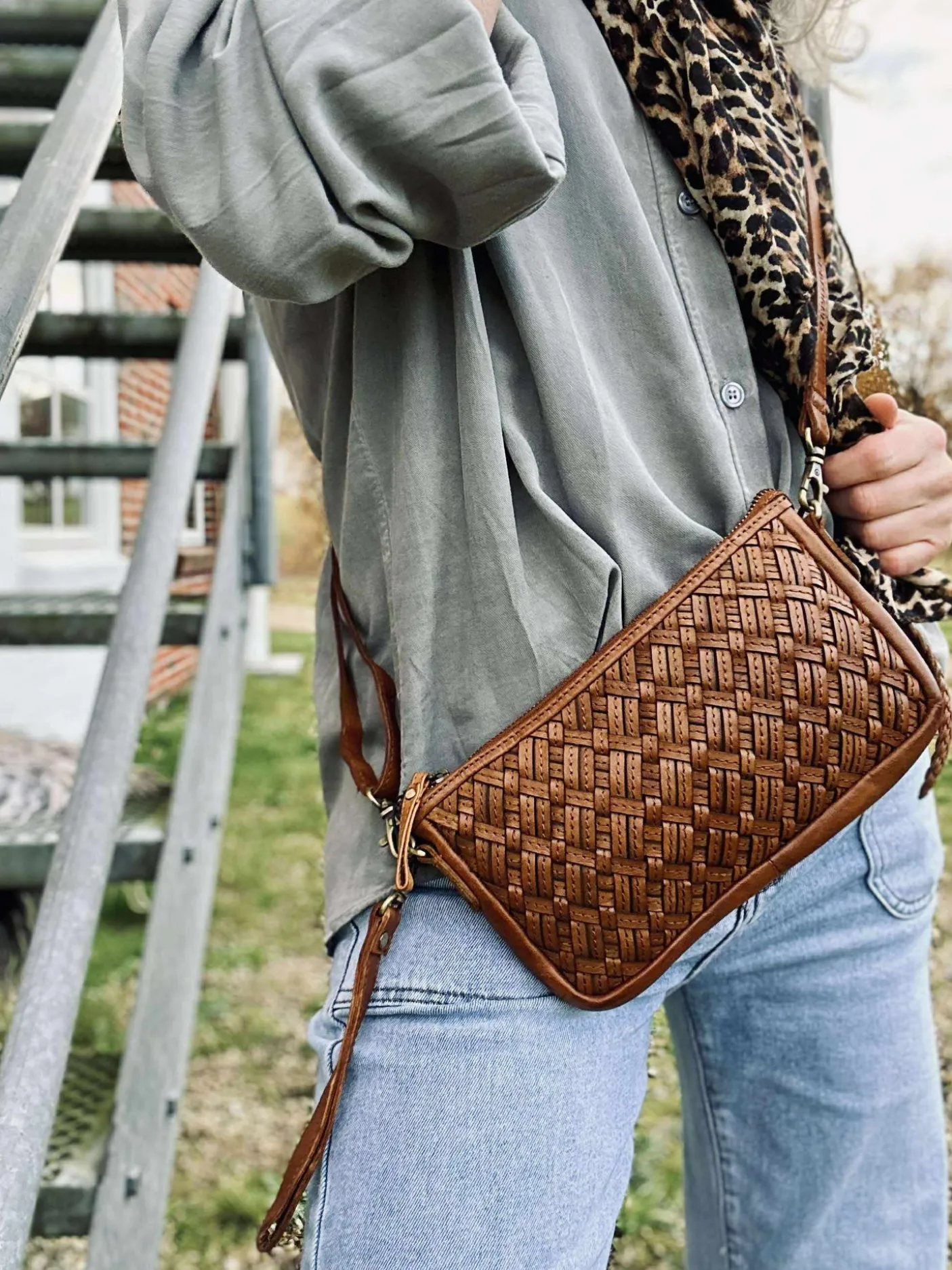 Den har et fantastisk flettet mønster og en lille rem, der gør det muligt at bære den som en elegant clutch. Derudover kommer den med en aftagelig krydsrem for flere bæremuligheder. Indvendigt finder du et lille, men praktisk hovedrum.