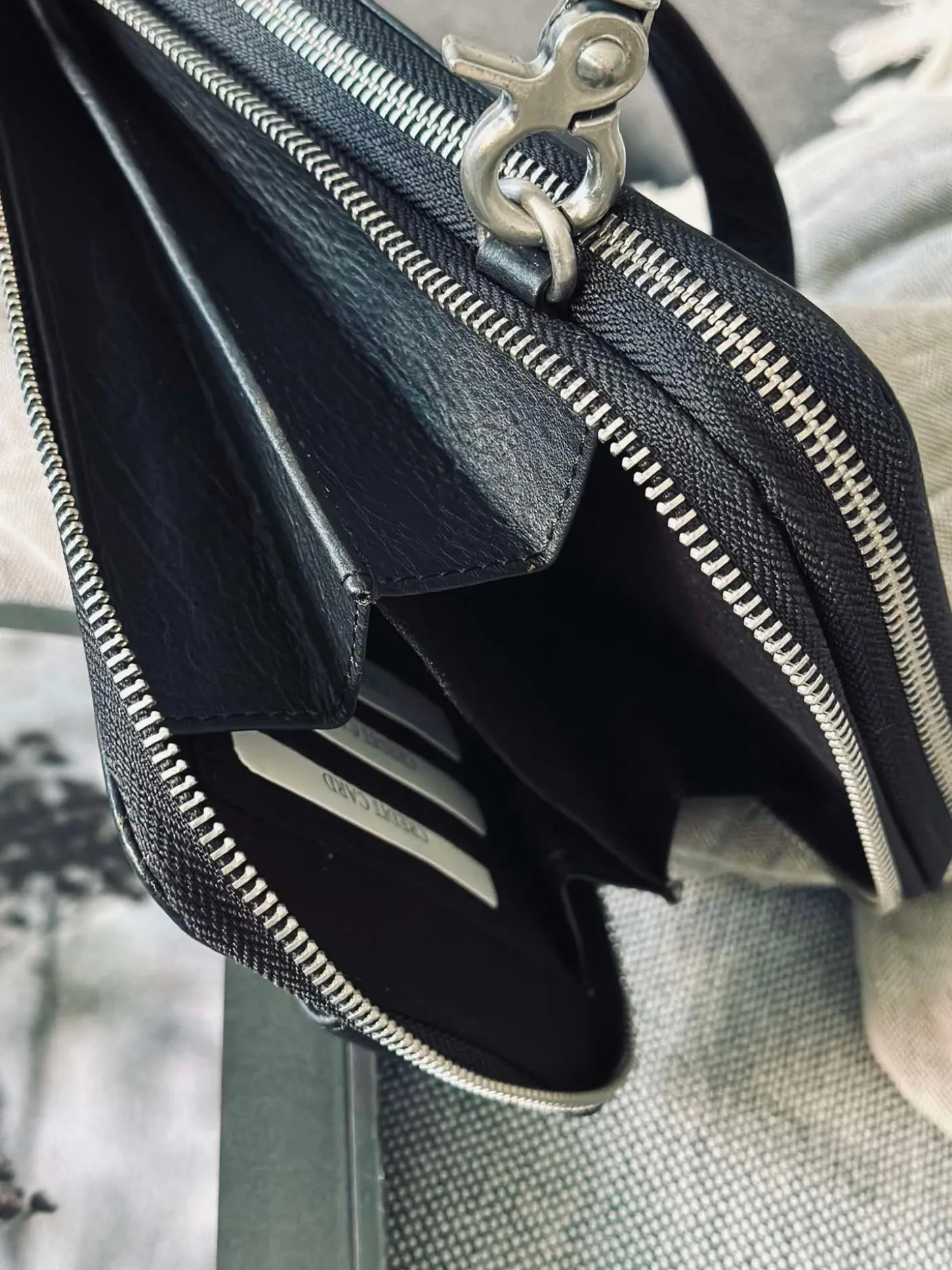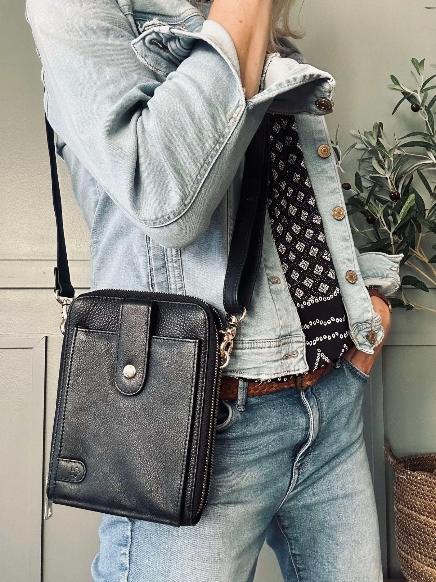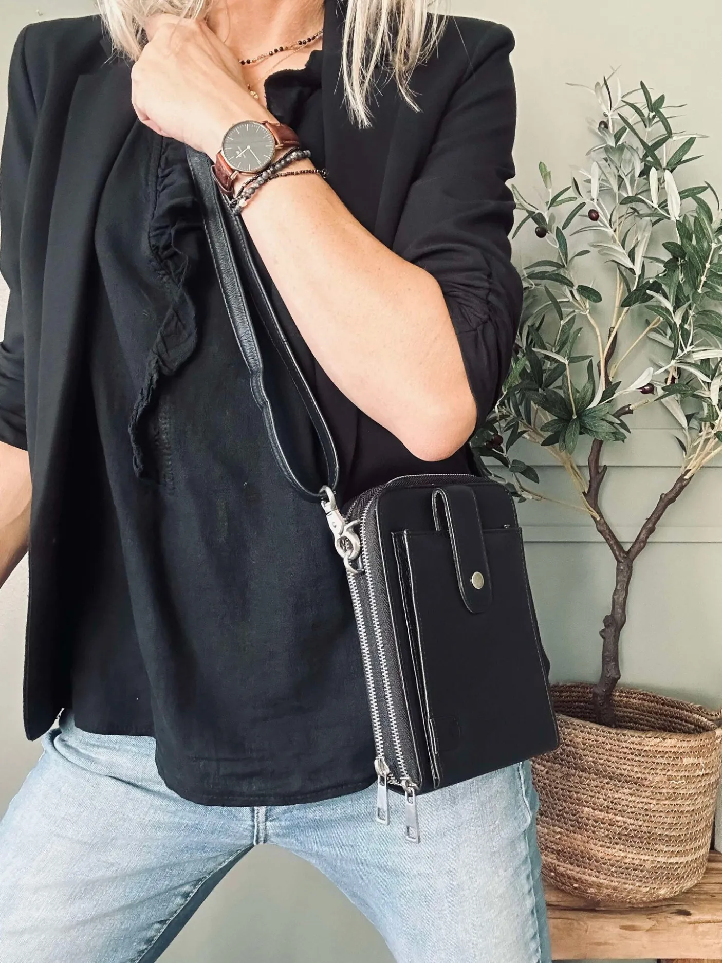 Cross-over multibag i læder med guld lynlås og justerbar rem.