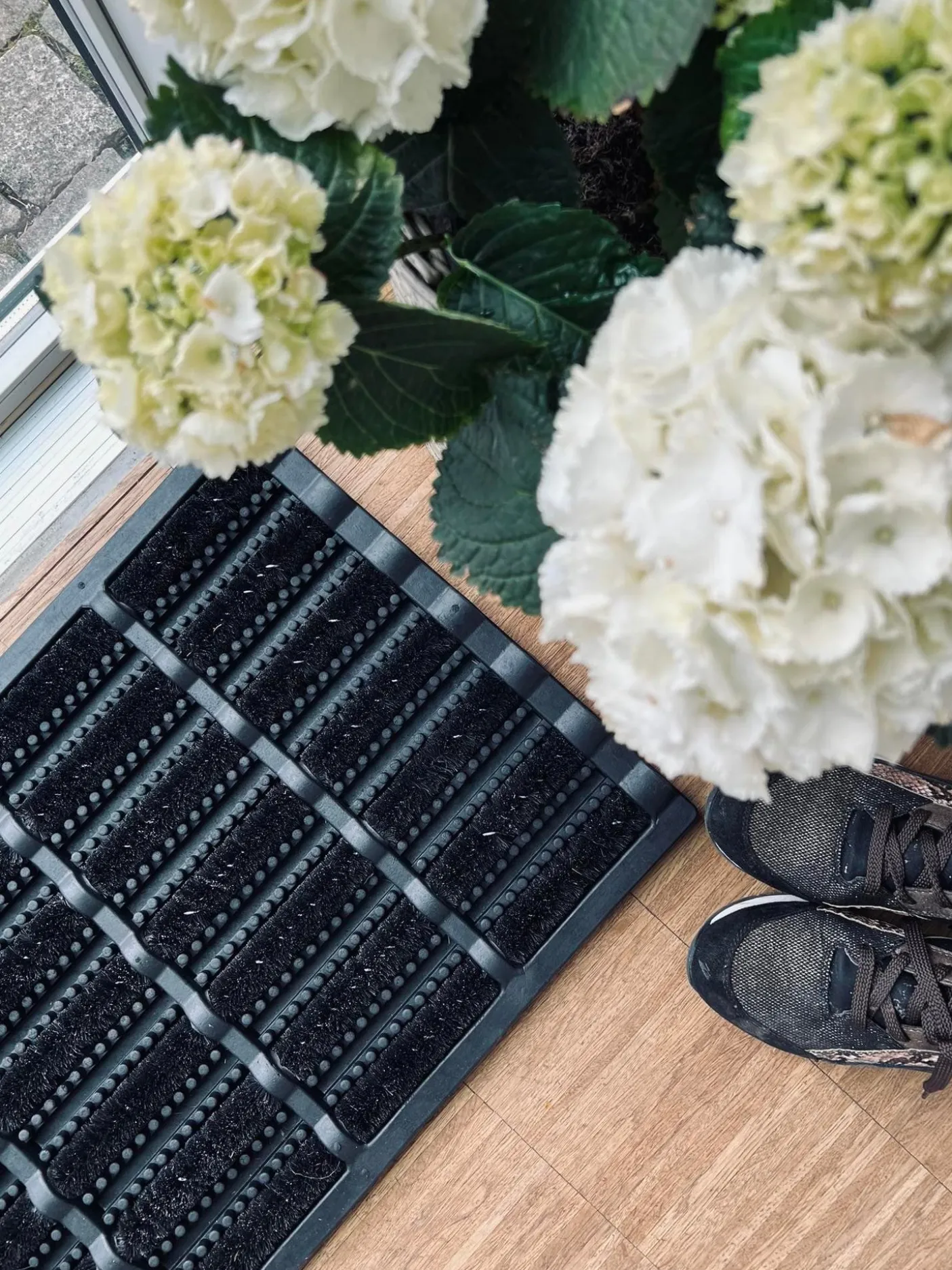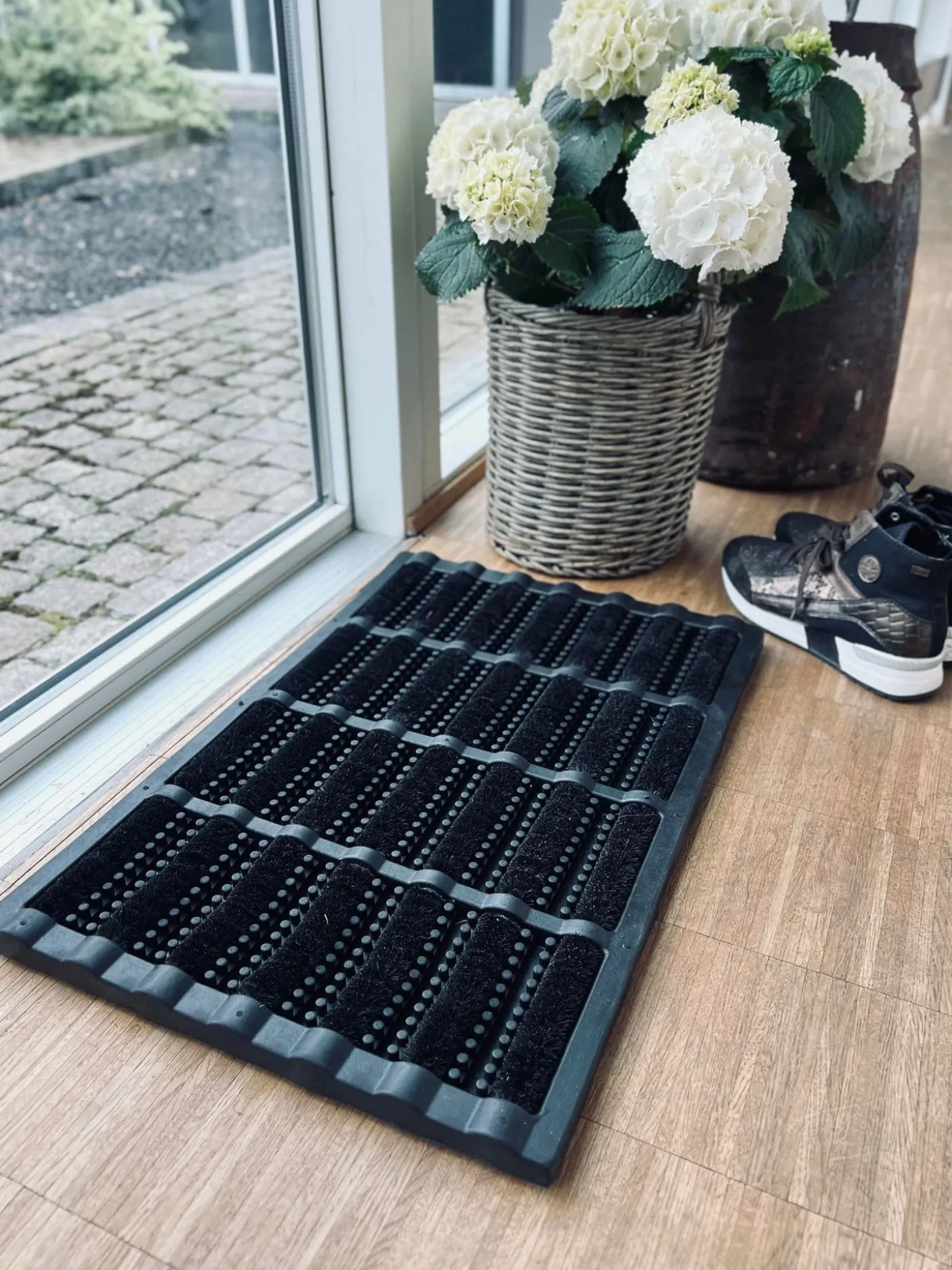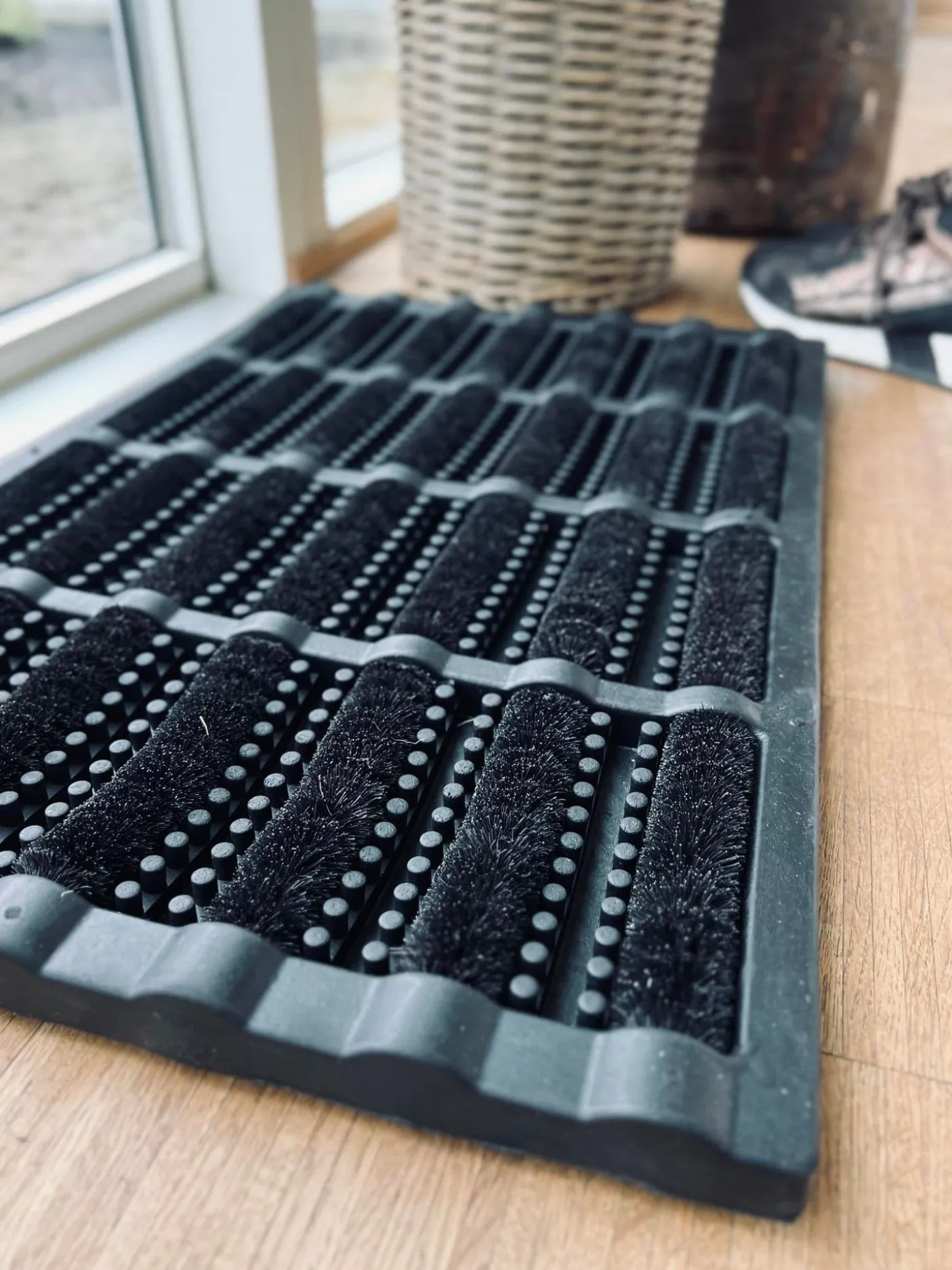 Dørmåtte i sort gummi med børste.