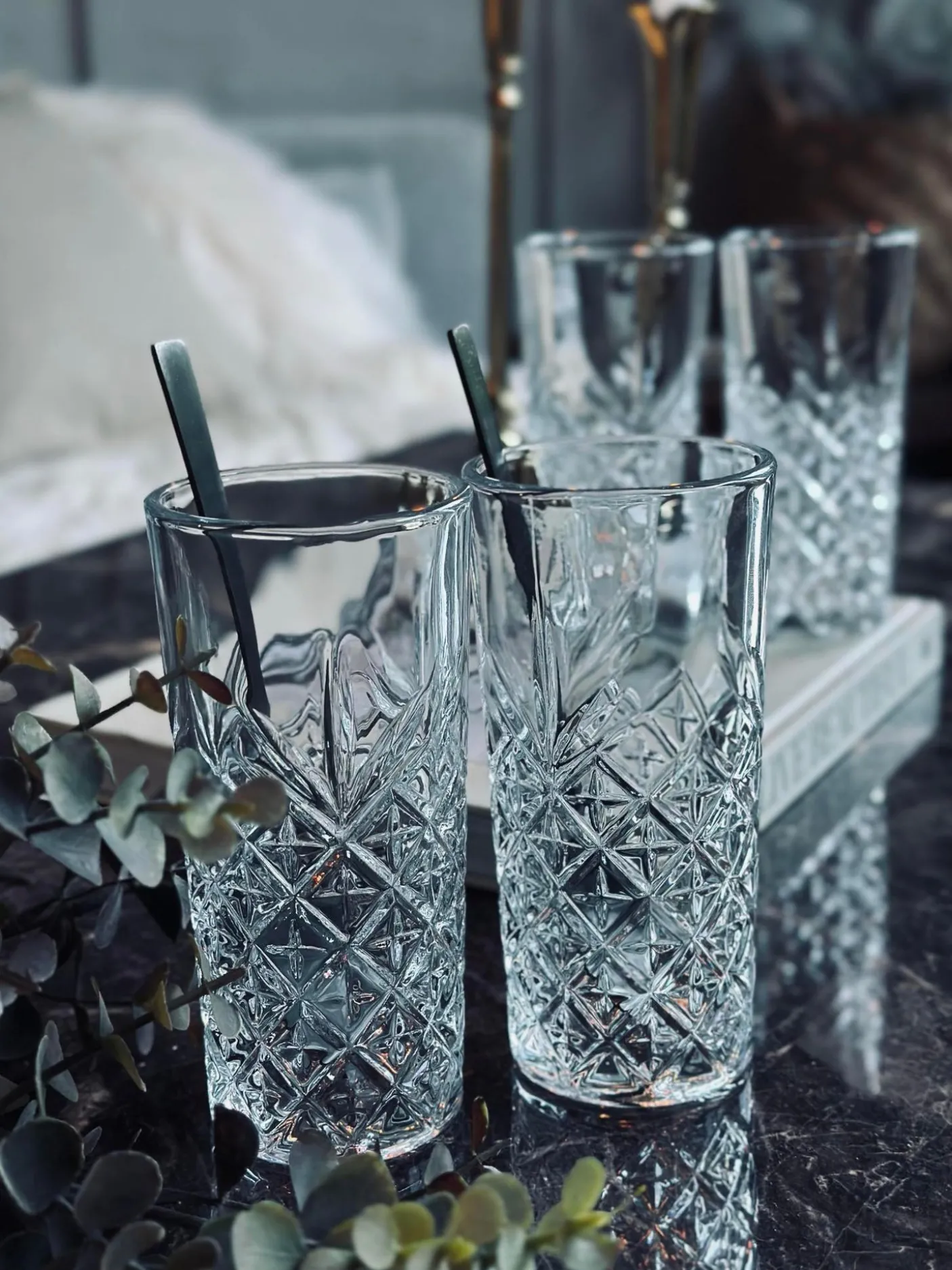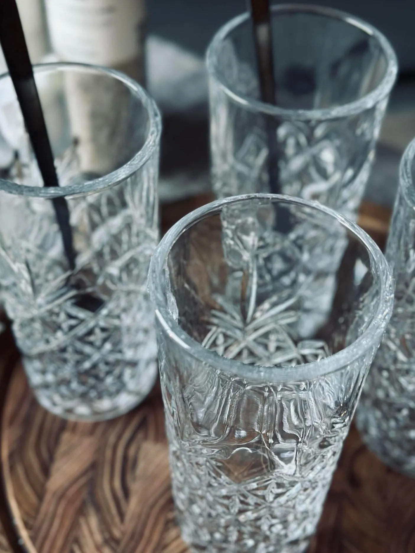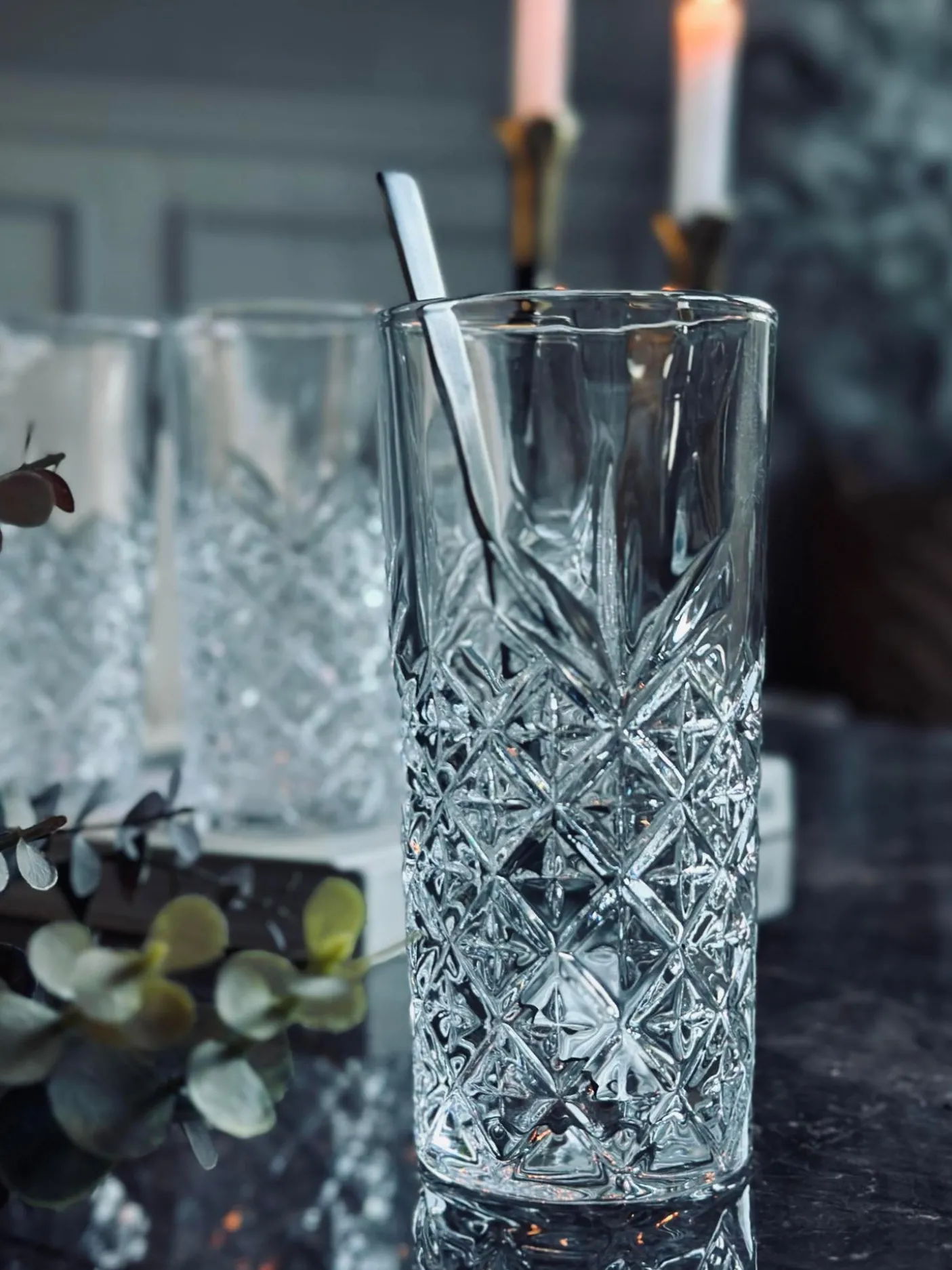 Long drink glas med fine detaljer.