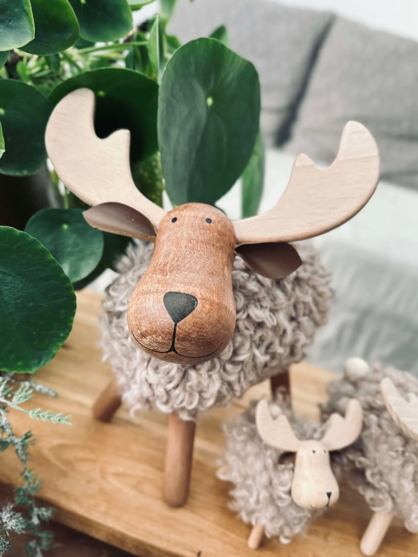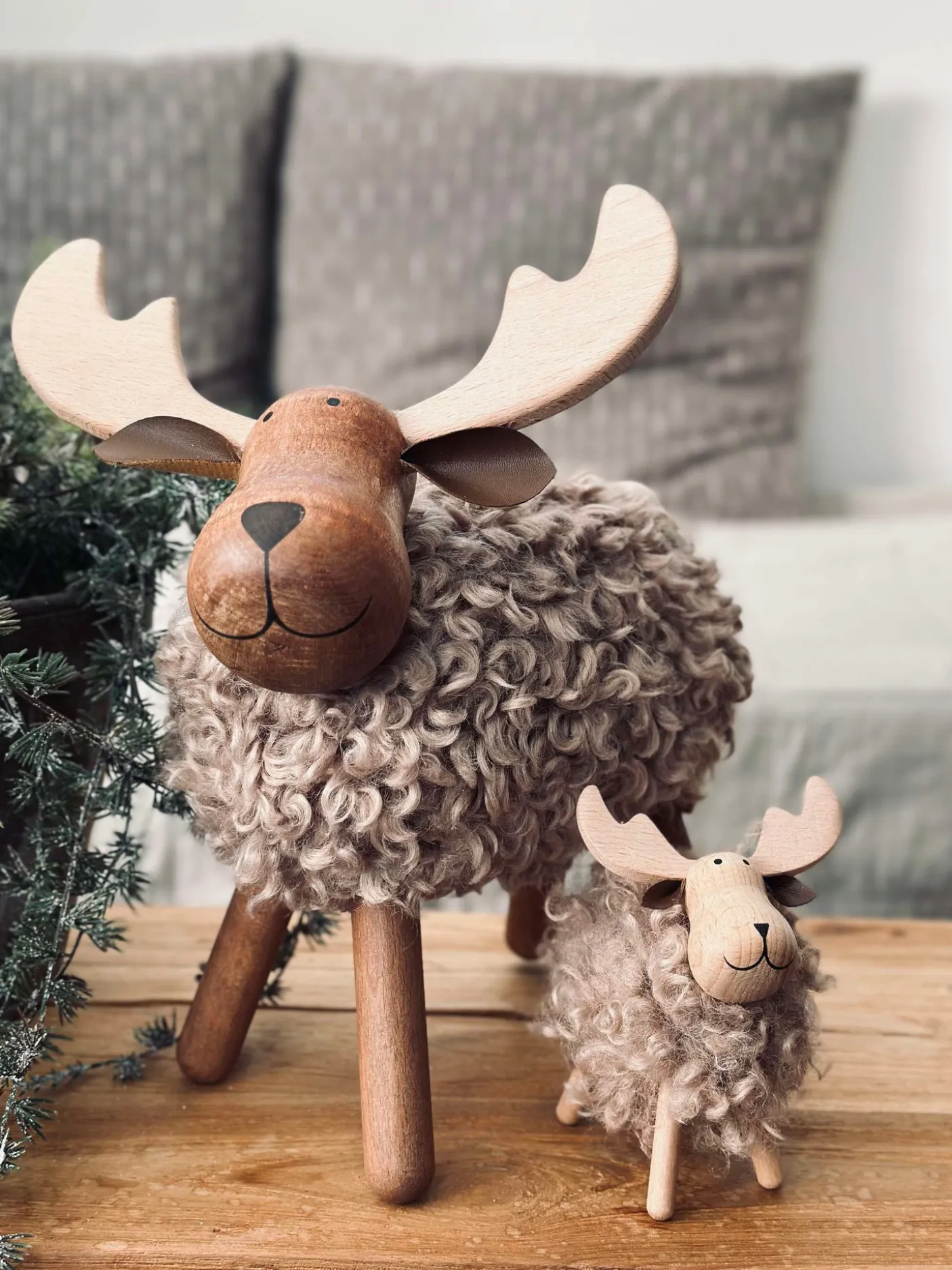 Elg Beige X-Large er en dekorativ elgfigur i massiv bøg med pels. Den fungerer fint som dekoration på bord eller hylde og kan indgå i julens pynt. Mål: 23x13x28,5 cm. Pelsen giver et blødt, tekstureret udtryk, der står i kontrast til træets glatte silhuet.