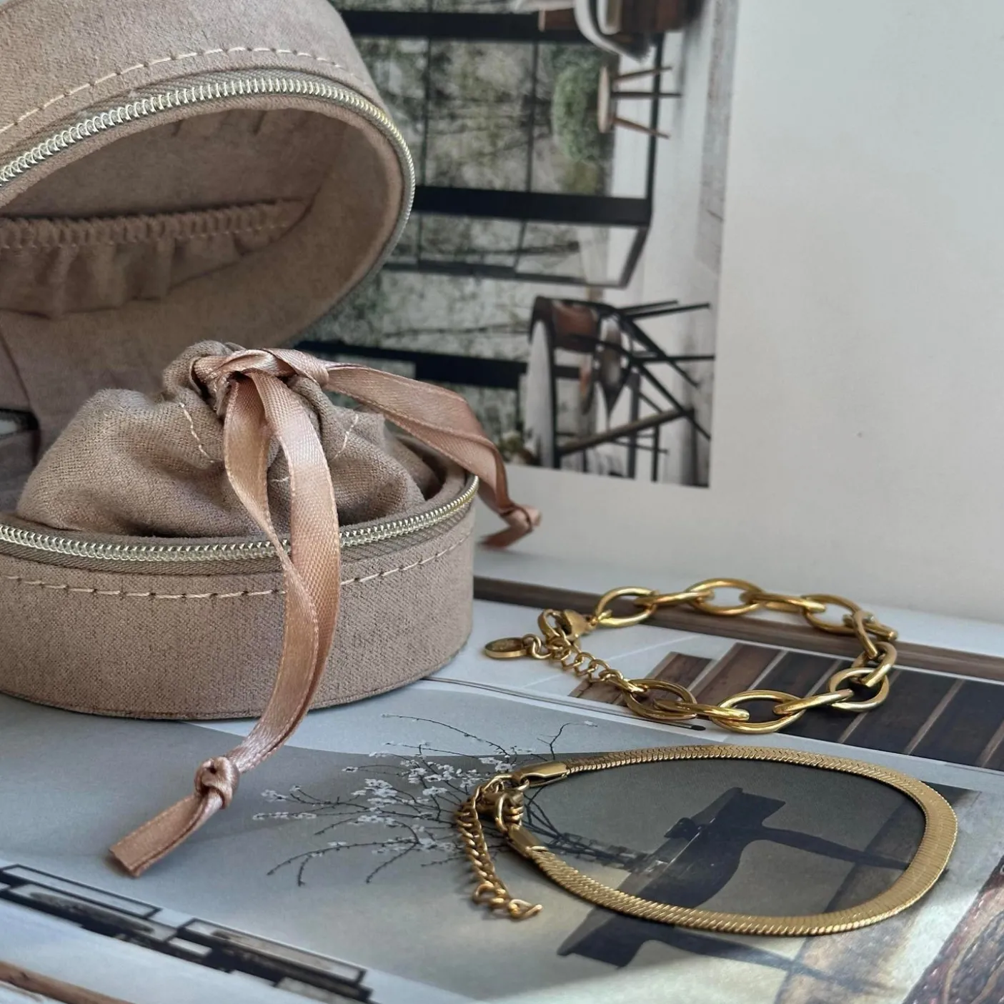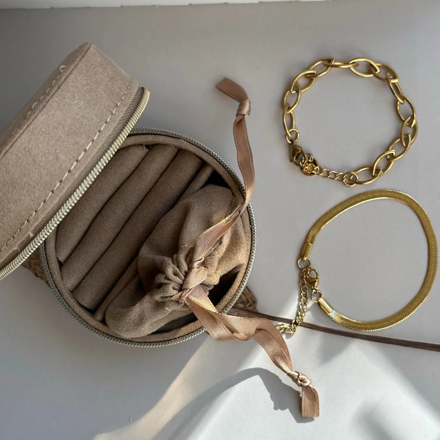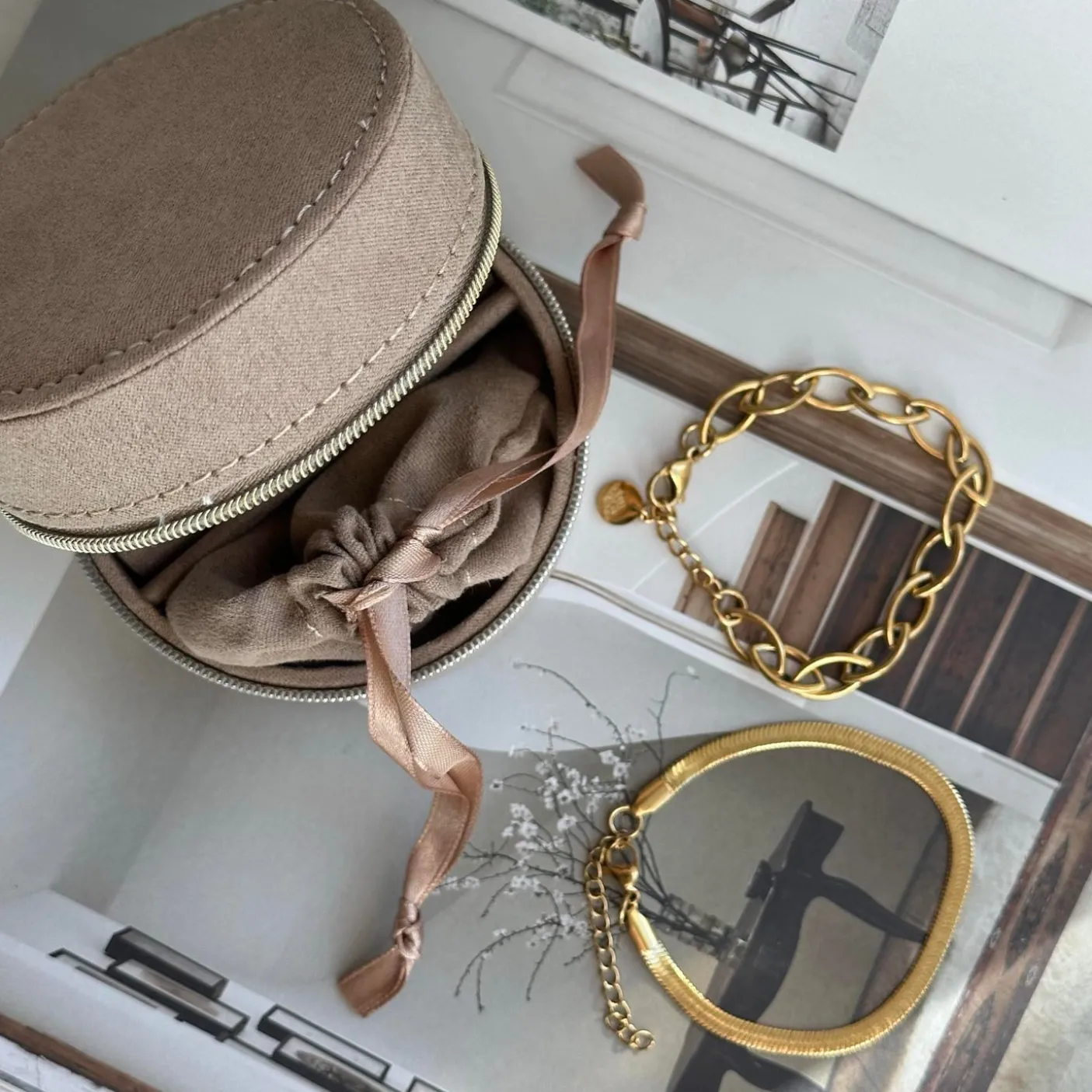 - Et gave-sæt udover det sædvanlige – Du får et smukt rejse-smykkeskrin og du får 2 smukke armbånd og så får du oven i købet en lille overraskelse gemt i den lille pose inde i smykkeskrinet.