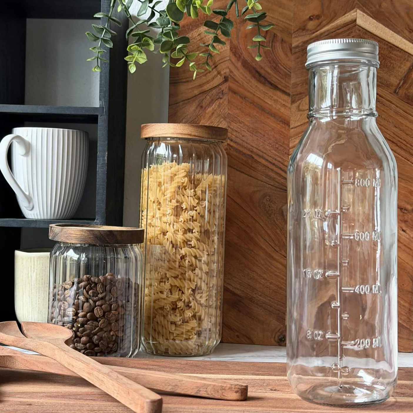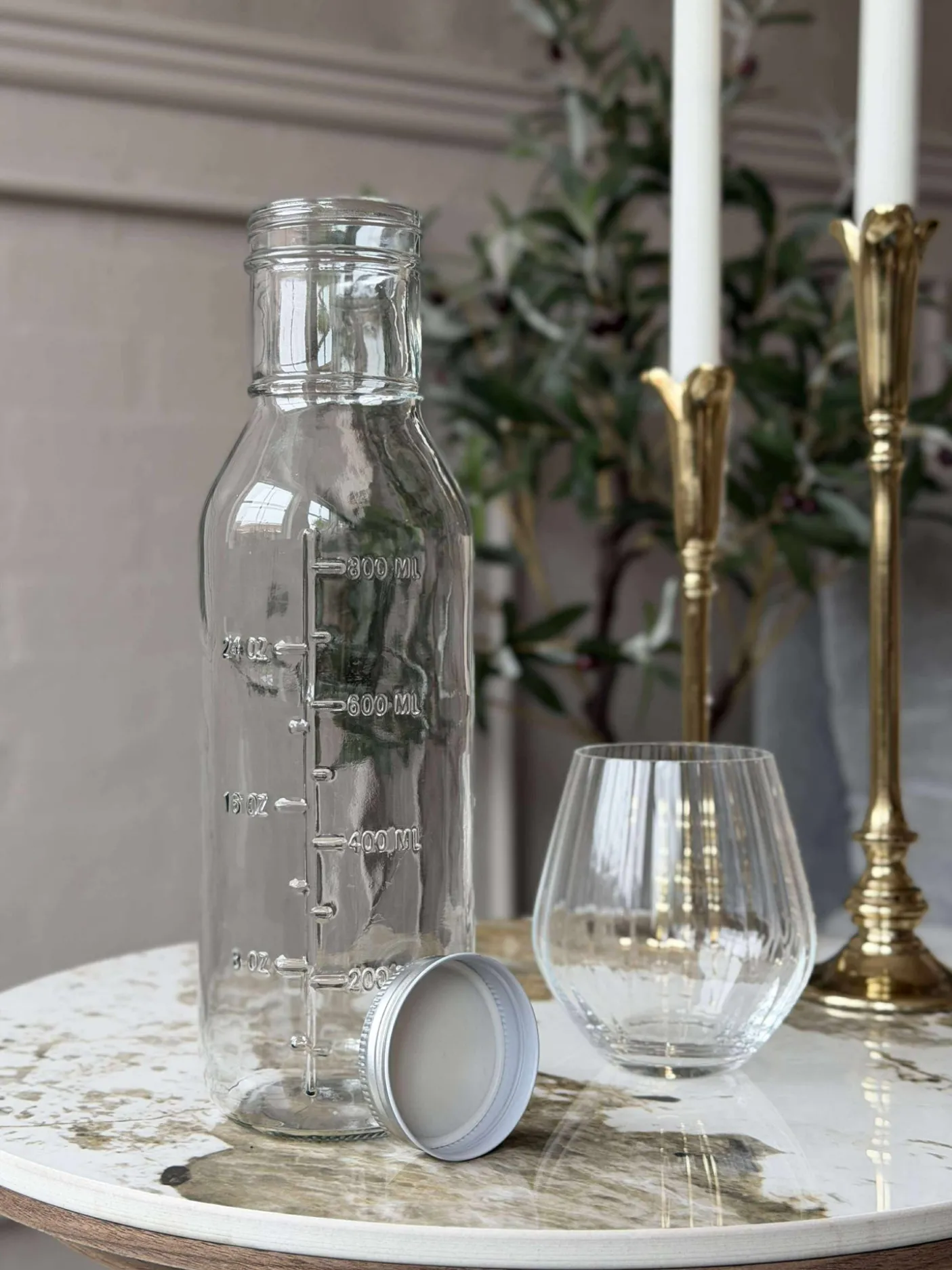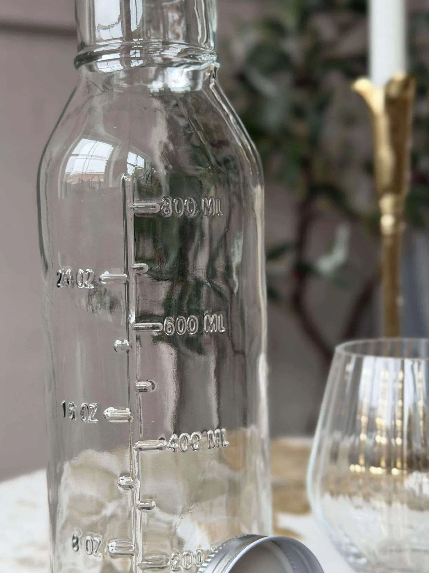 Glasflaske med låg. De praktiske angivelser af måleenheder gør flasken ideel, hvis du gerne vil have styr på, hvor meget der er tilbage i flasken eller hvis du skal mikse dressing eller salatolier.